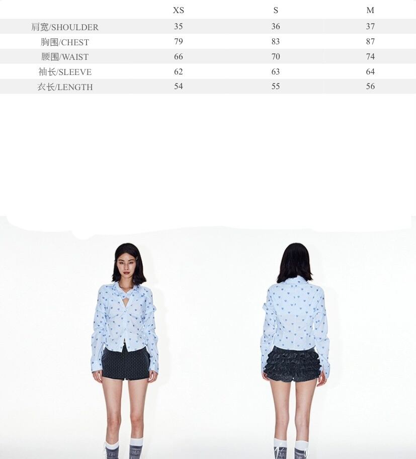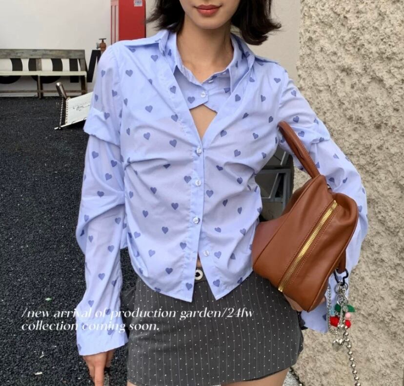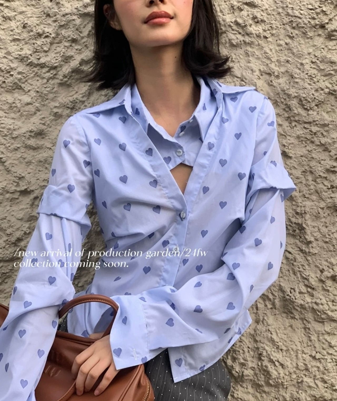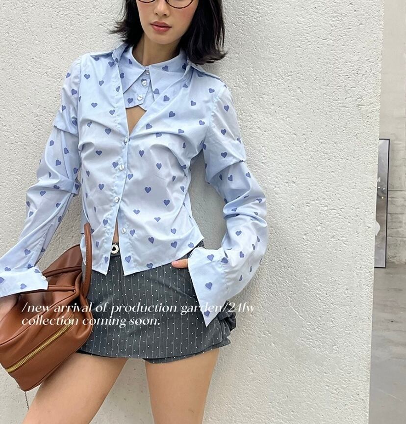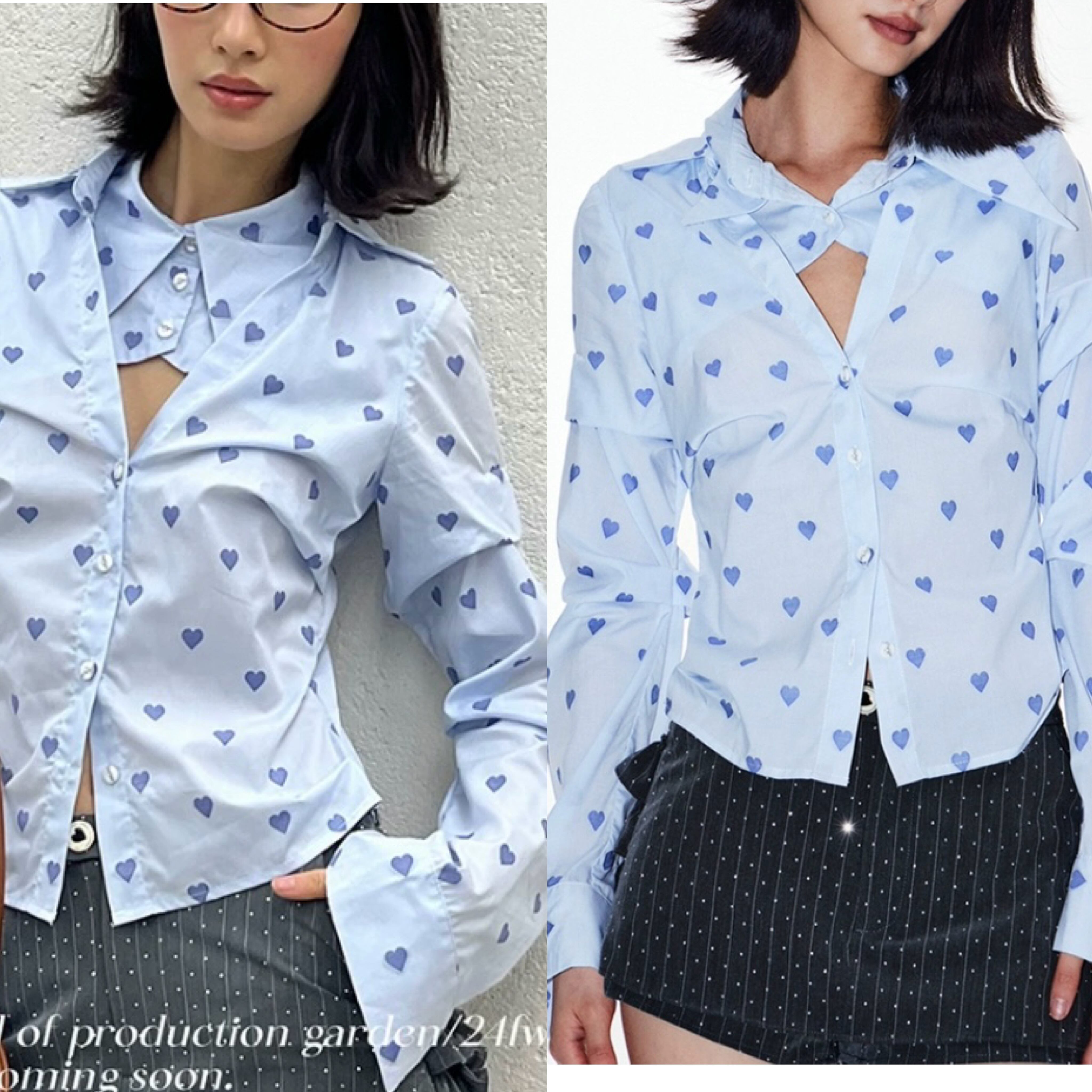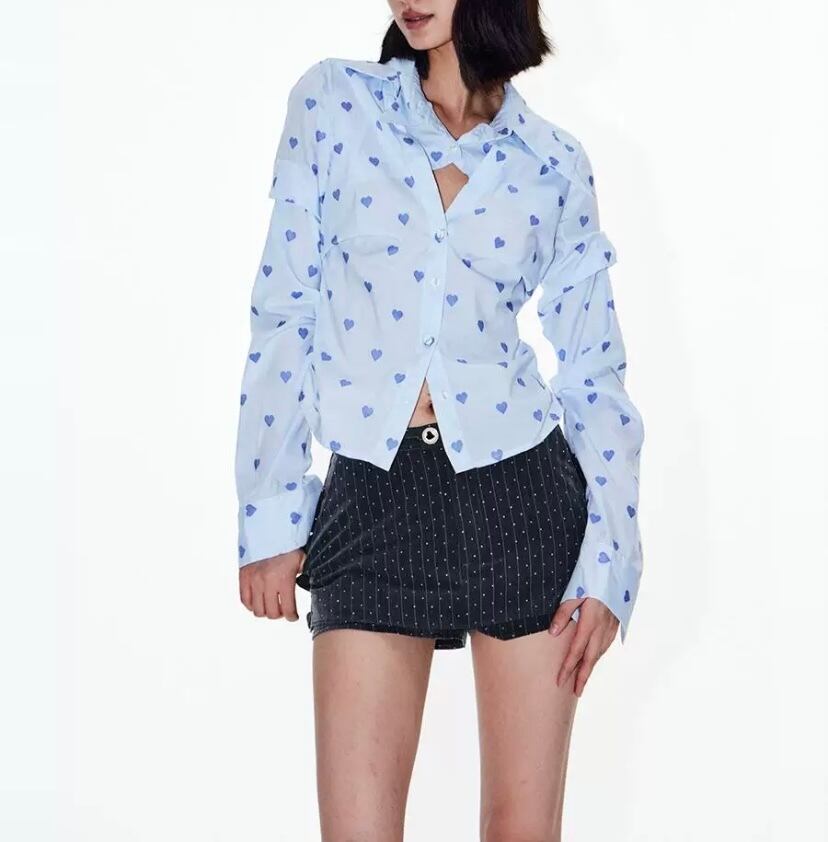 水色 チェック ボーダー ブラウス シャツ ハート 水色 トップス 襟 カジュアル