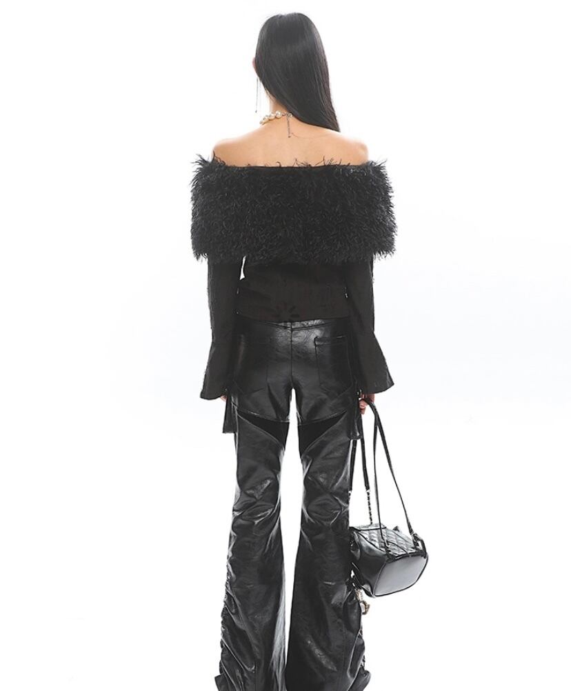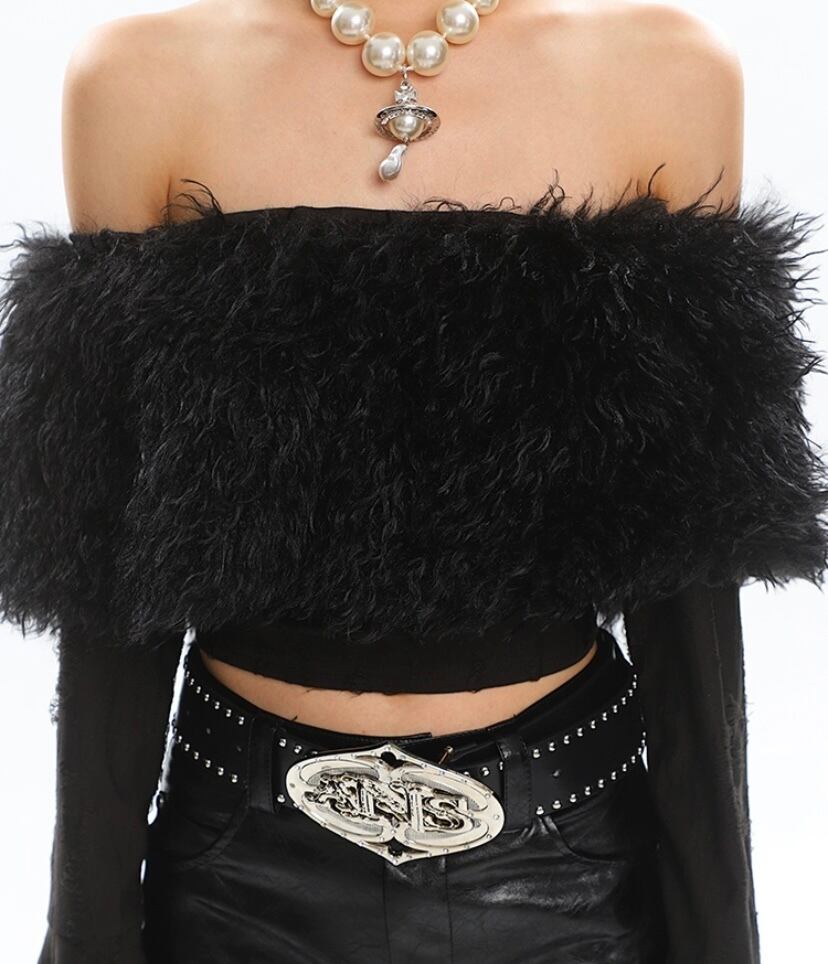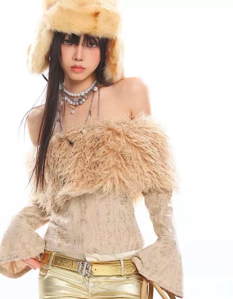 オフショルダー 黒 ベージュ ファー ブラウス カーディガン セーター トップス ストリート ダンス セクシー ファー 原宿 渋谷