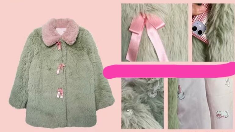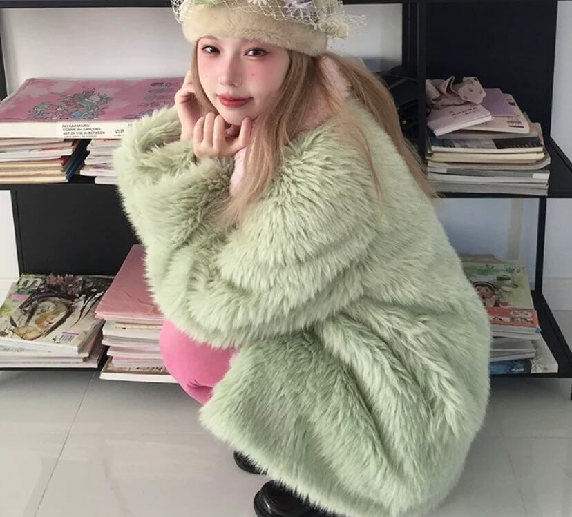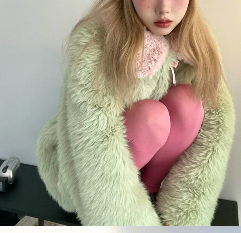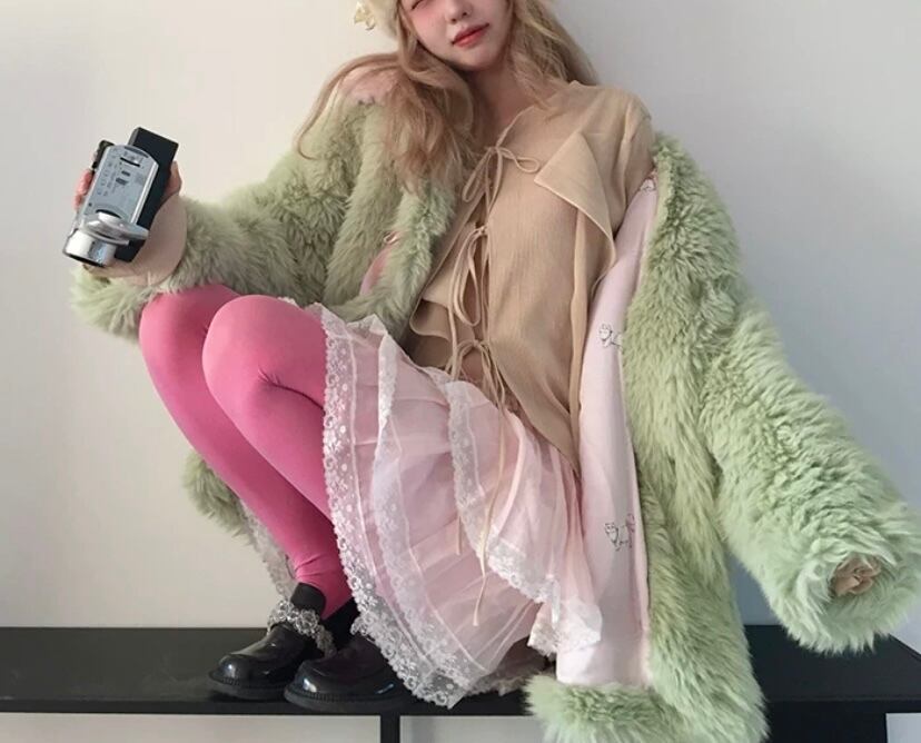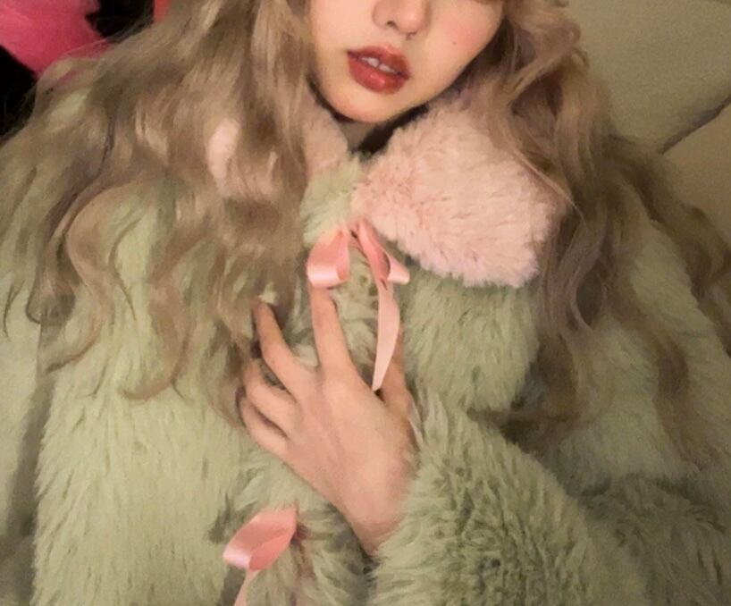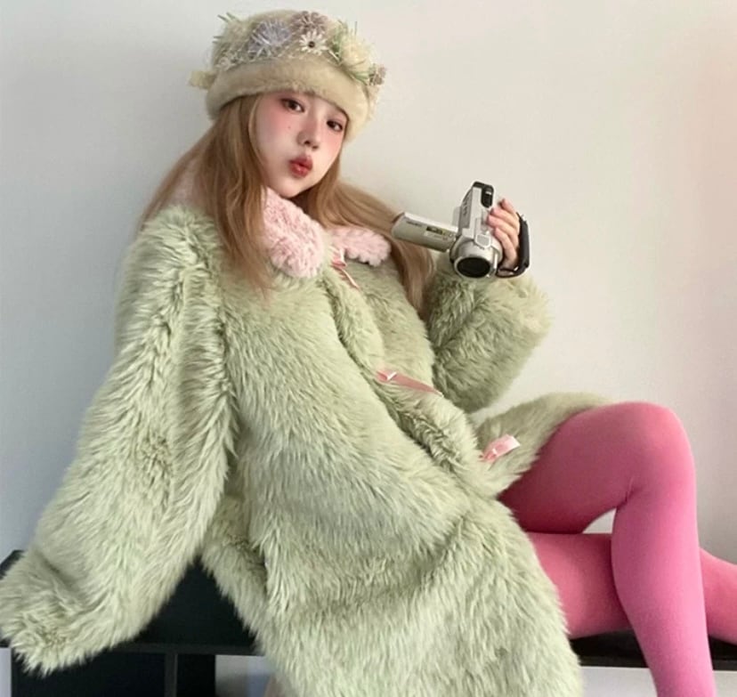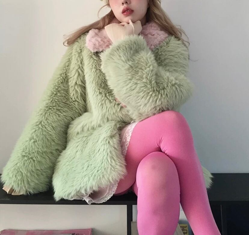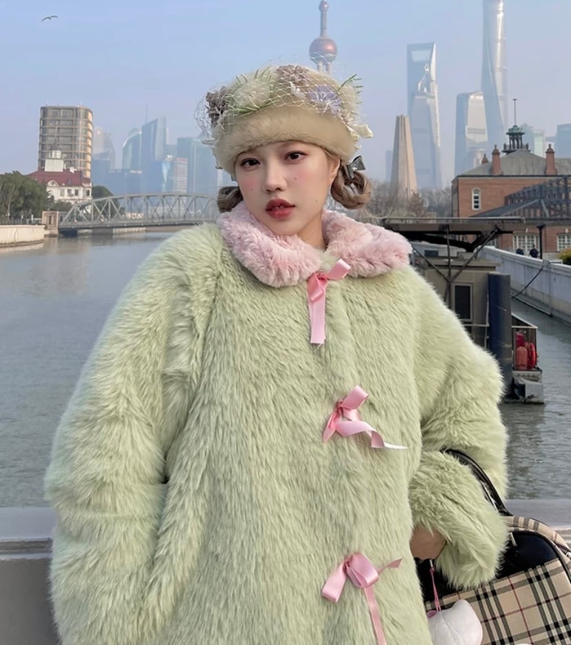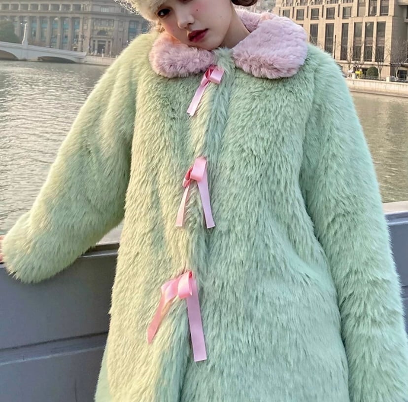 緑 グリーン ピンク リボン 丸襟 ガーリー ゴージャスジャ ファー コート ワンピース アウター ジャケット 姫 可愛い 原宿
