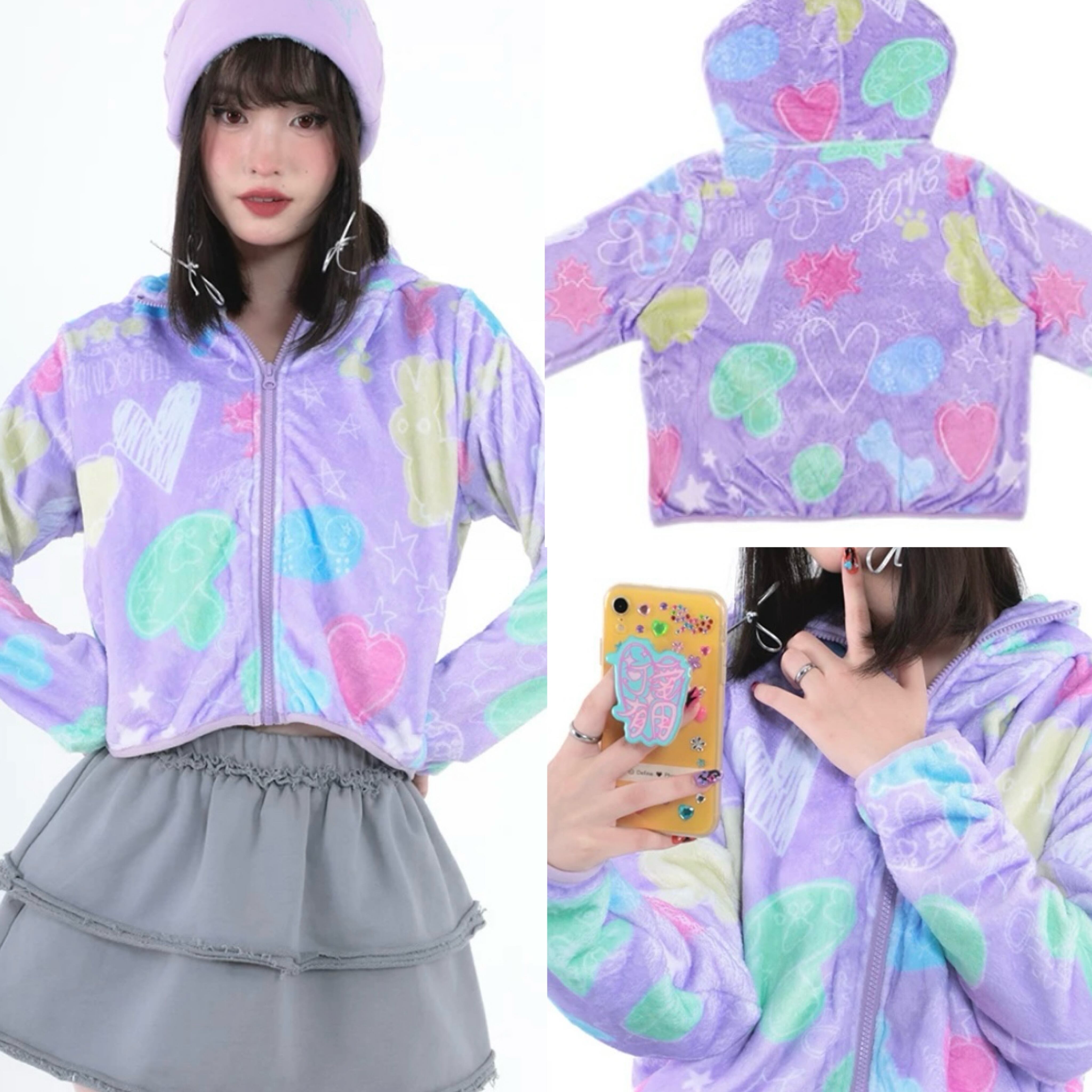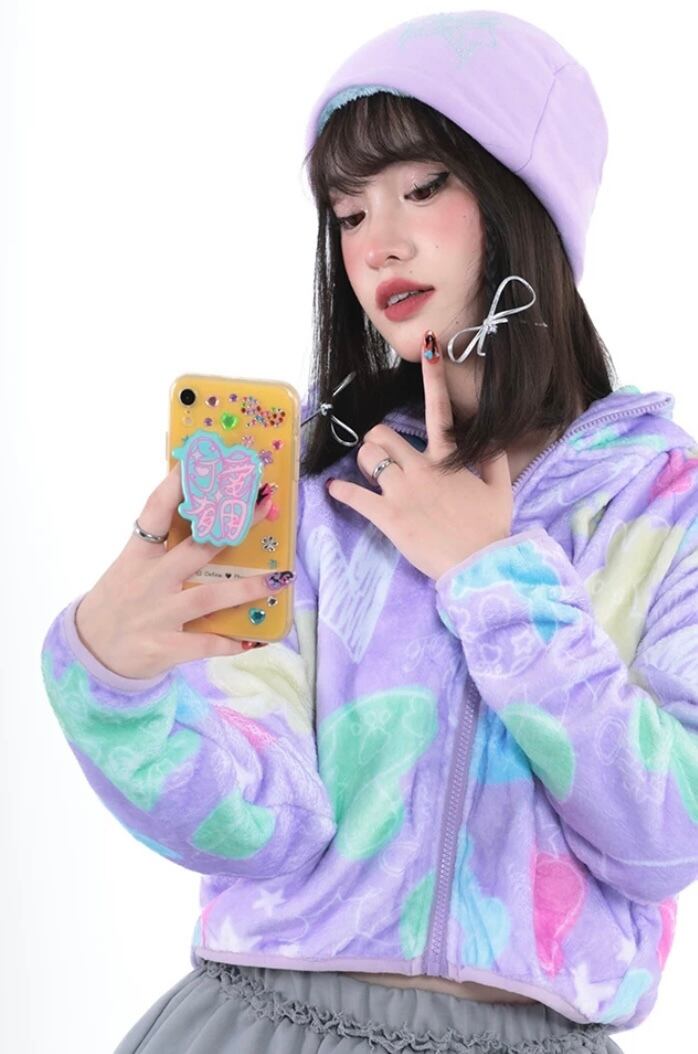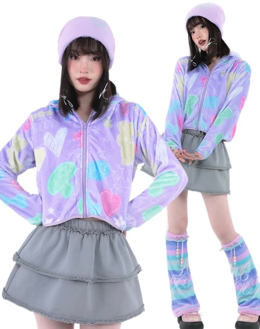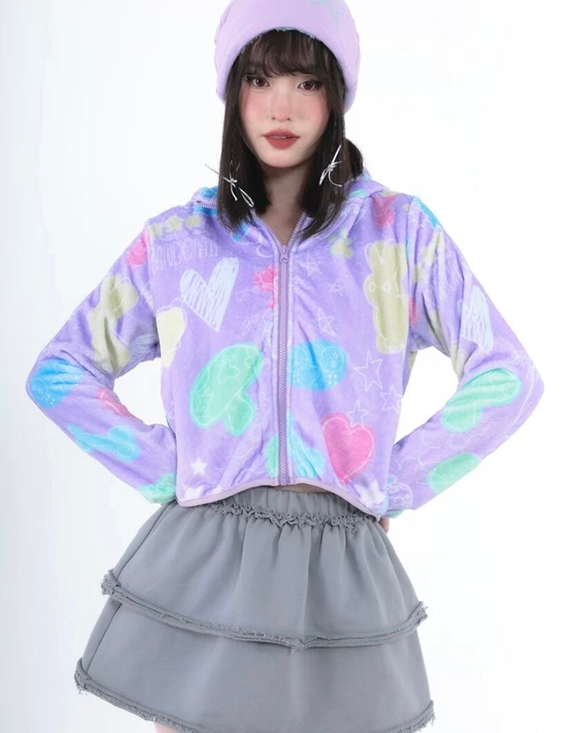 紫 ピンク 黄色 フリース ジャンバー アウター コート パーカ スウェット 原宿 ハート 落書き カジュアル