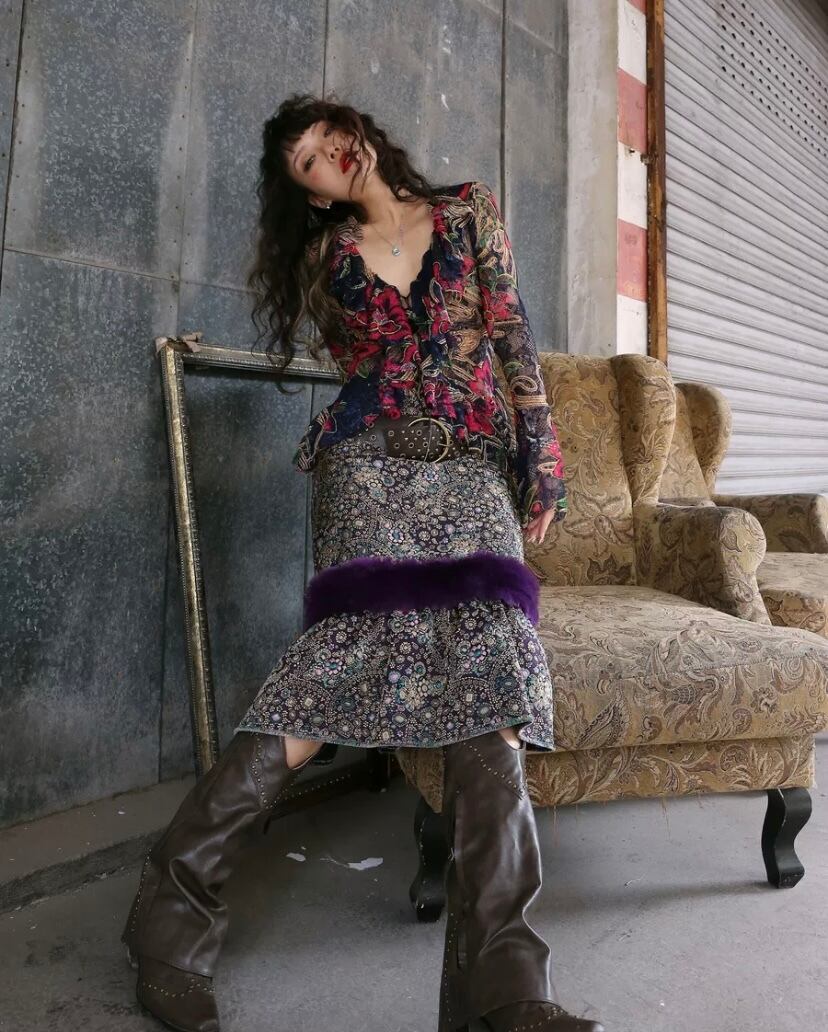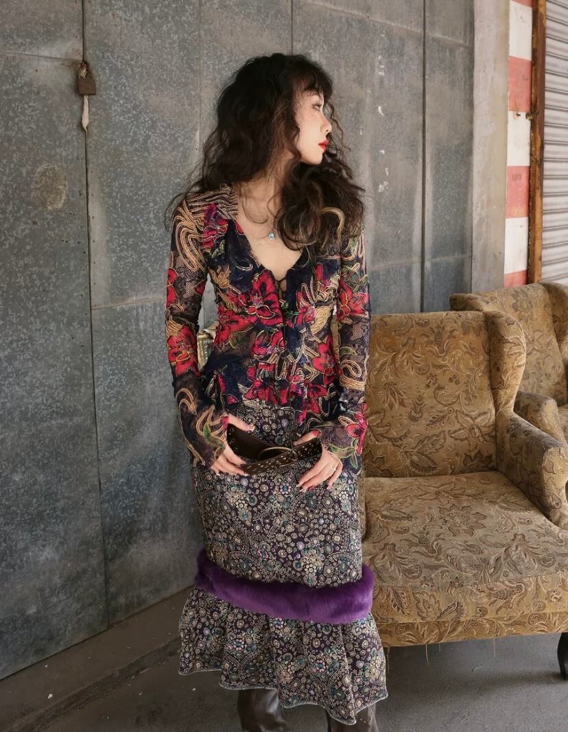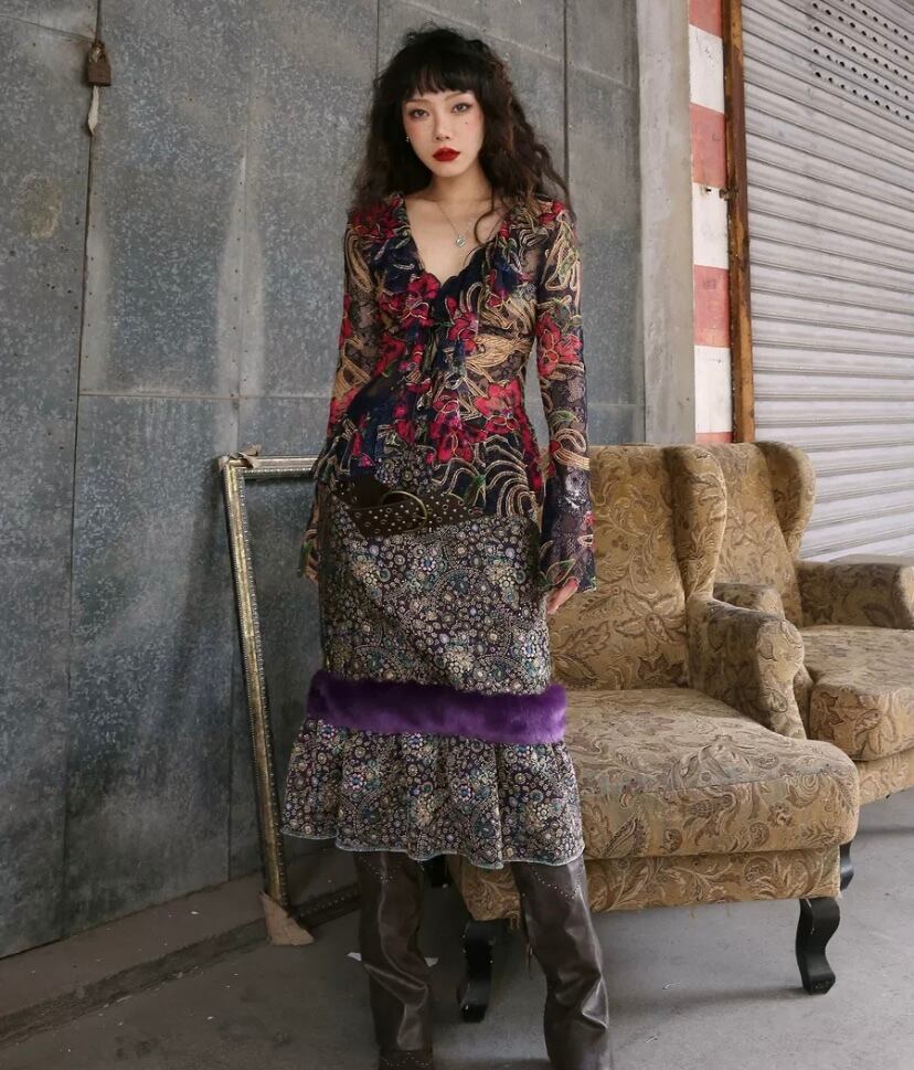 【スカート】 紫 パープル エスニック 和風 花柄 フラワーワ ファー スカート マーメイド ボトムス