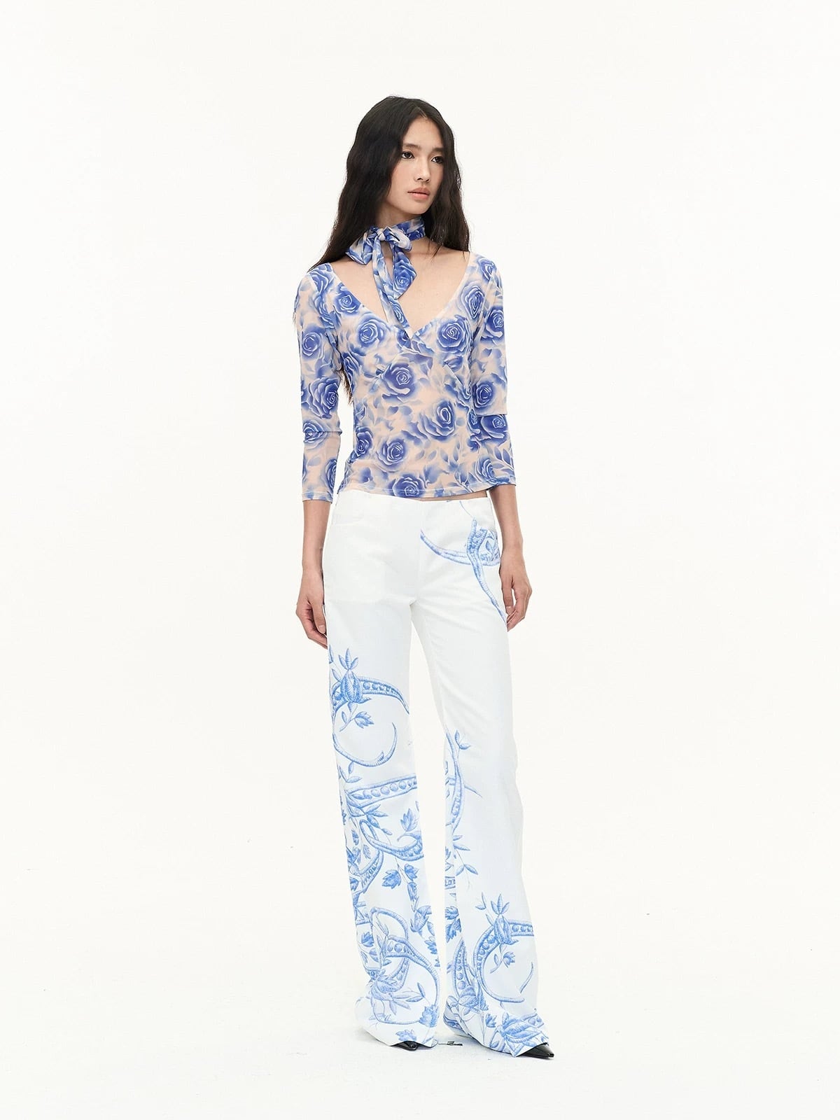 ブルー ネイビー 青 水色 ブラウス リボン マフラー スカーフ バラ 花柄 フラワー トップス Tシャツ Vネック エレガント