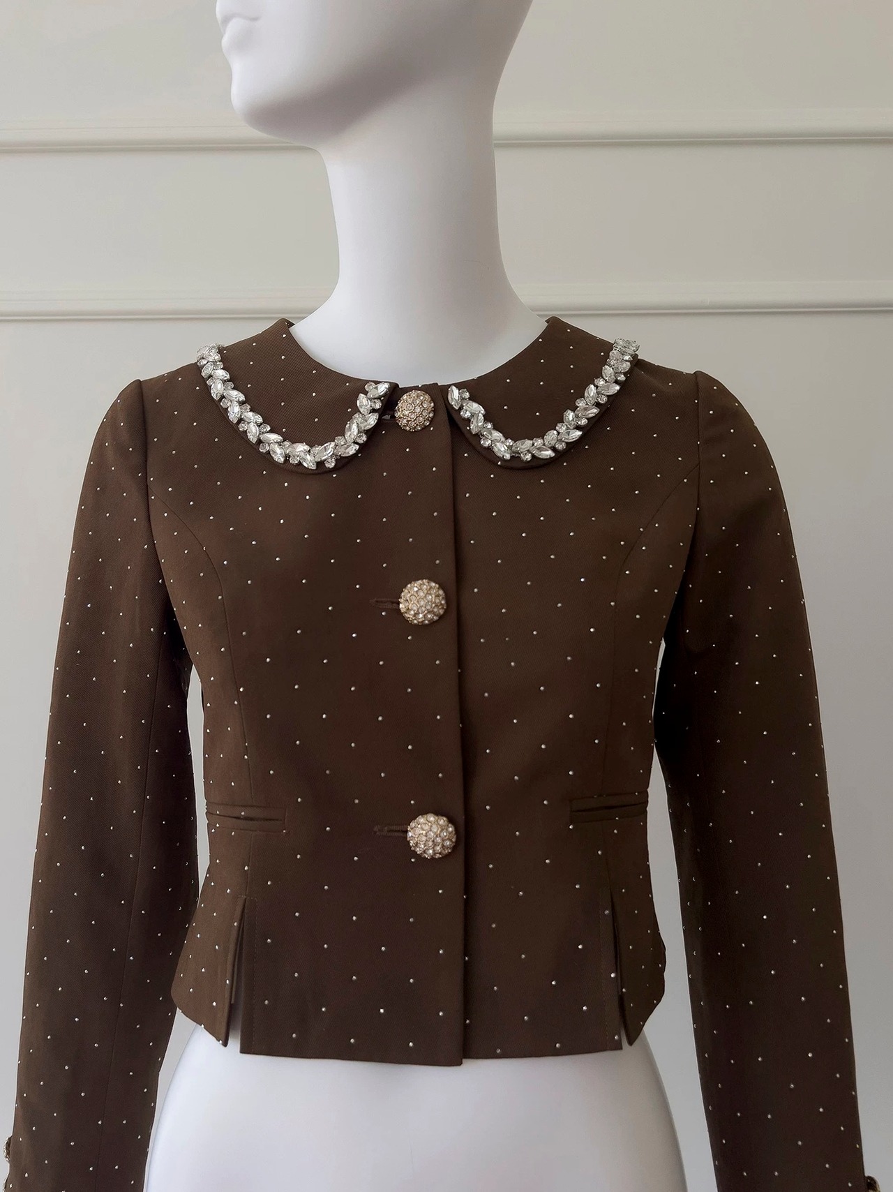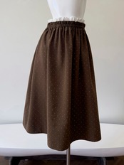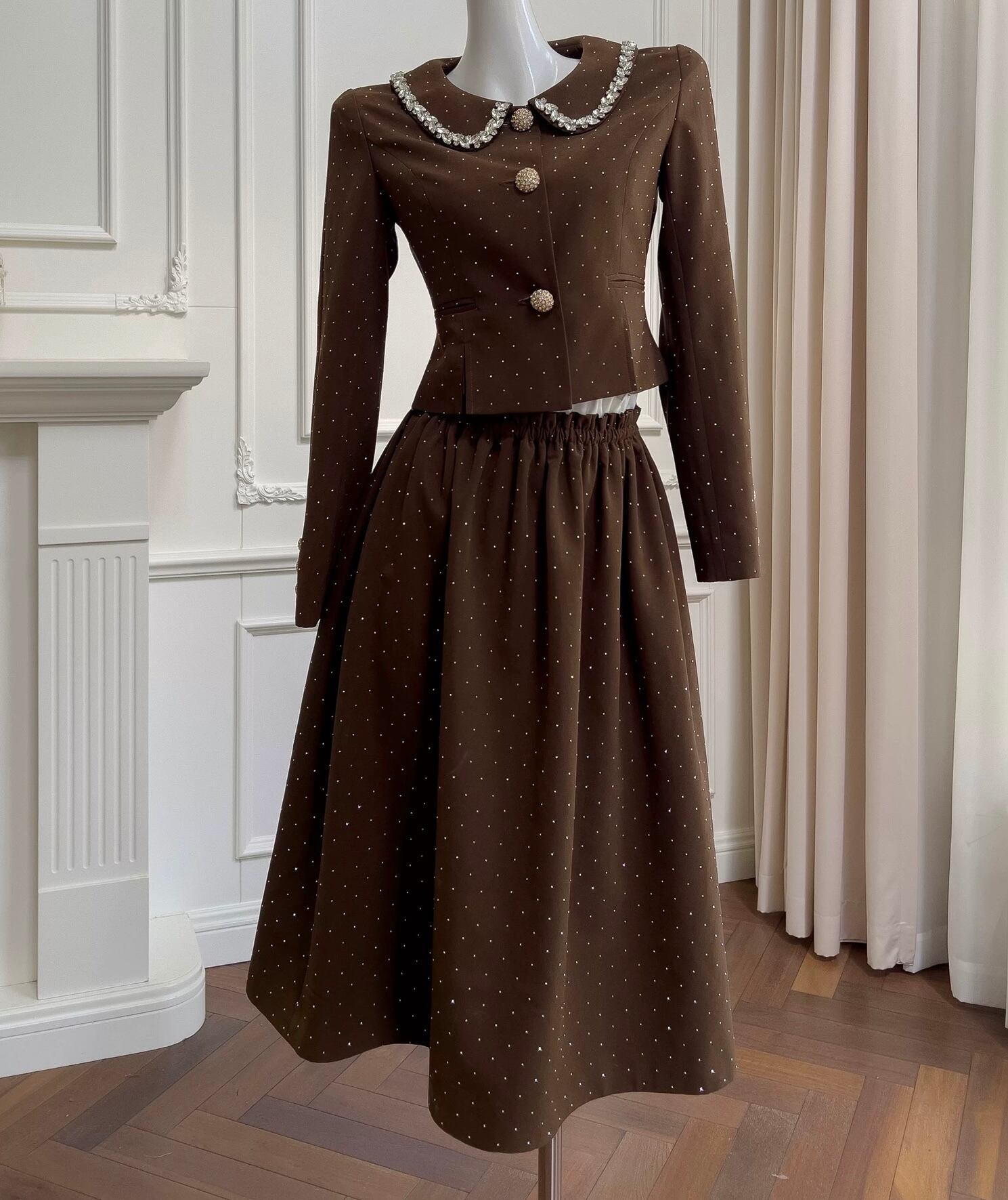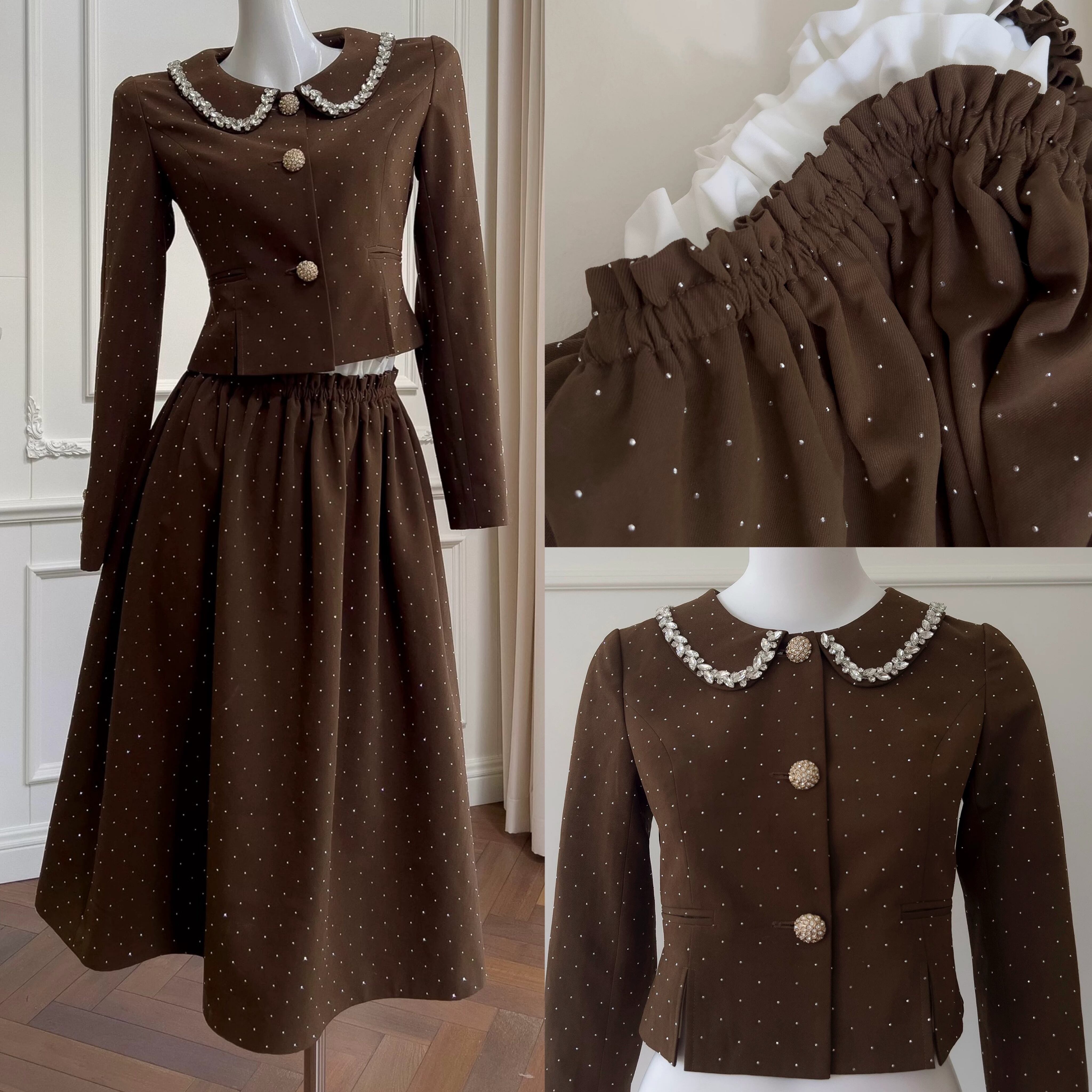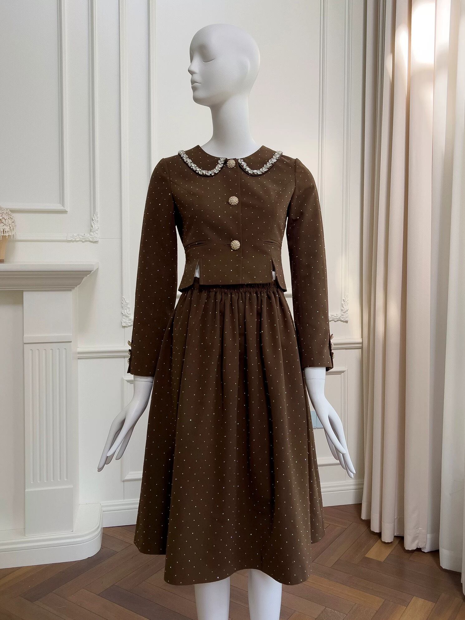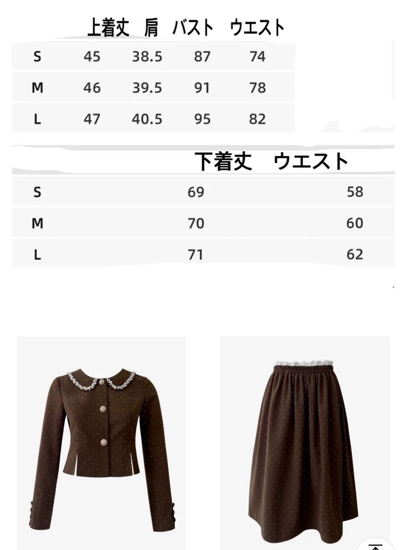 茶色 丸襟り ジャケット スーツ セットアップ 水玉 ドット ボトムス フレアスカート かわいい シンプル