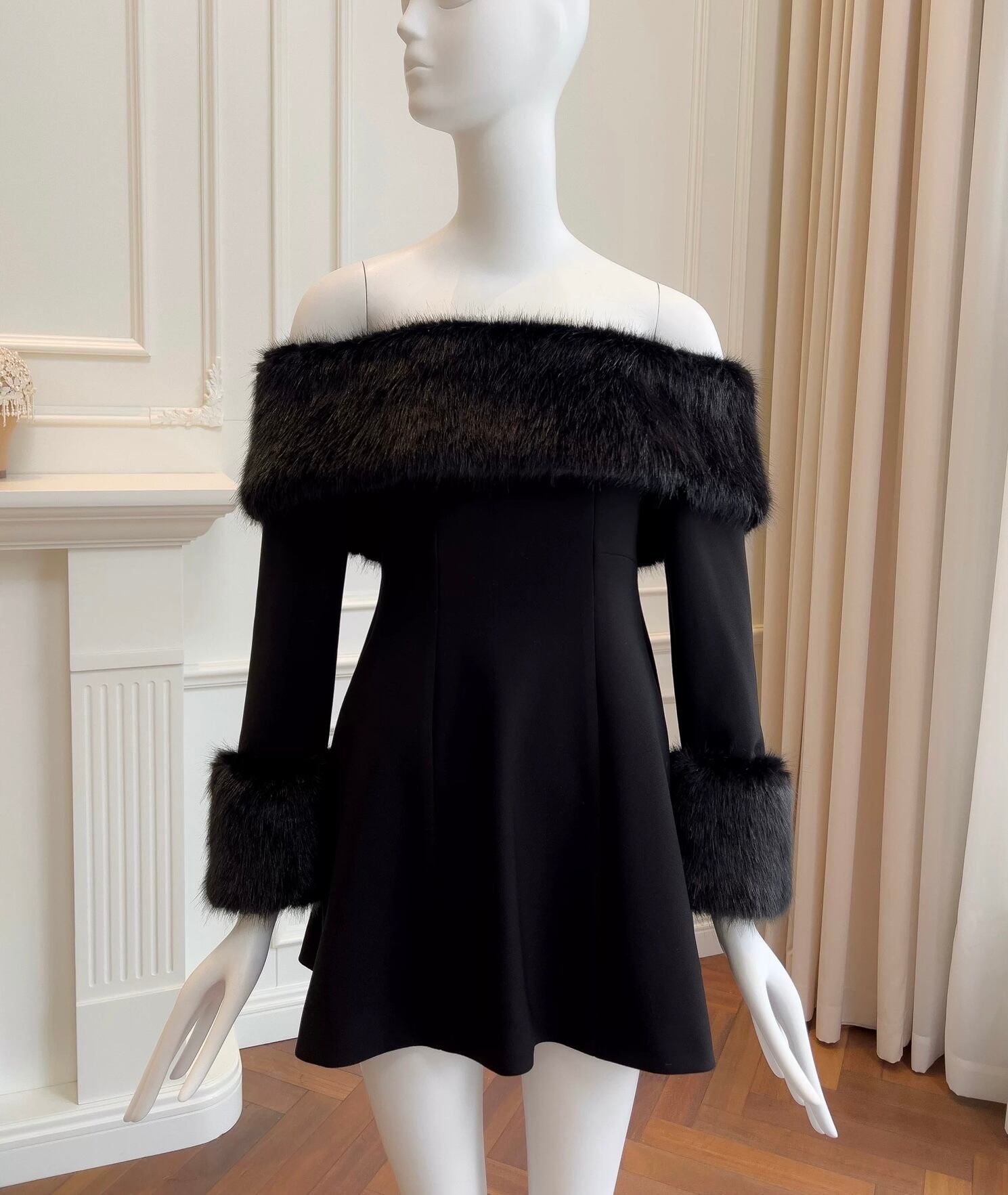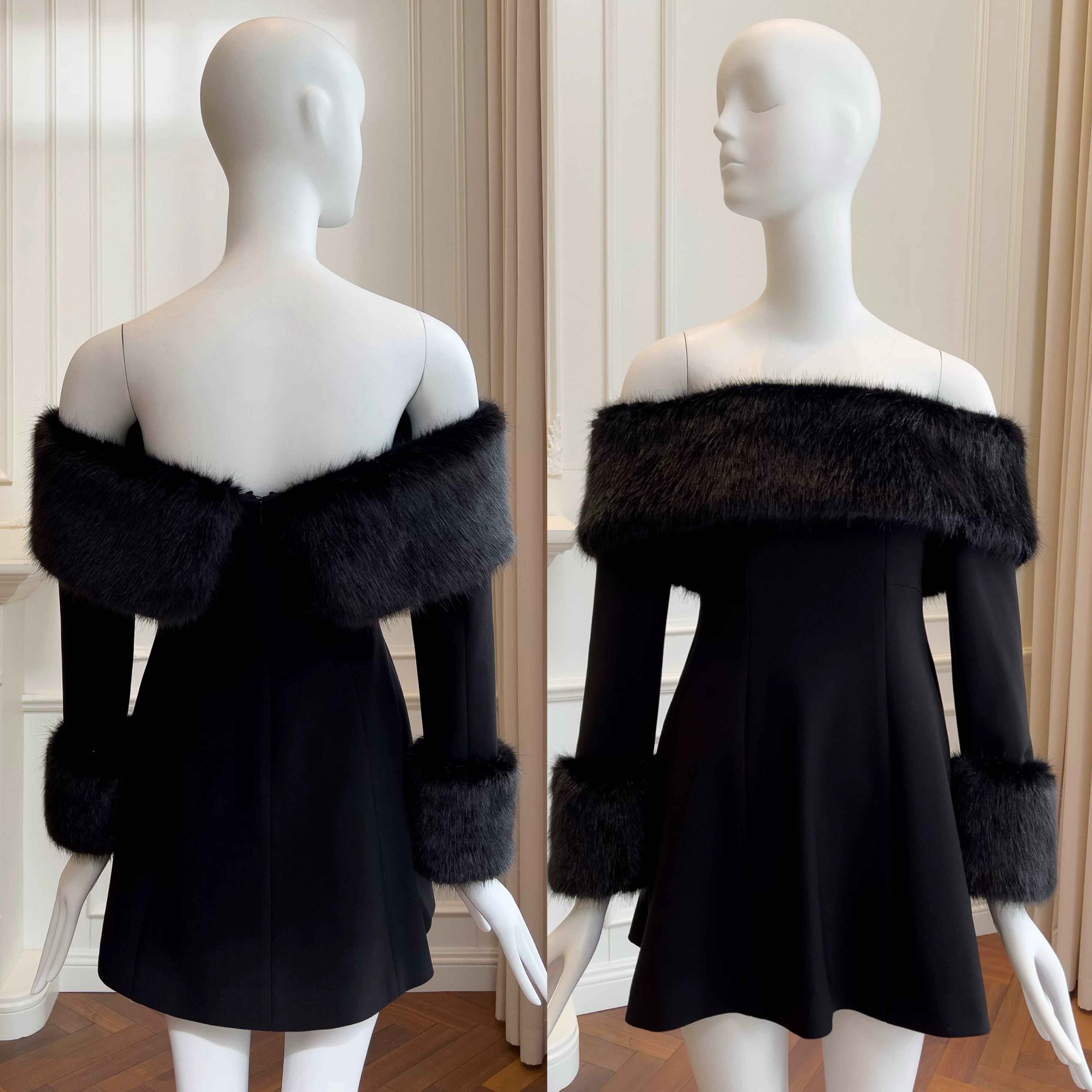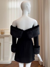 黒 ブラック ベロア ベルベット オフショルダー ワンピース ファー エレガント パーティー ドレス ゴージャス かわいい お嬢様