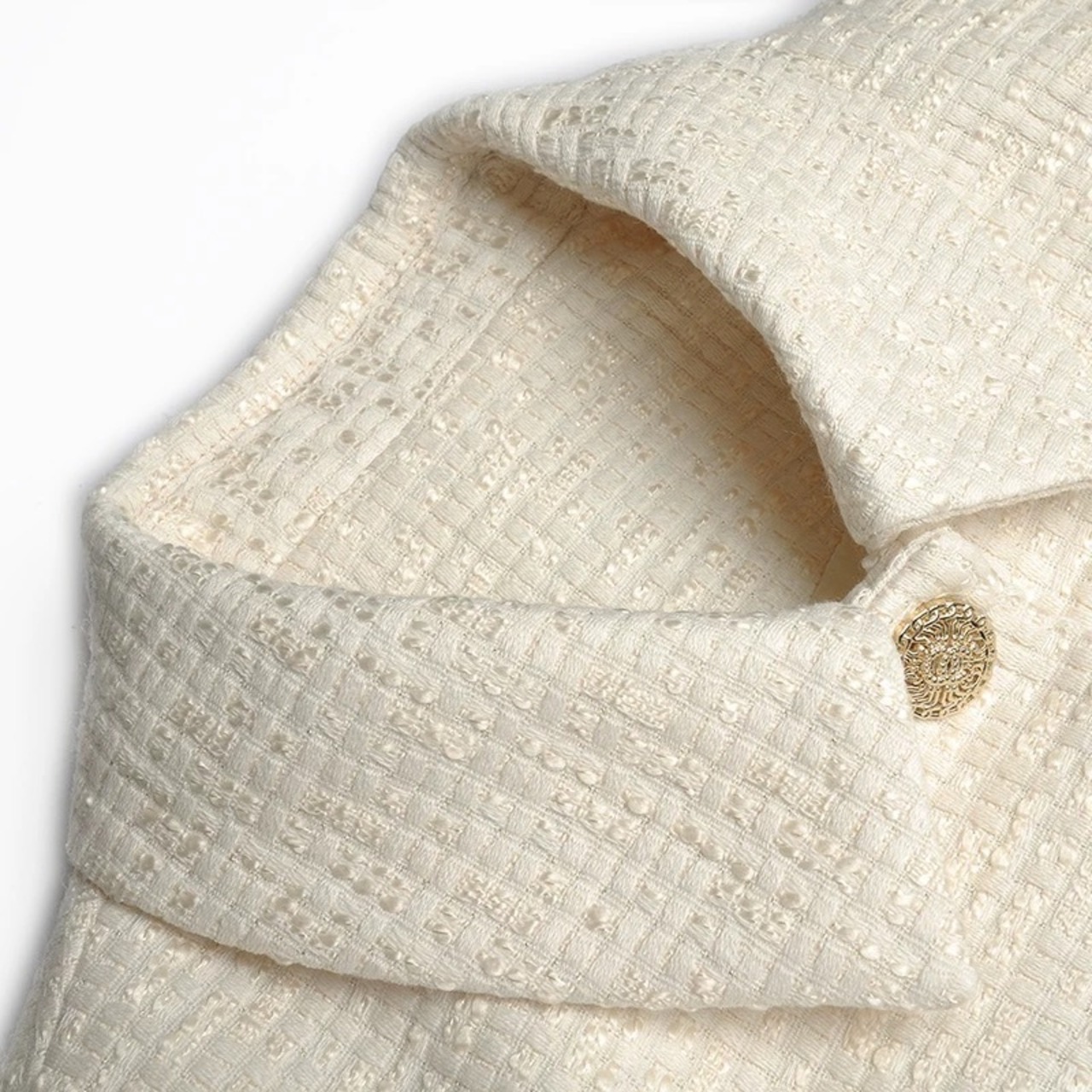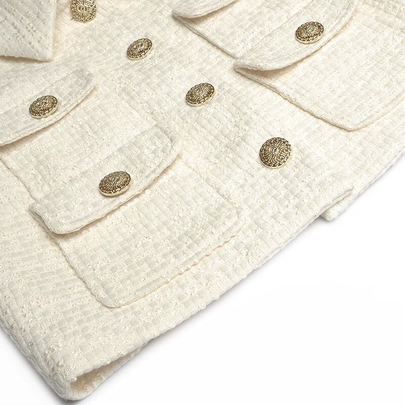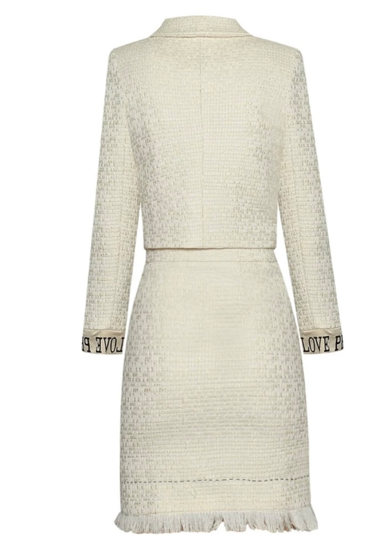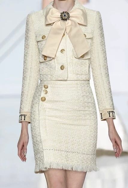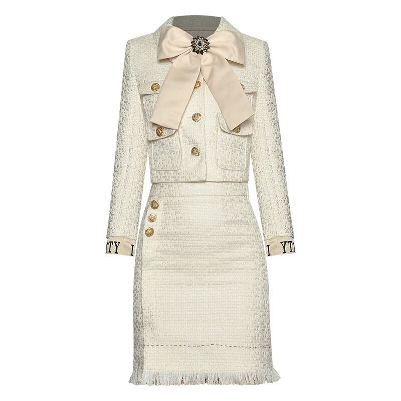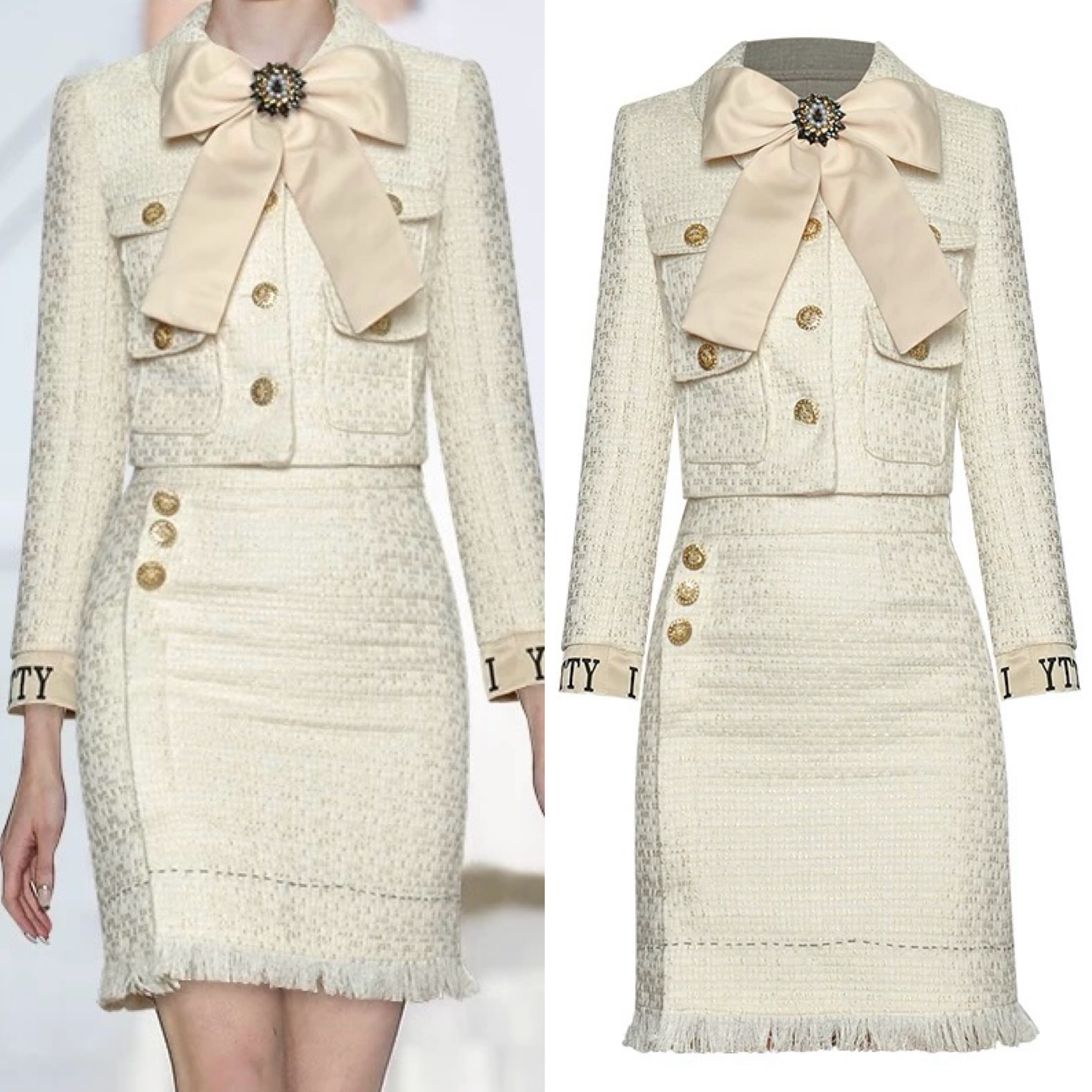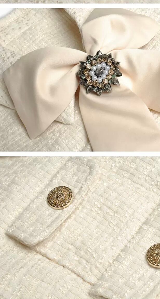【セットアップ】白 アイボリー ベージュ ジャケット スカート アウター スーツ エレガント リボン ポケット ボタン XL