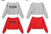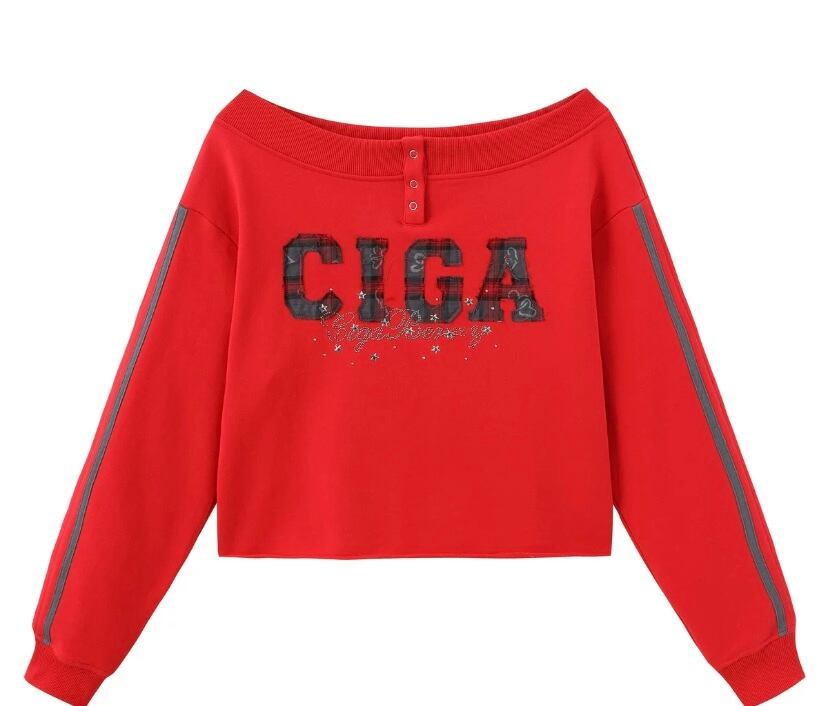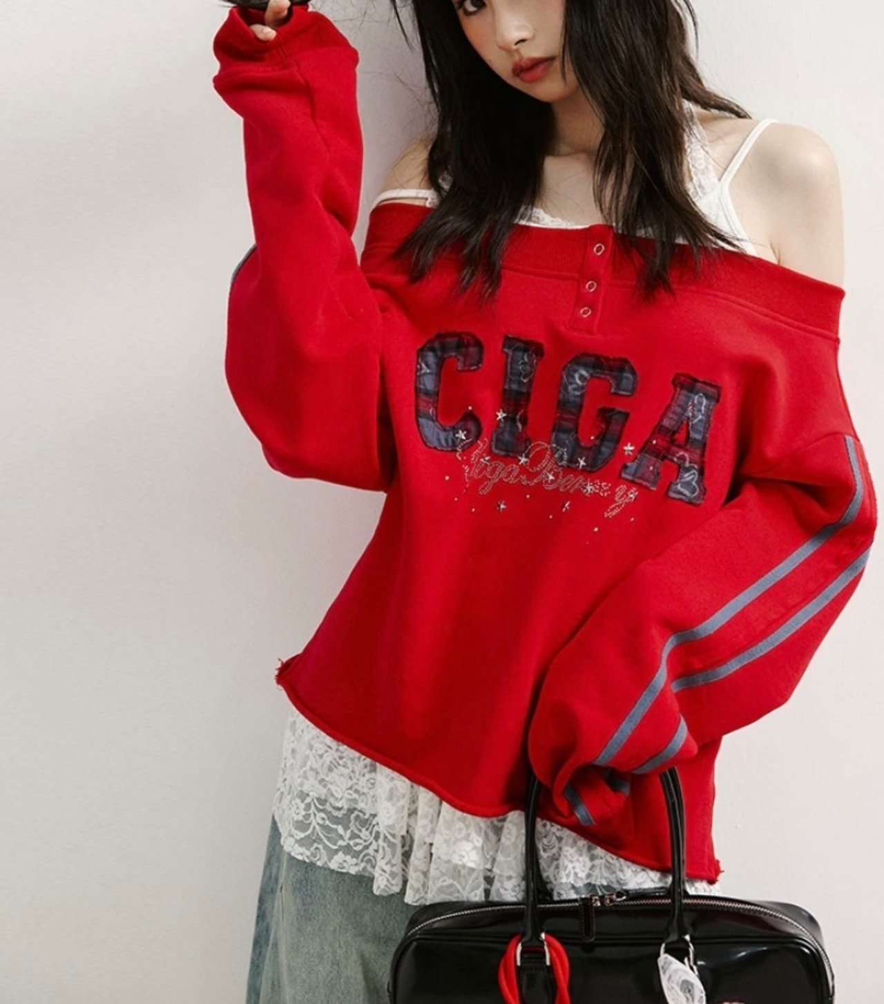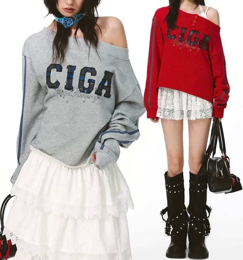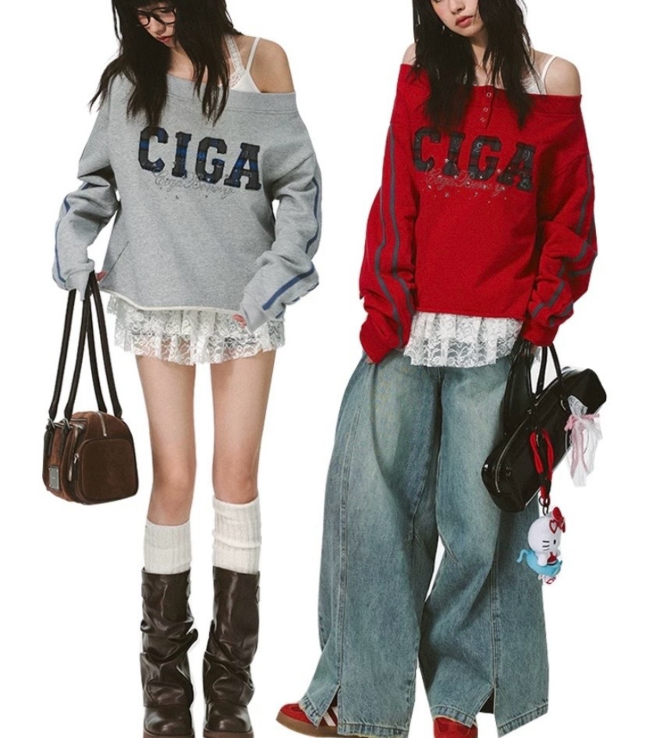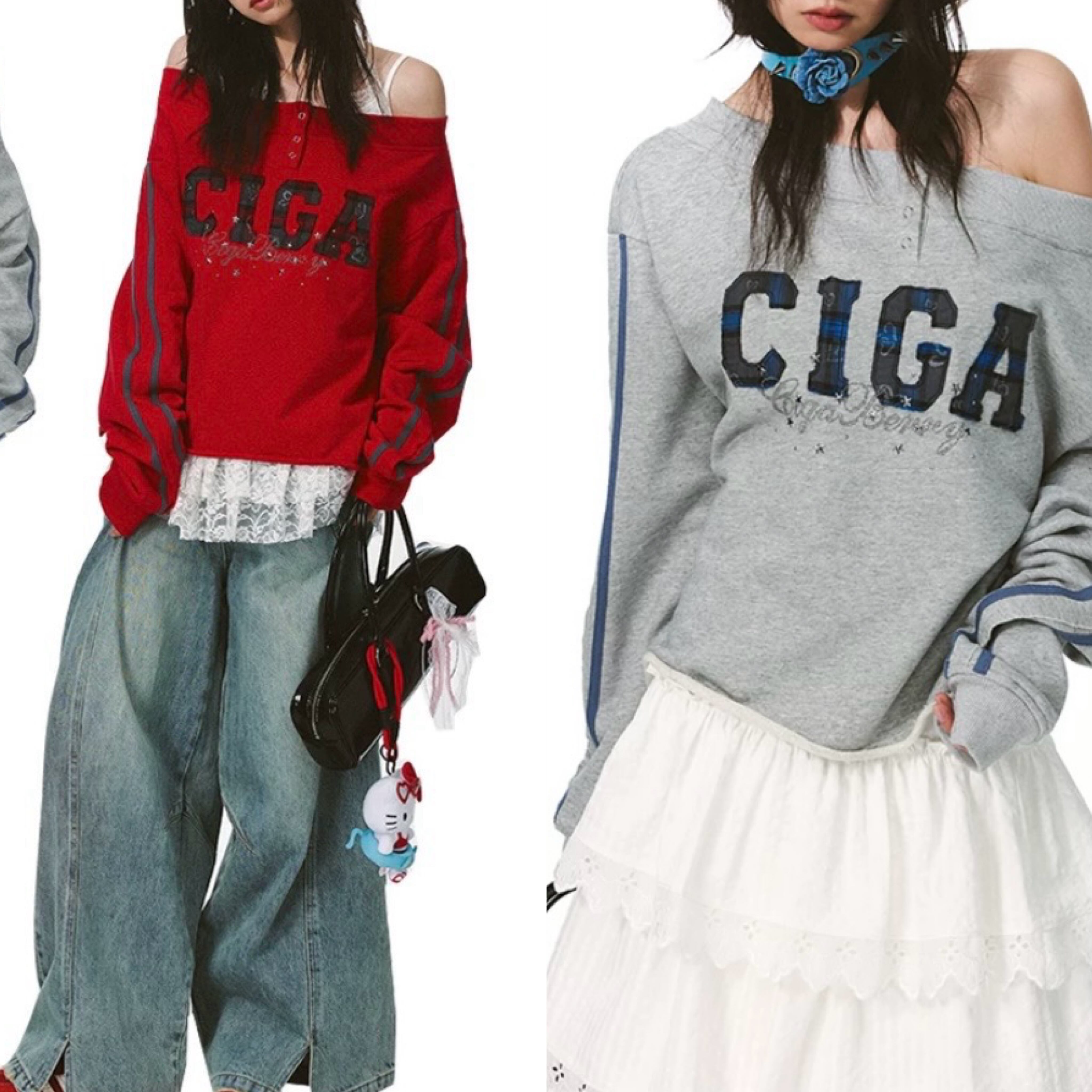 オフショルダー グレー 赤 スウェット トレーナー トップス カジュアル ブラウス かわいい ストリート 原宿
