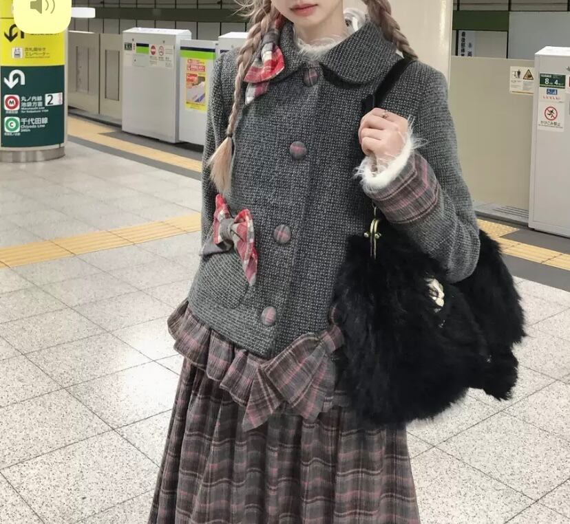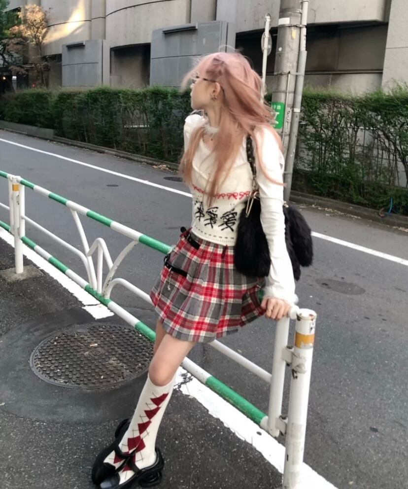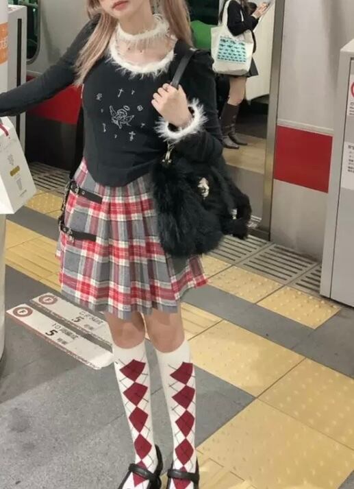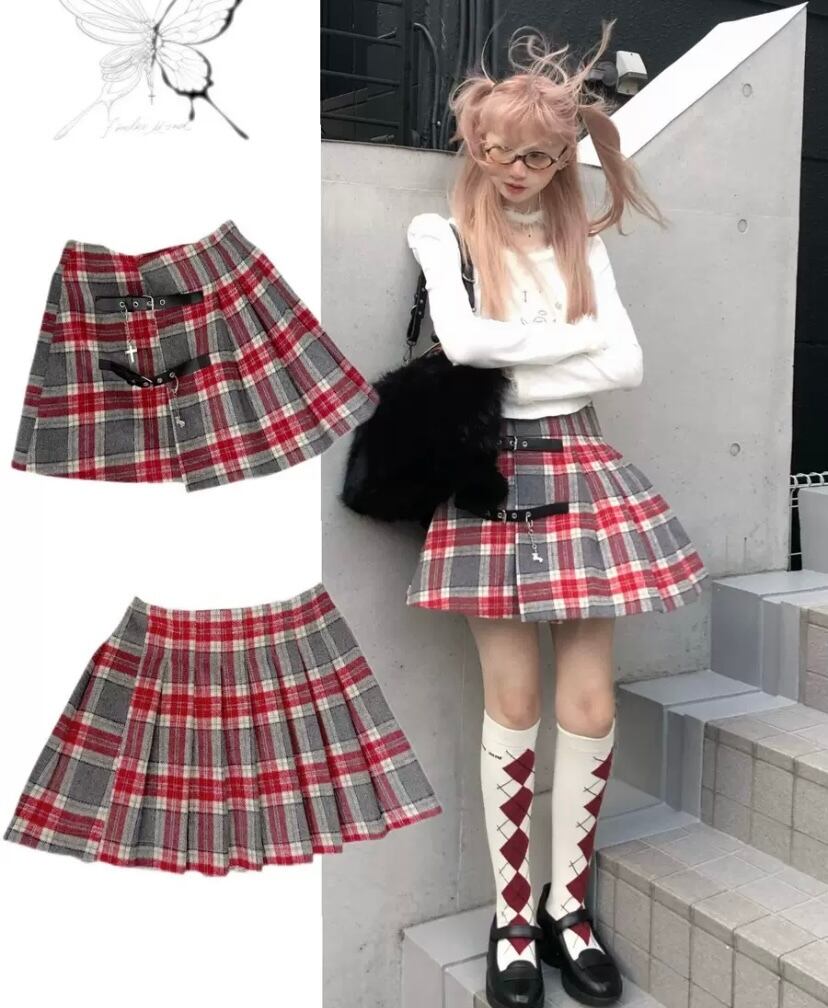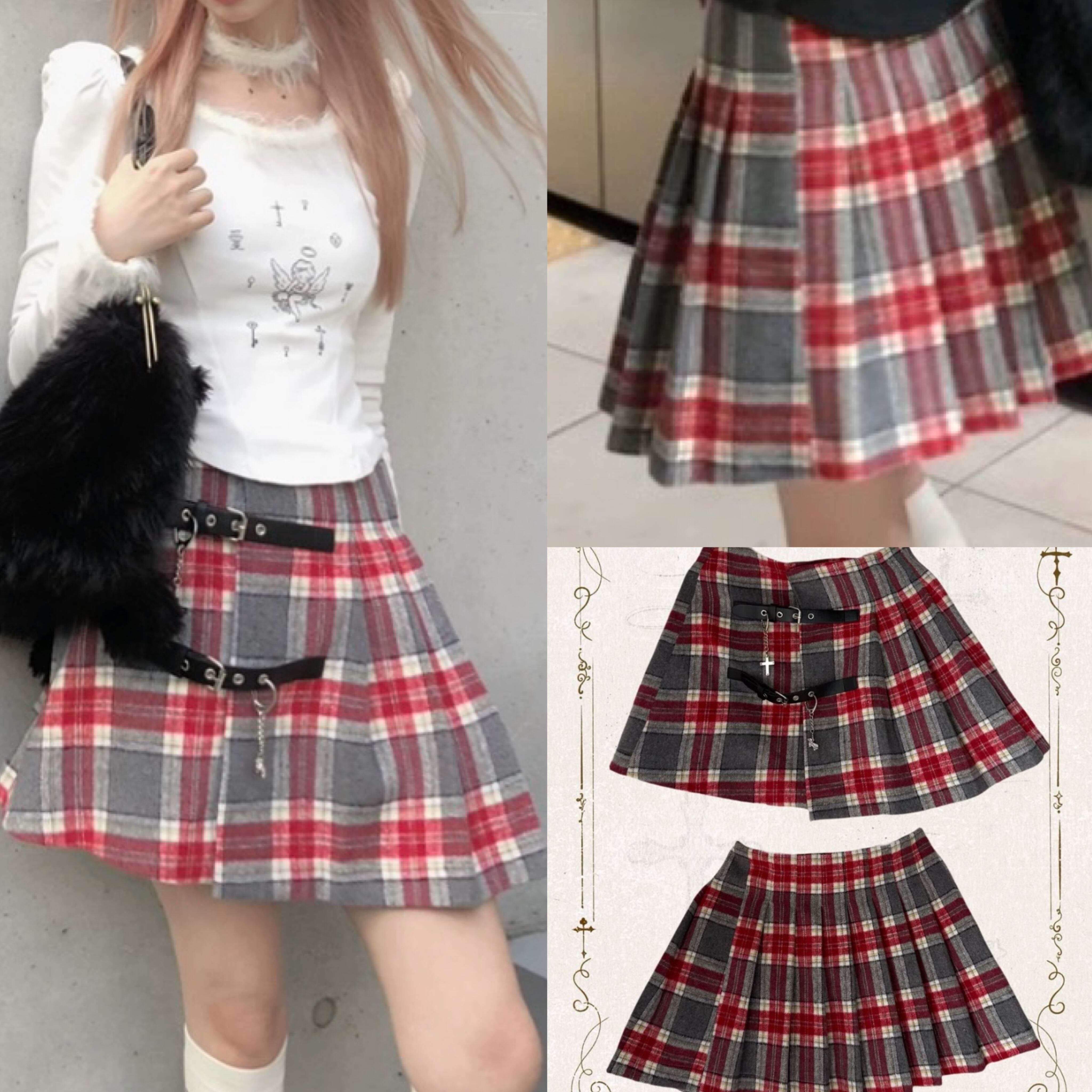 ボトムス ミニスカート ガーリー グレー 赤 チェック フリーススカート 制服 スクール 原宿