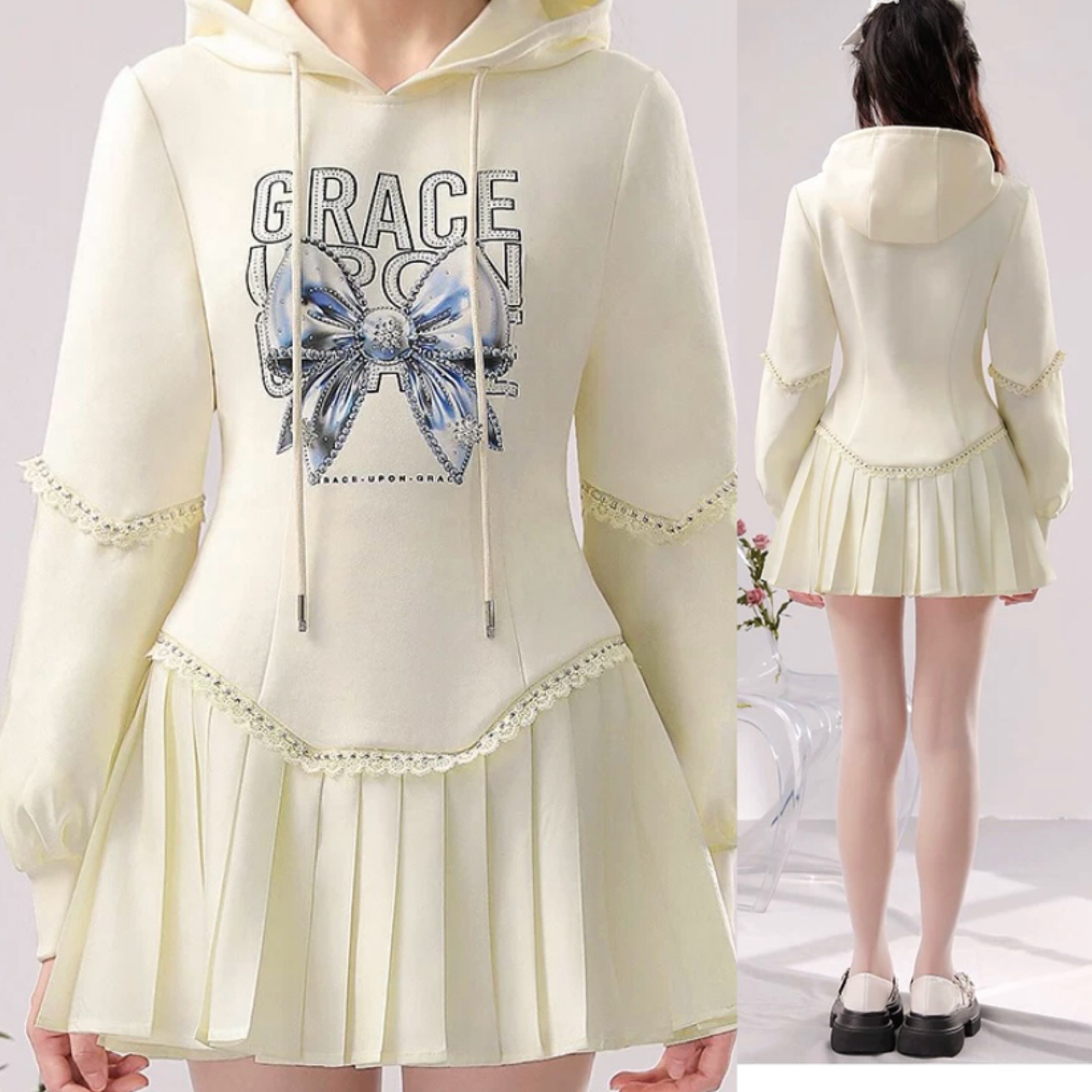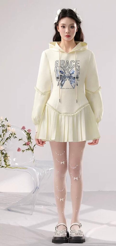 パーカー トレーナー 白 ホワイト アイボリー 水色 リボン スウェット ガーリ かわいい カジュアル プリーズスカート