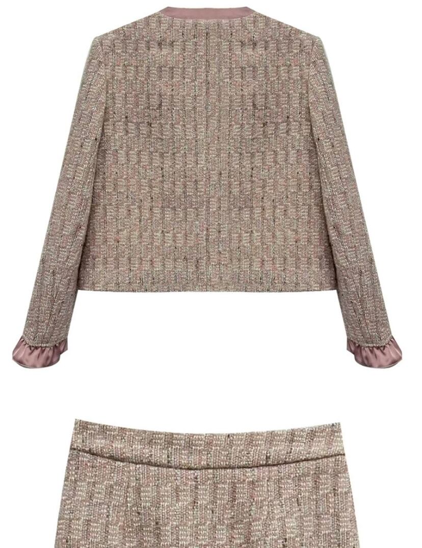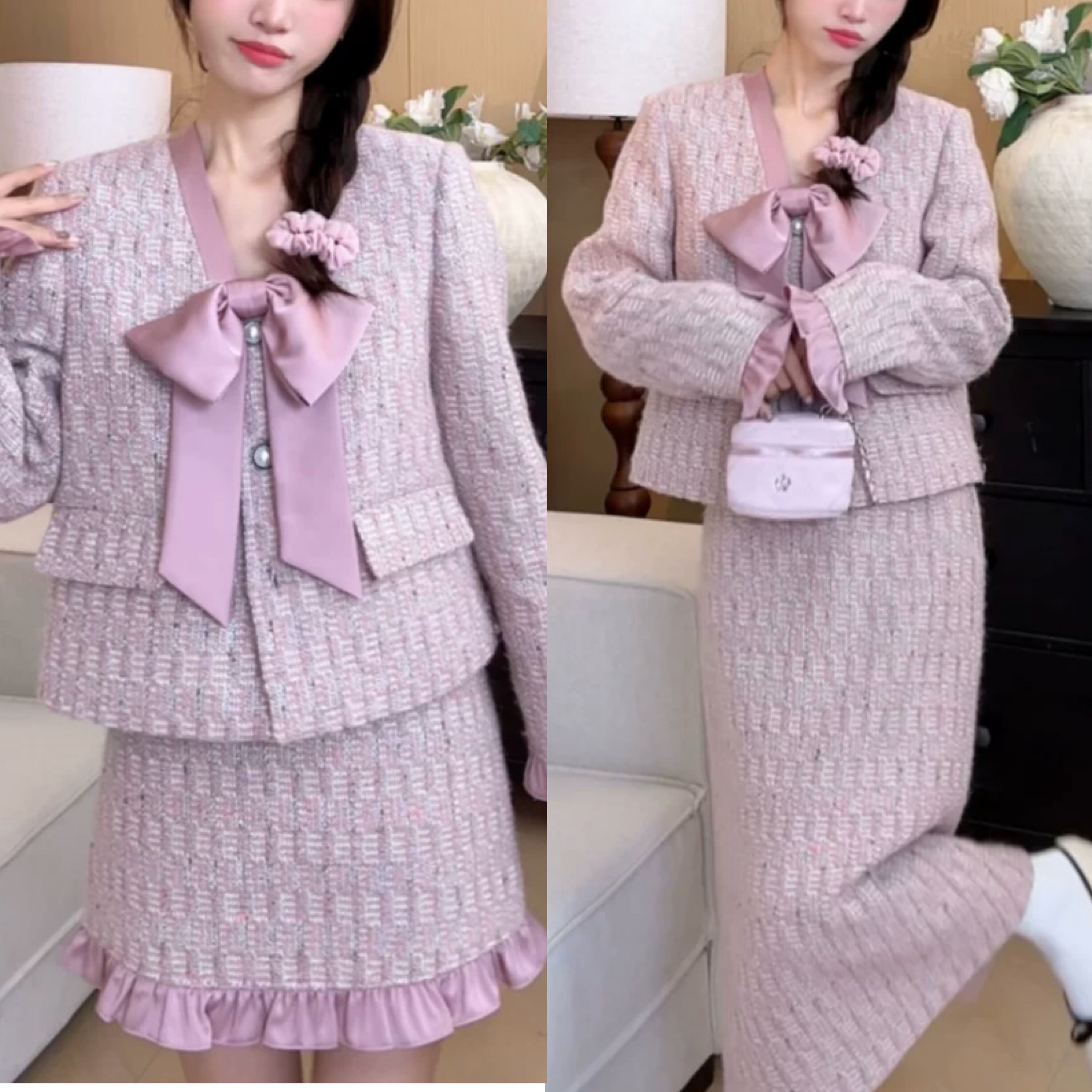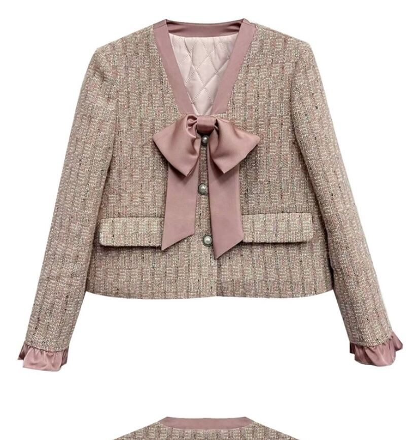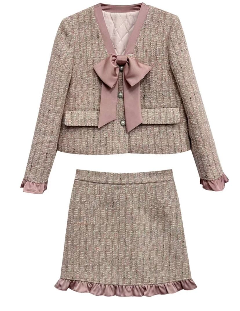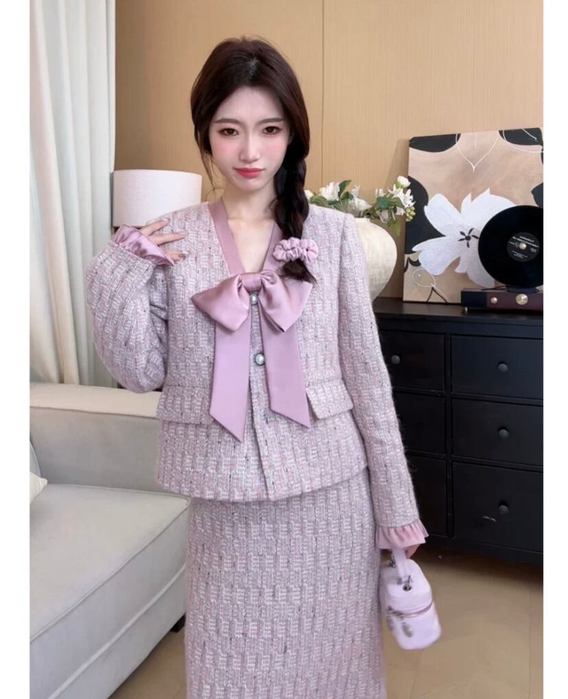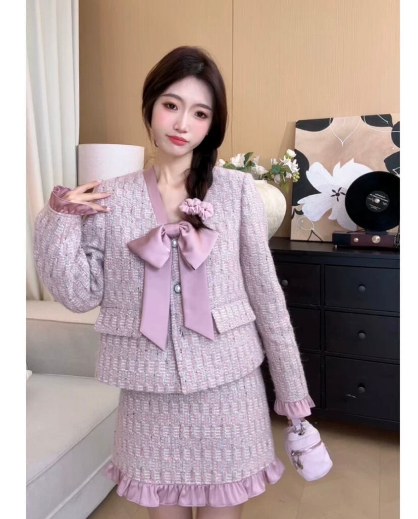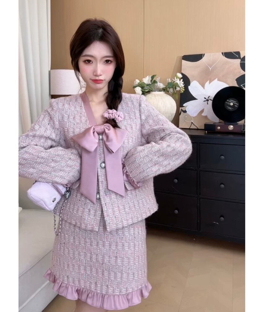 【セットアップ】ピンク 紫 リボン ジャケット スカート アウター ボトムス お嬢様 スーツ リボン