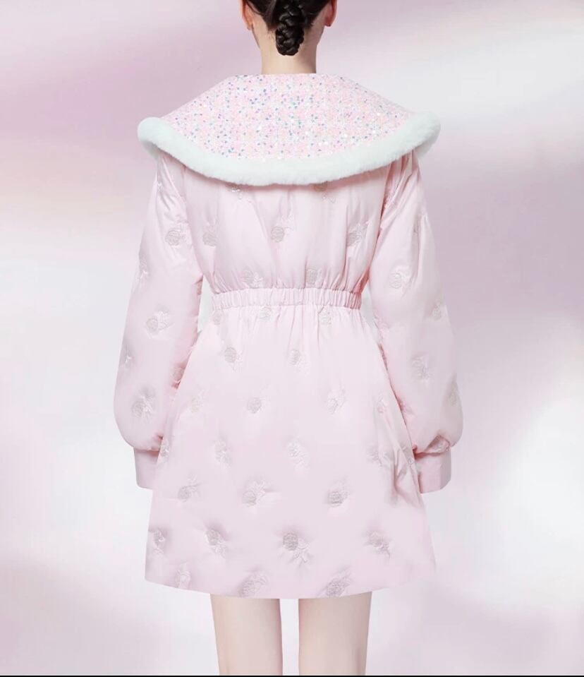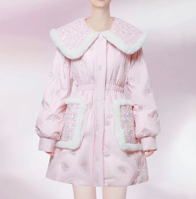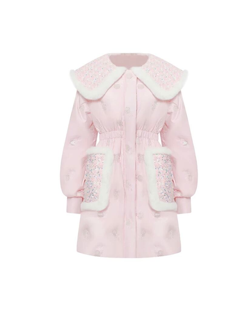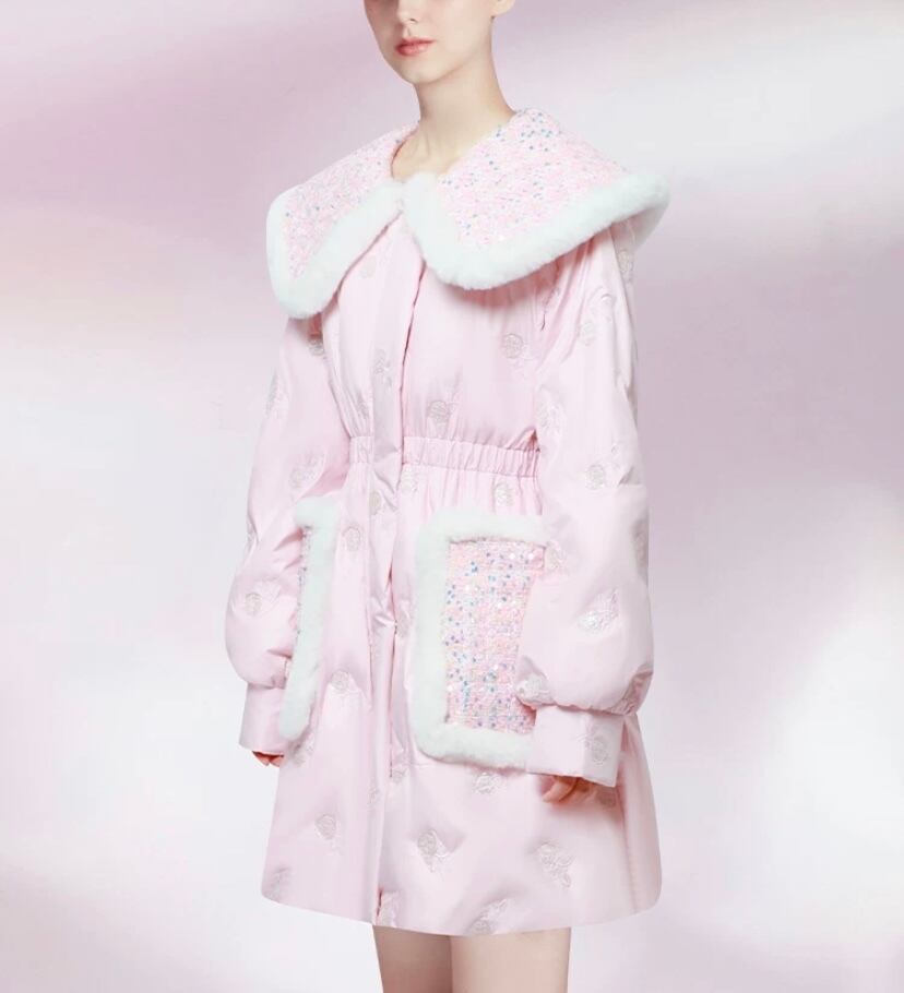 ピンク ゴージャス ギラギラ 襟 キラキラ ポケット アウター ダウン ジャケッ コート デカ襟 りぼん 花柄 エレガント コー