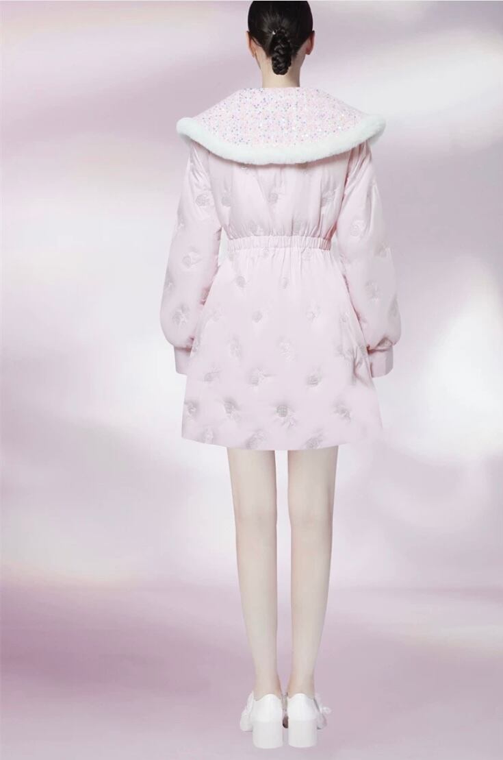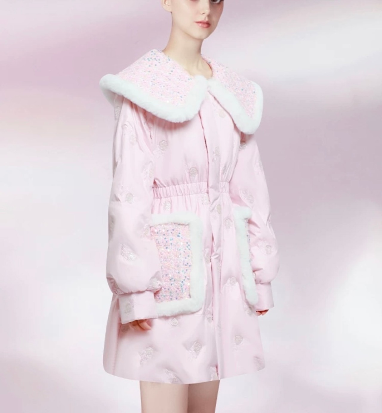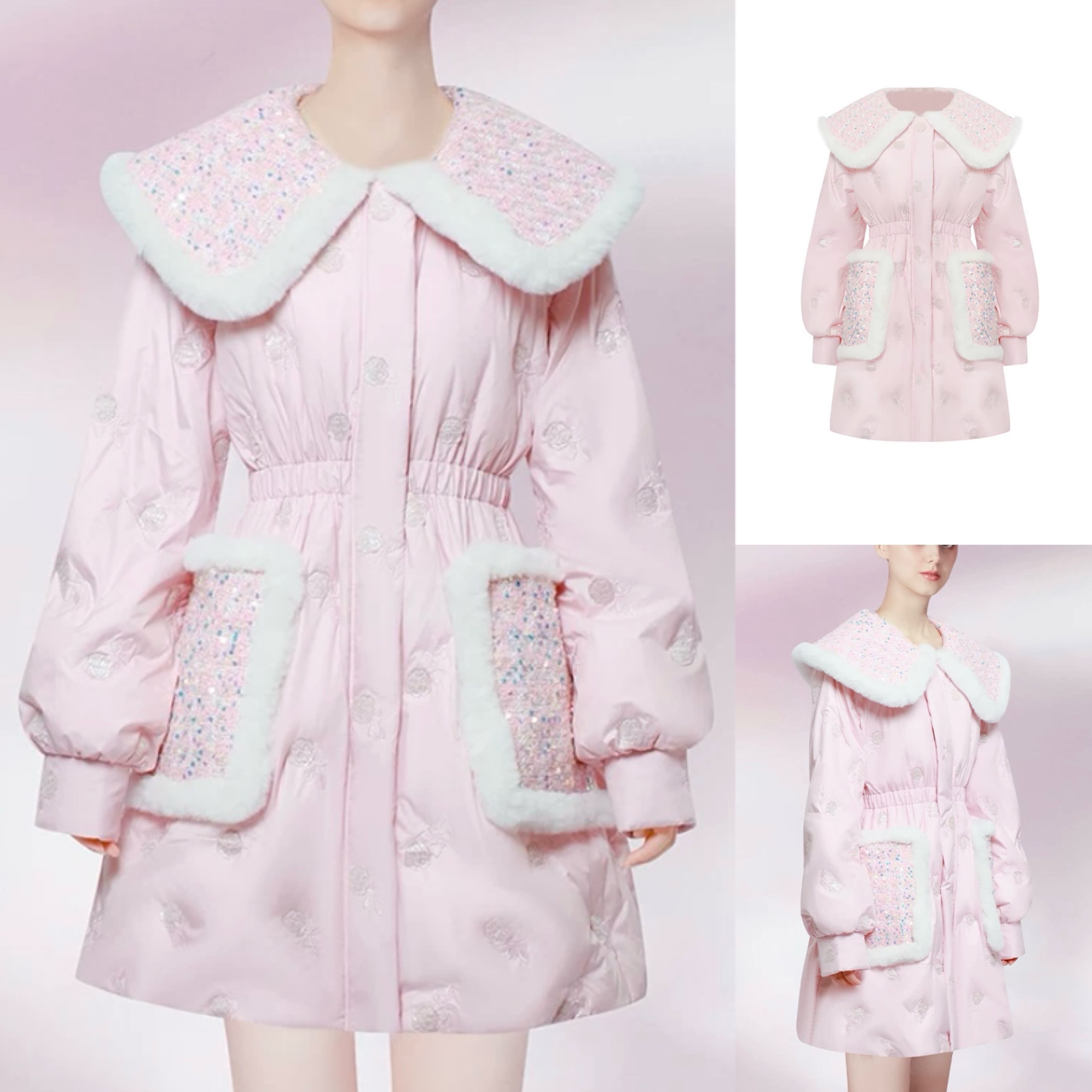 ピンク ゴージャス ギラギラ 襟 キラキラ ポケット アウター ダウン ジャケッ コート デカ襟 りぼん 花柄 エレガント コー