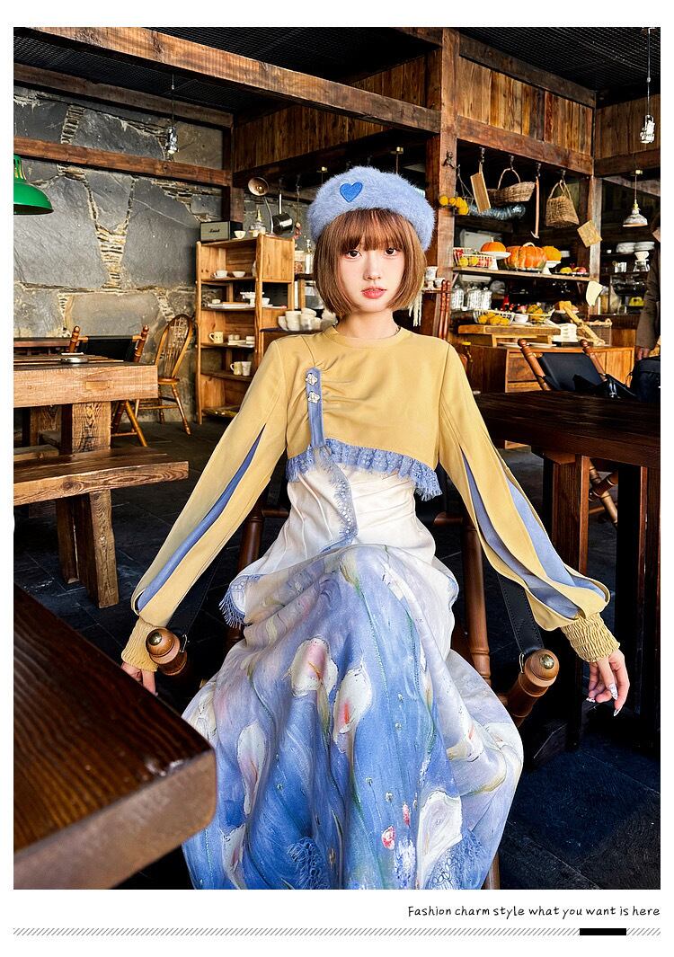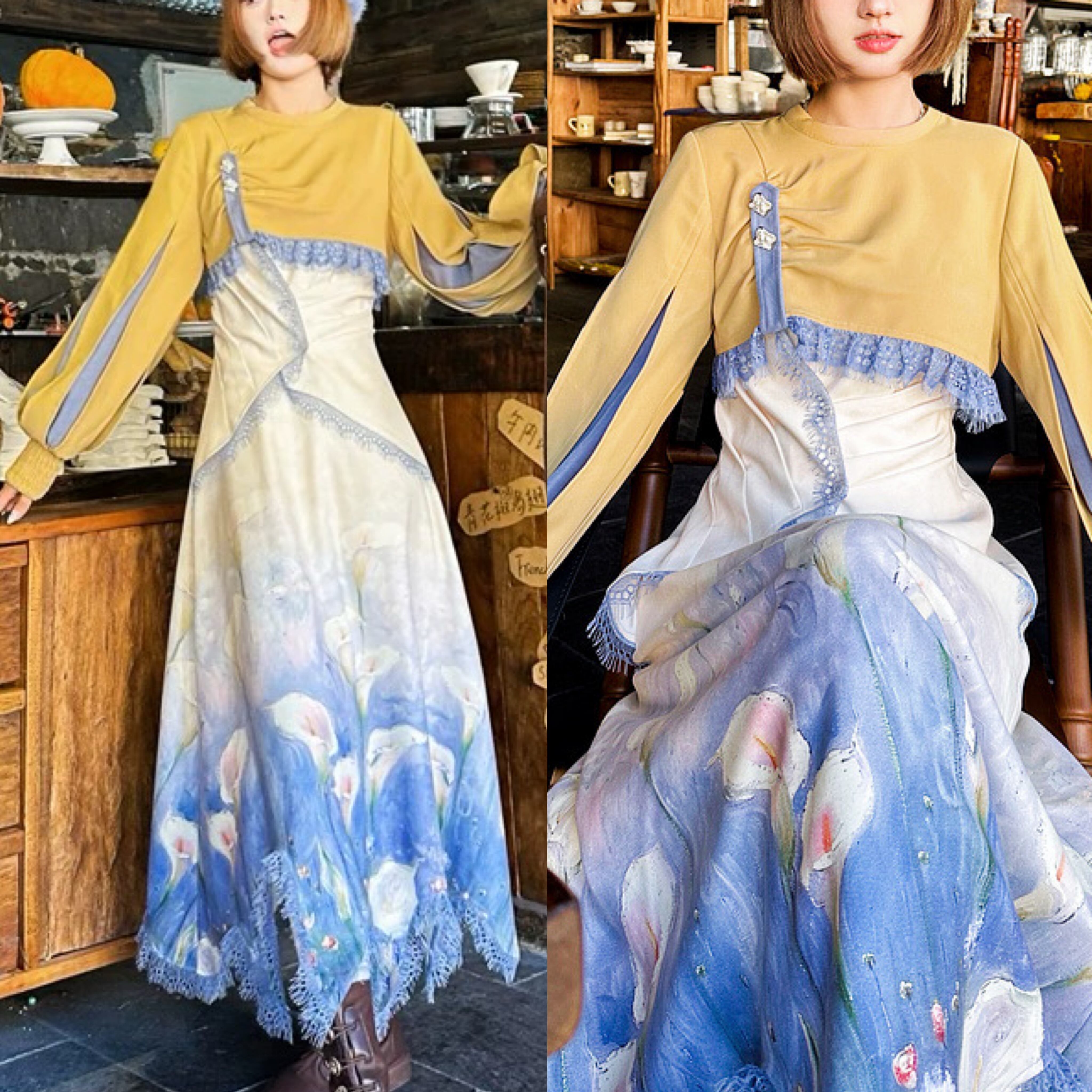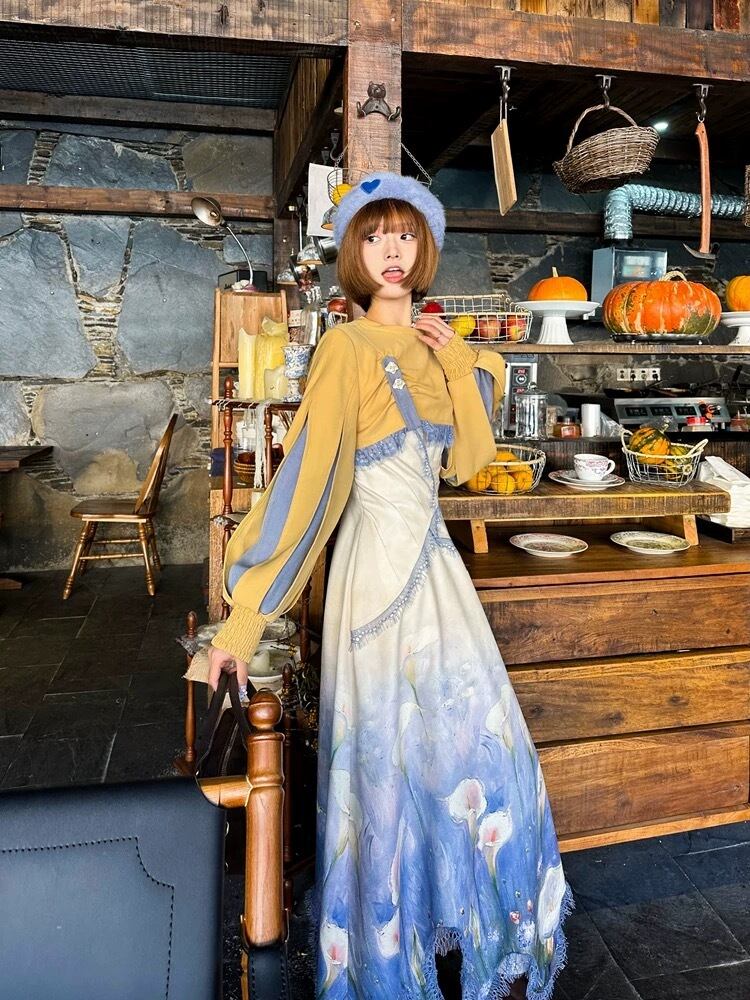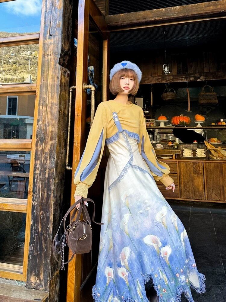 黄色 水色 かわいい 花柄 ガーリ フラワー XL ブラウス グラデーション 水色 ワンピース カラー 原宿 レトロ 古着