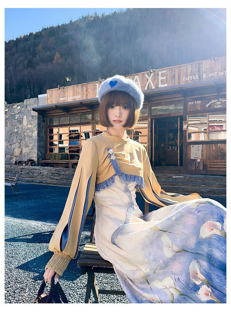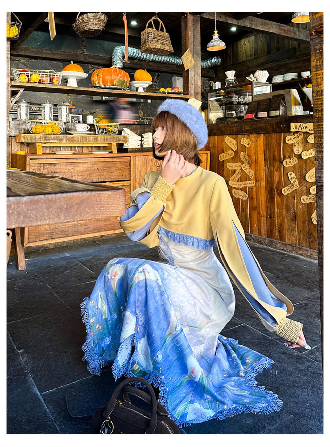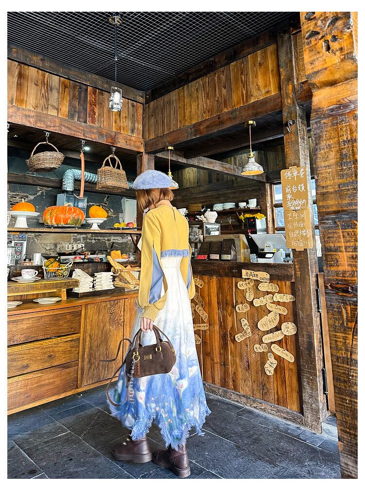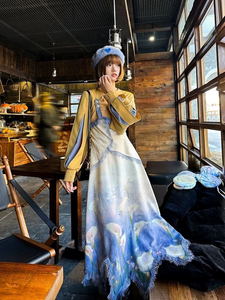 黄色 水色 かわいい 花柄 ガーリ フラワー XL ブラウス グラデーション 水色 ワンピース カラー 原宿 レトロ 古着