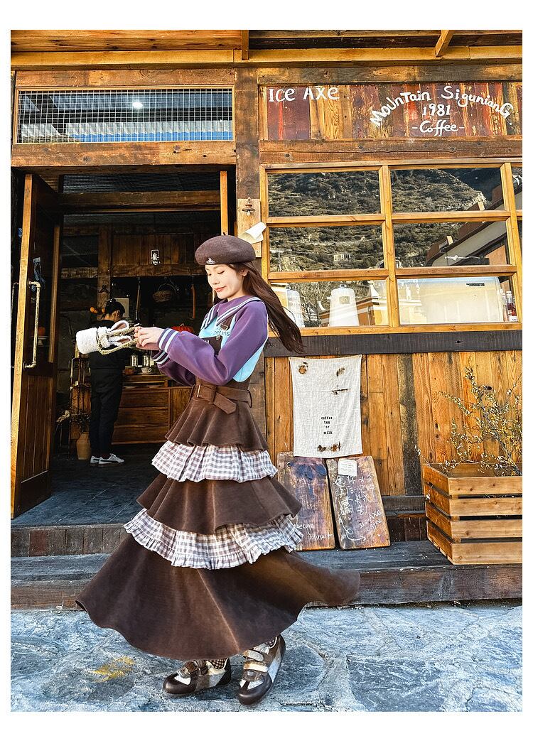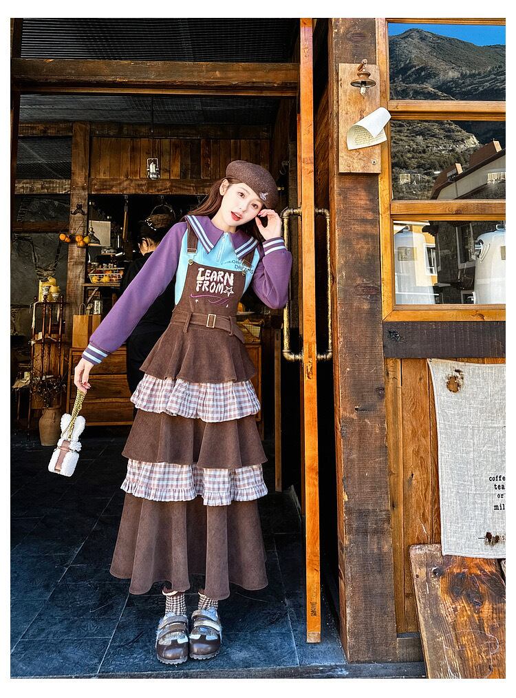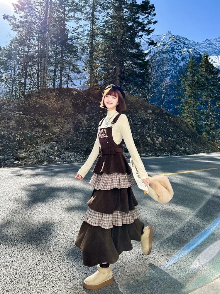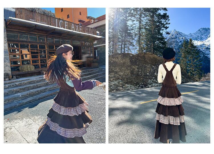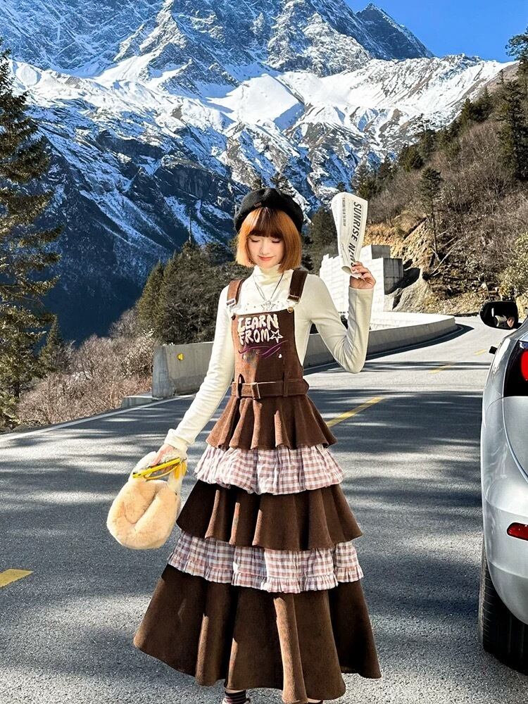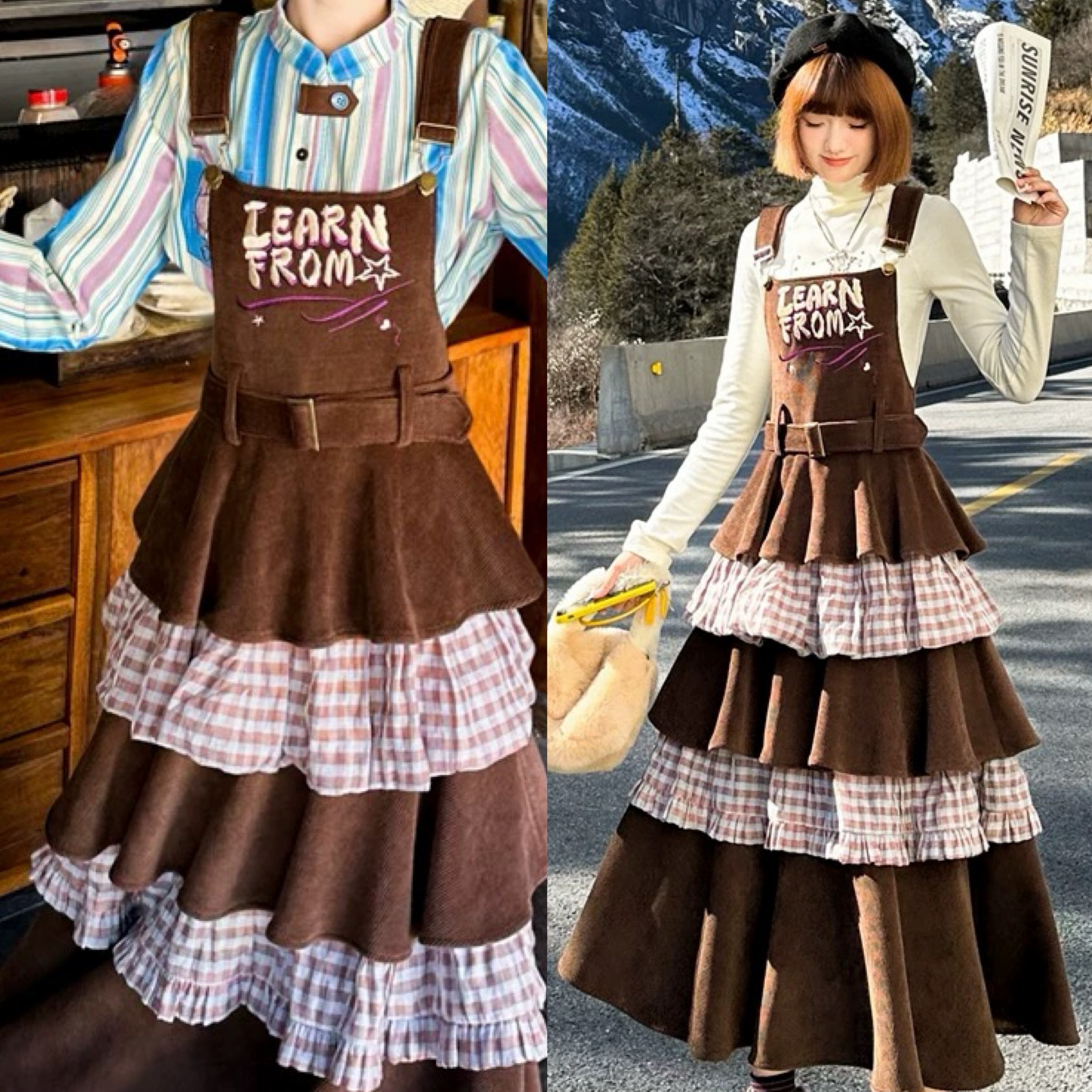 茶色 ジャンバースカート ワンピース フレア ブラウン チェック マキシ スカート カジュアル 原宿 かわいい XL