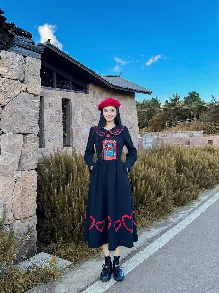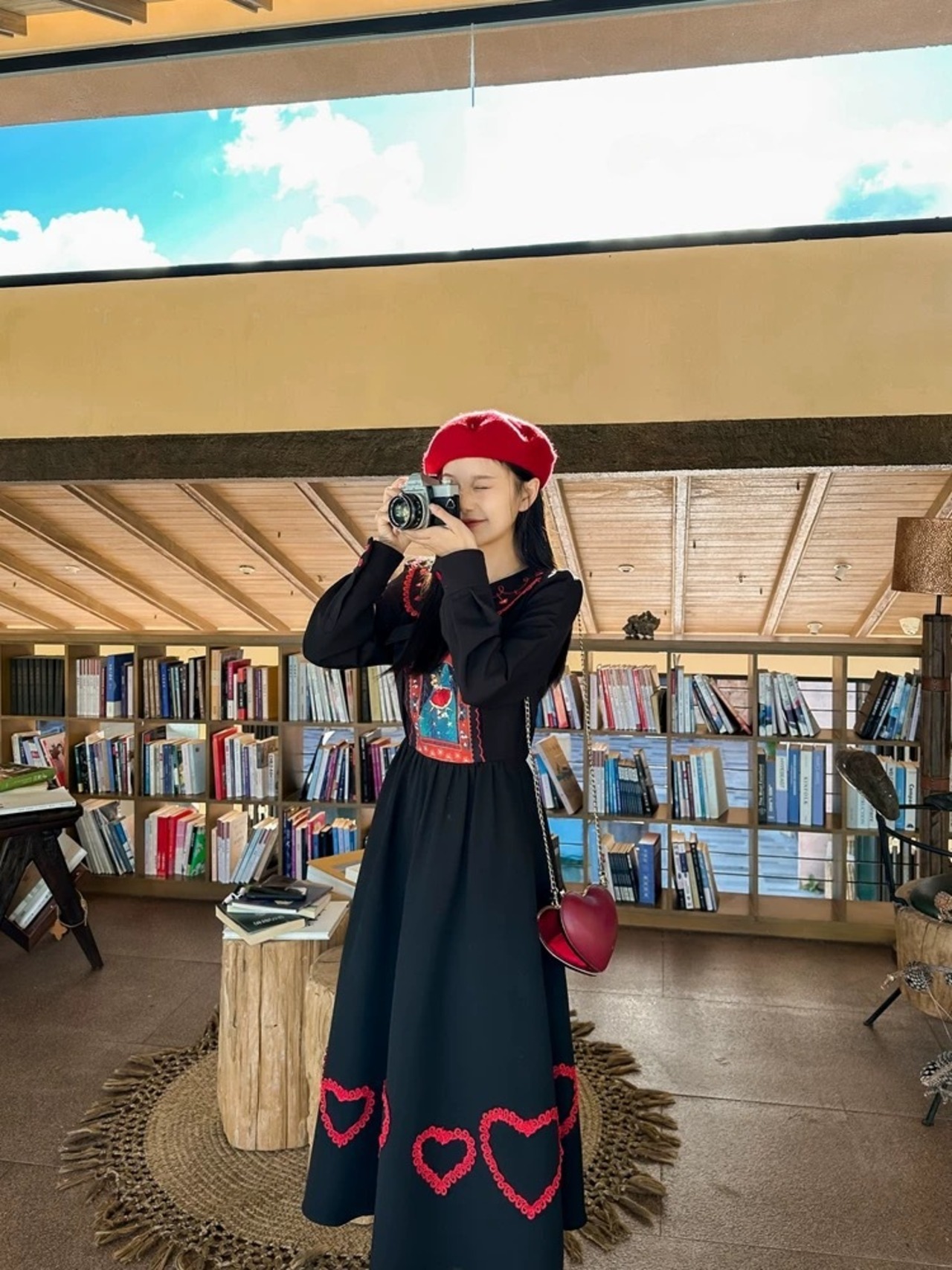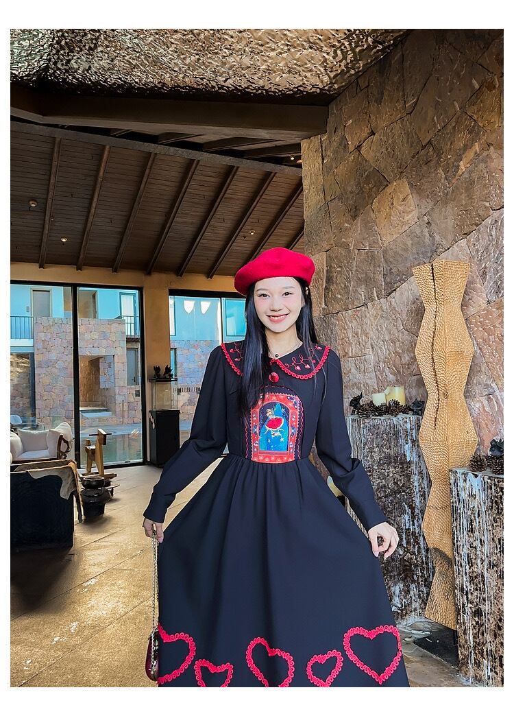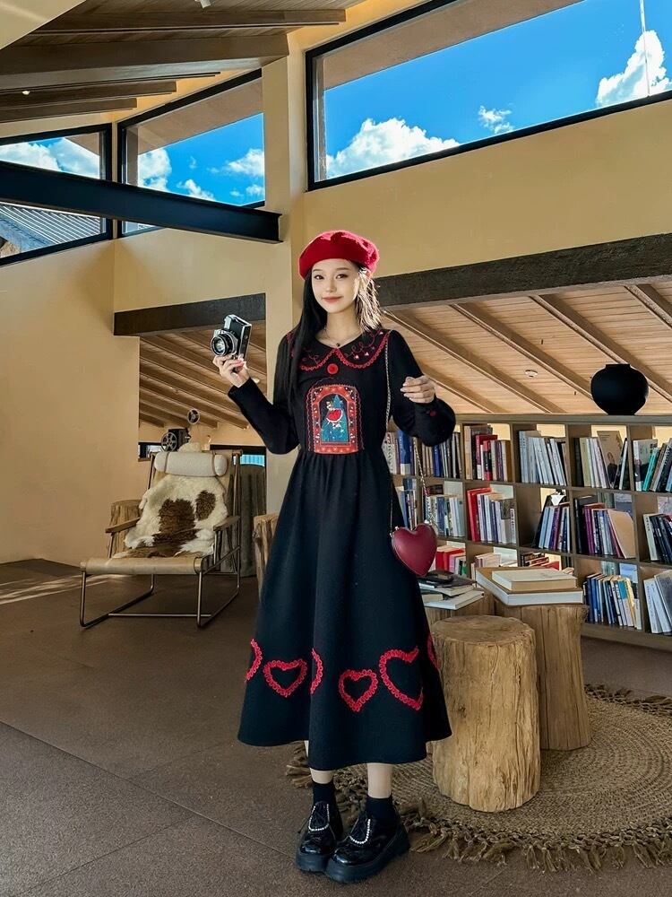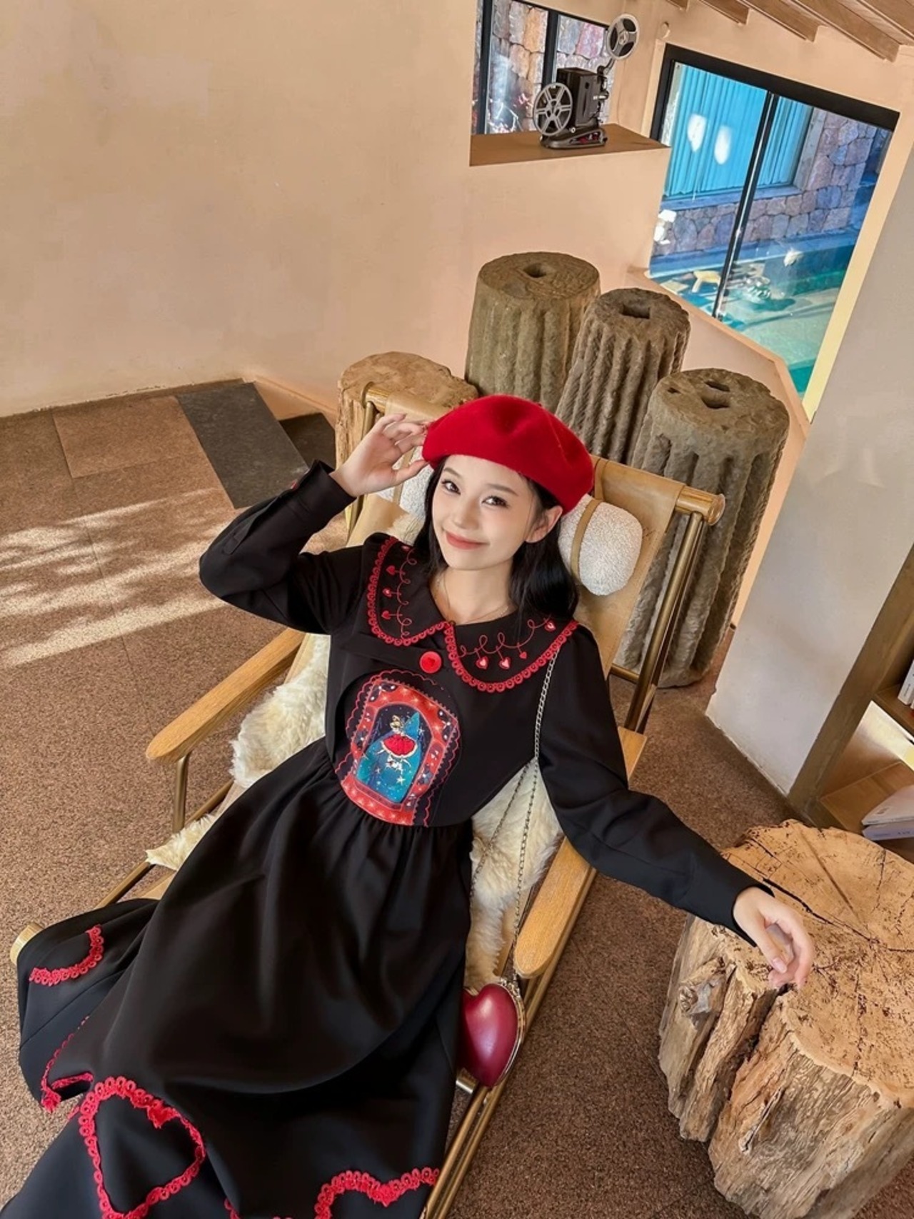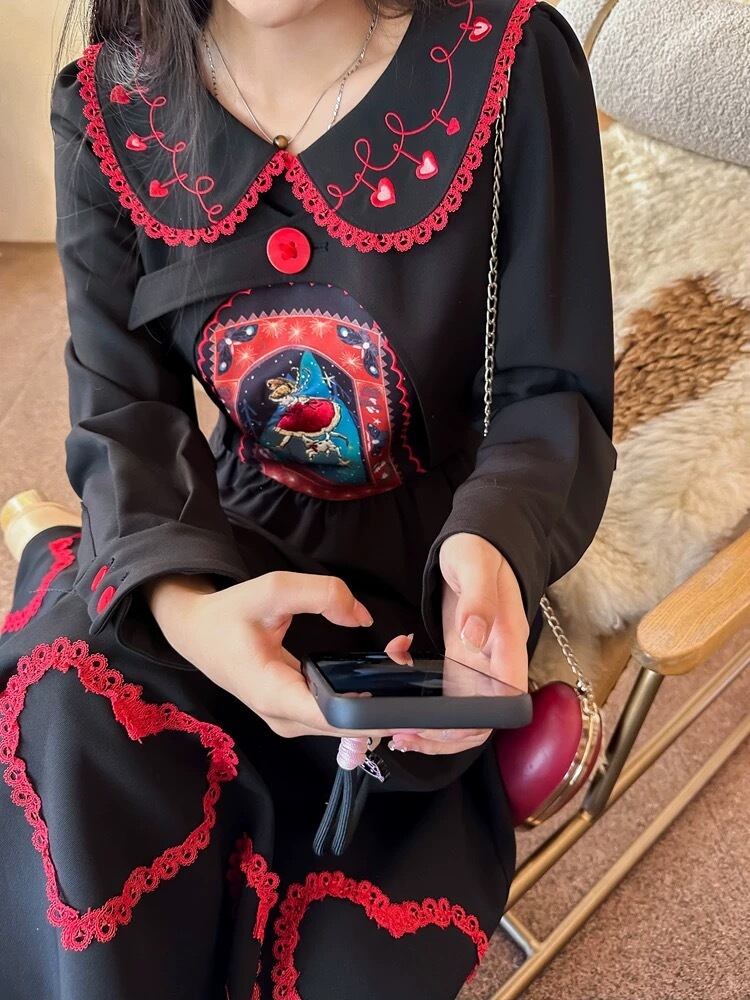 黒 ブラック 赤 ハート 丸襟 ハート XL ガーリー 可愛い フレアスカート ワンピース レトロ 原宿