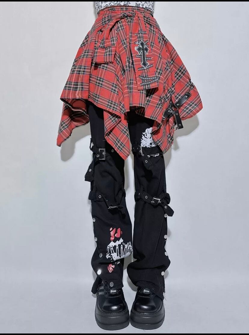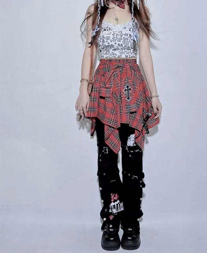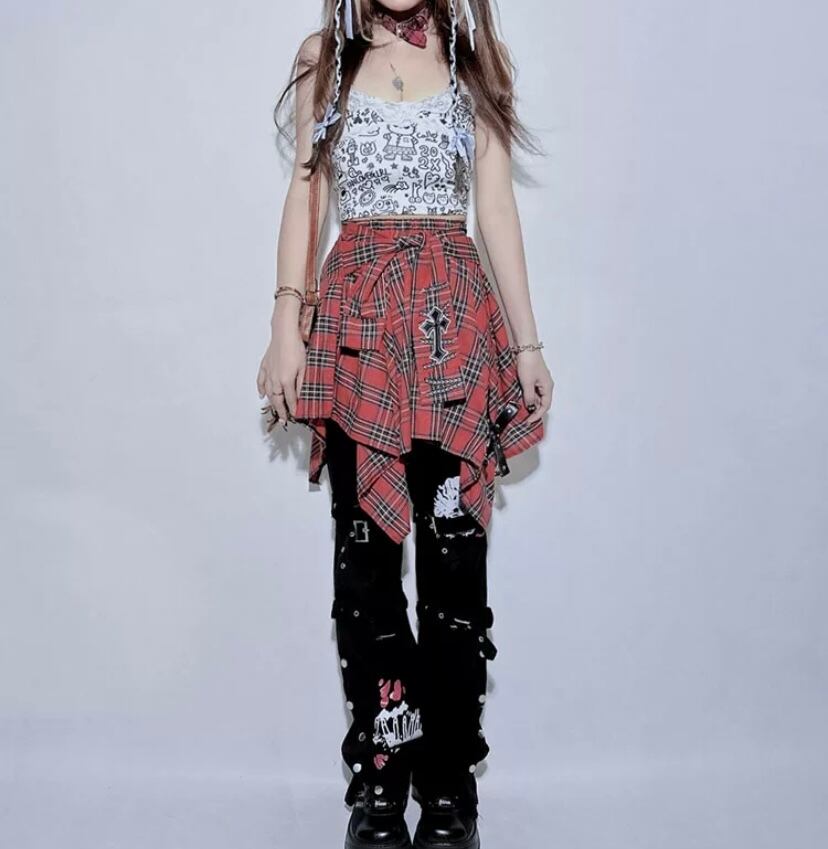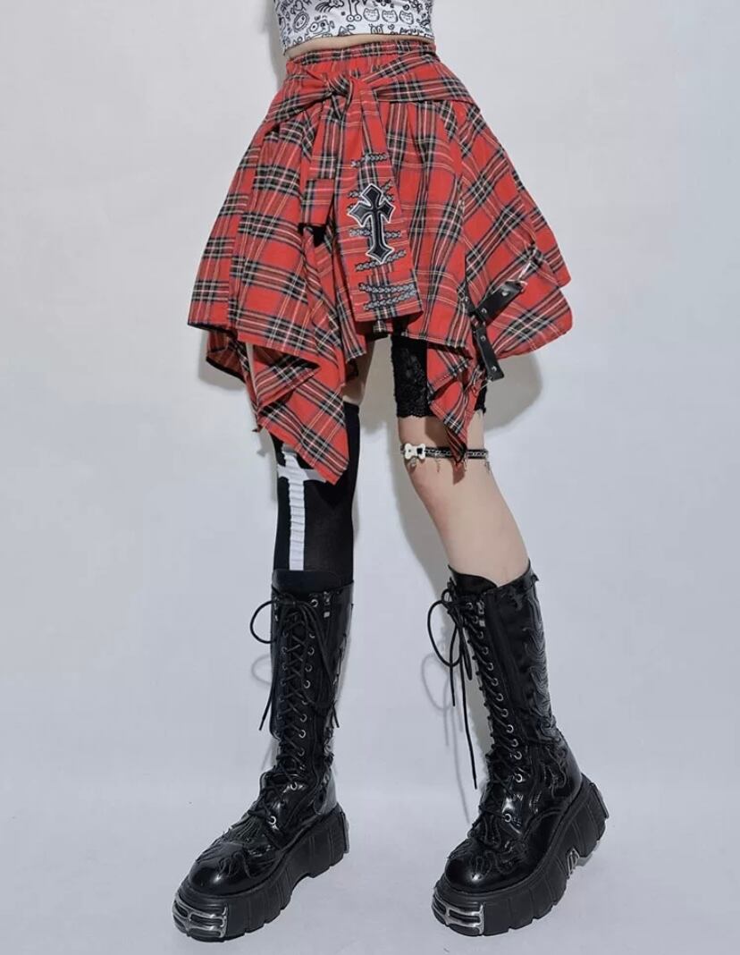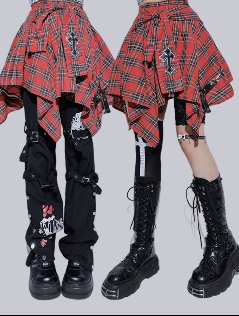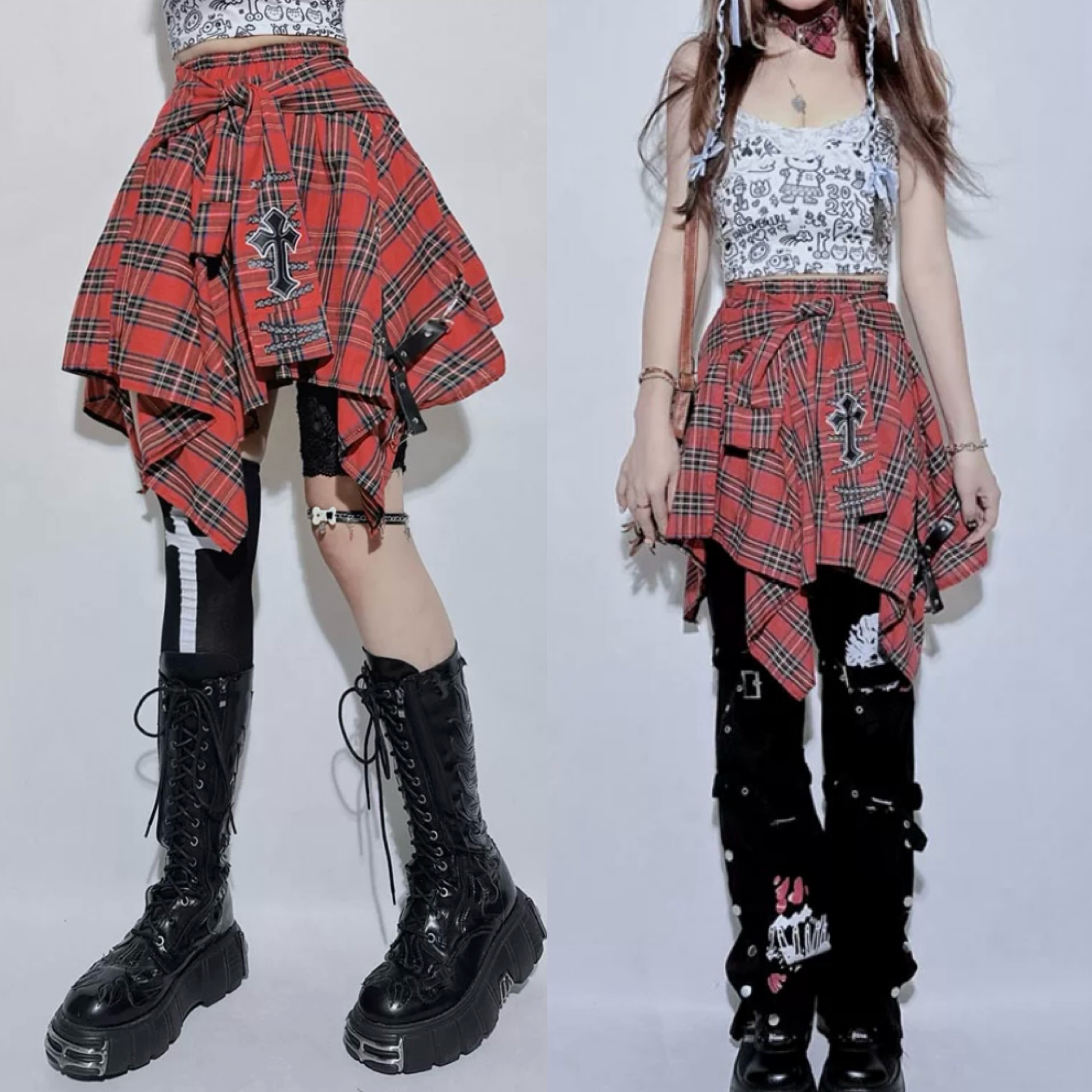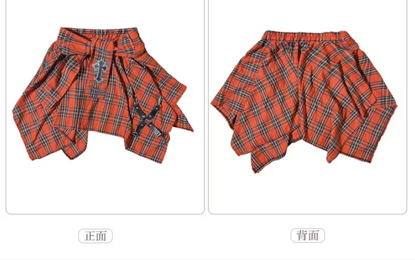赤 チェック ロック イギリス クロス ボトムス ミニスカート 原宿 パンク ロック ガーリー シャツ ネルシャツ