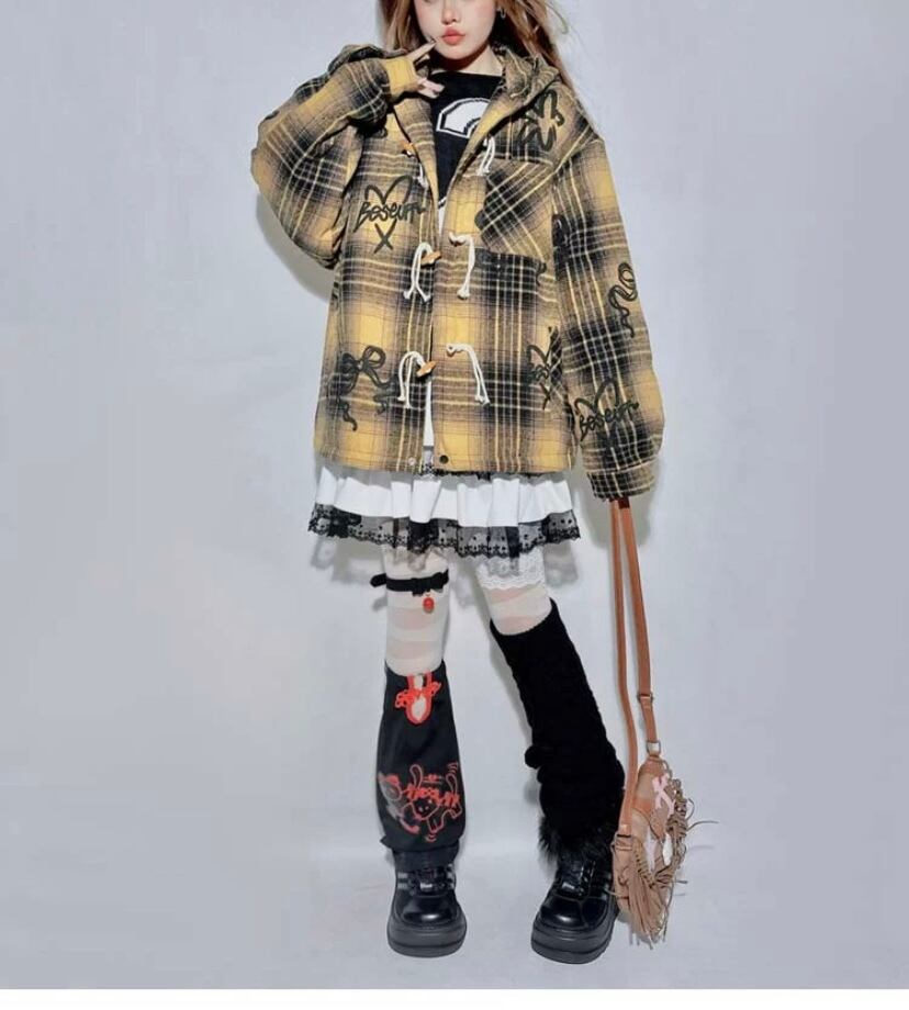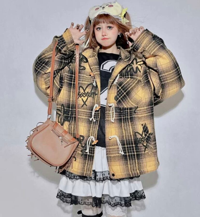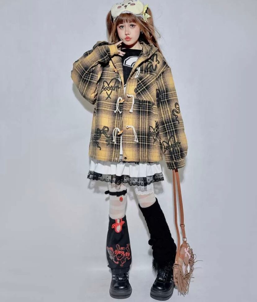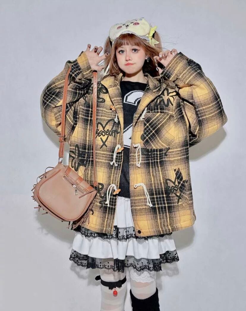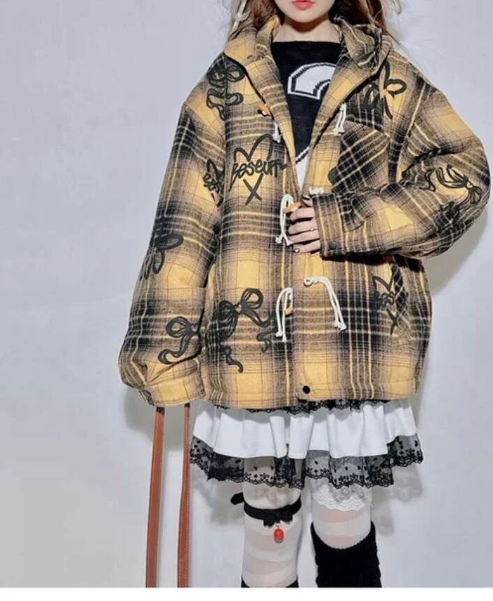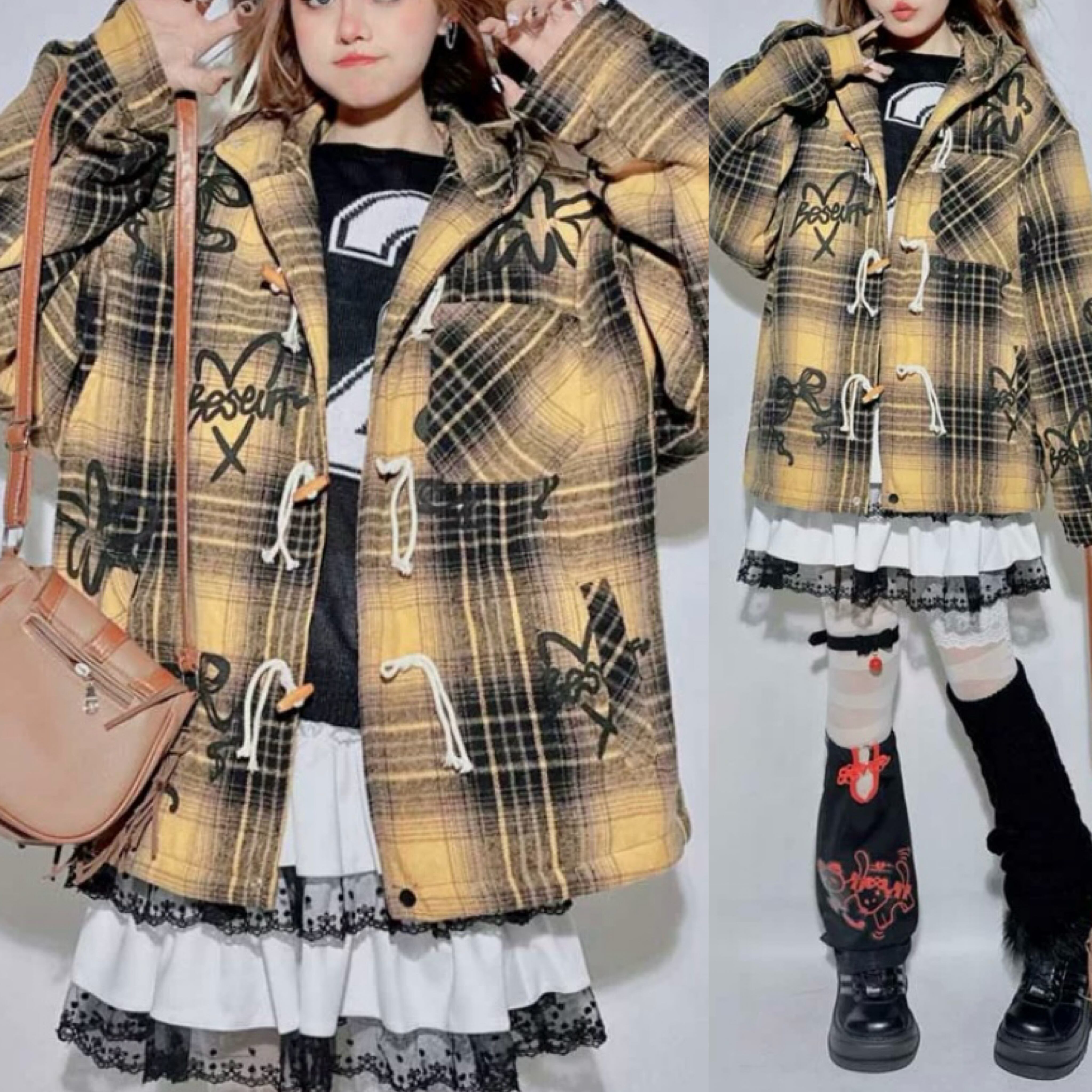 黄色 黒 アウター チェック ジャケット コート カーディガン 原宿 かわいい ブルゾン