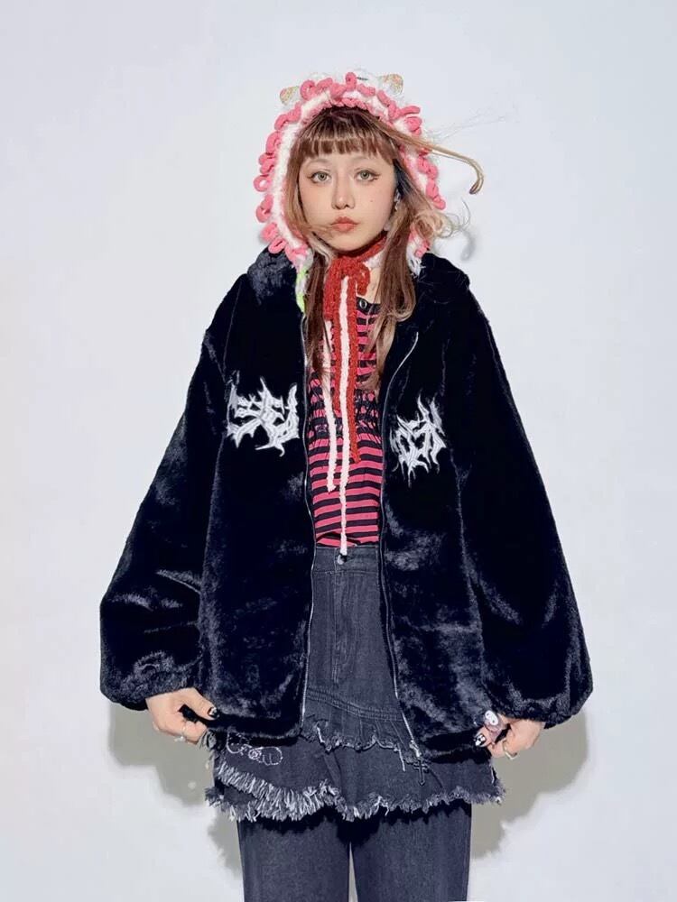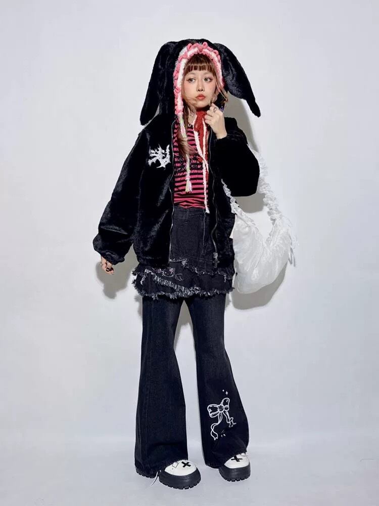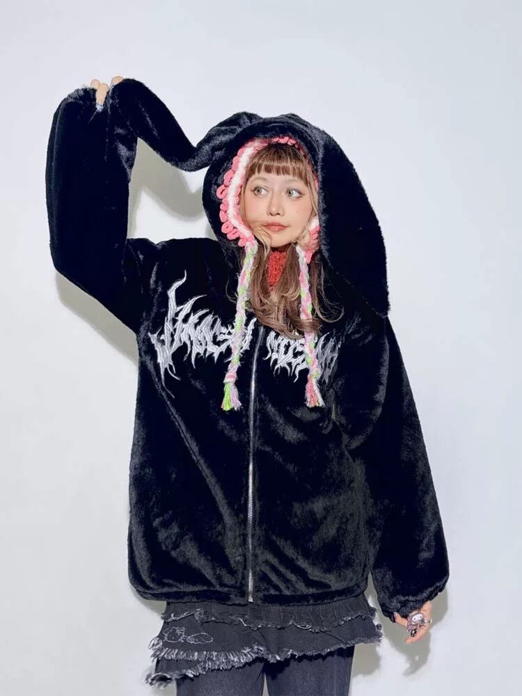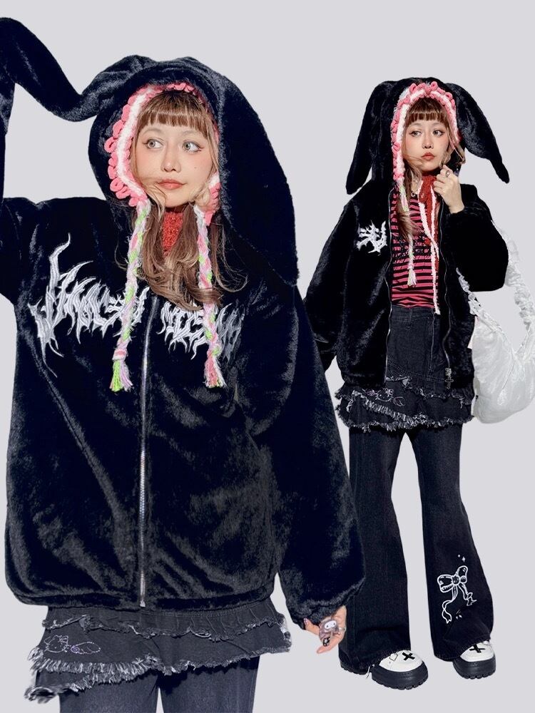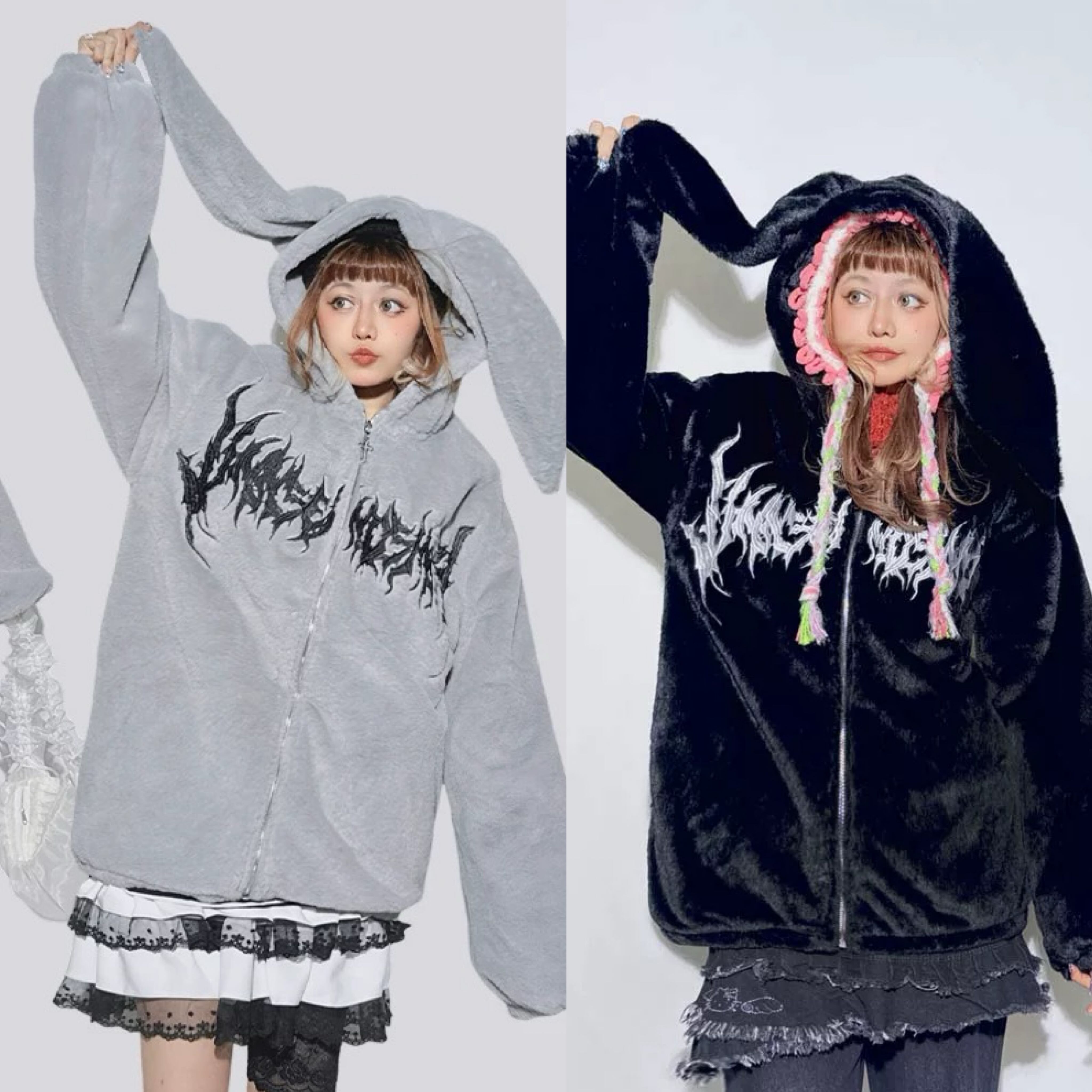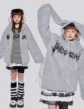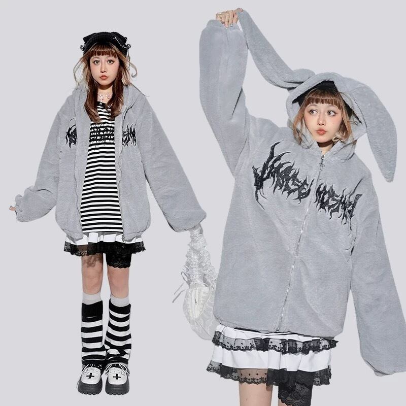 グレー 黒 うさぎ 耳 うさみみ パーカー フリース スウェット カジュアル アウター ジャンバー コート かわいい 原宿
