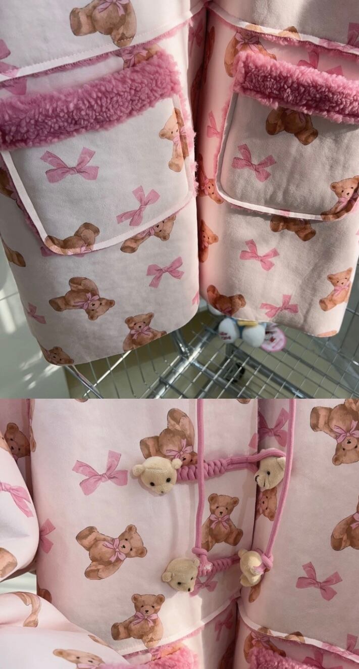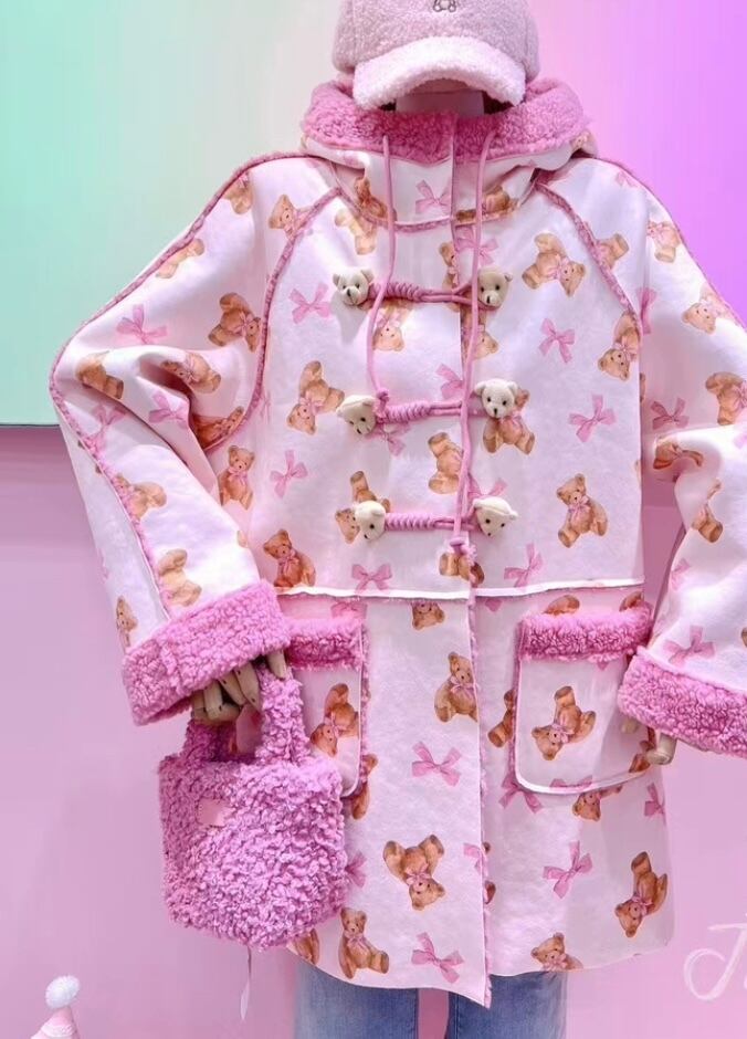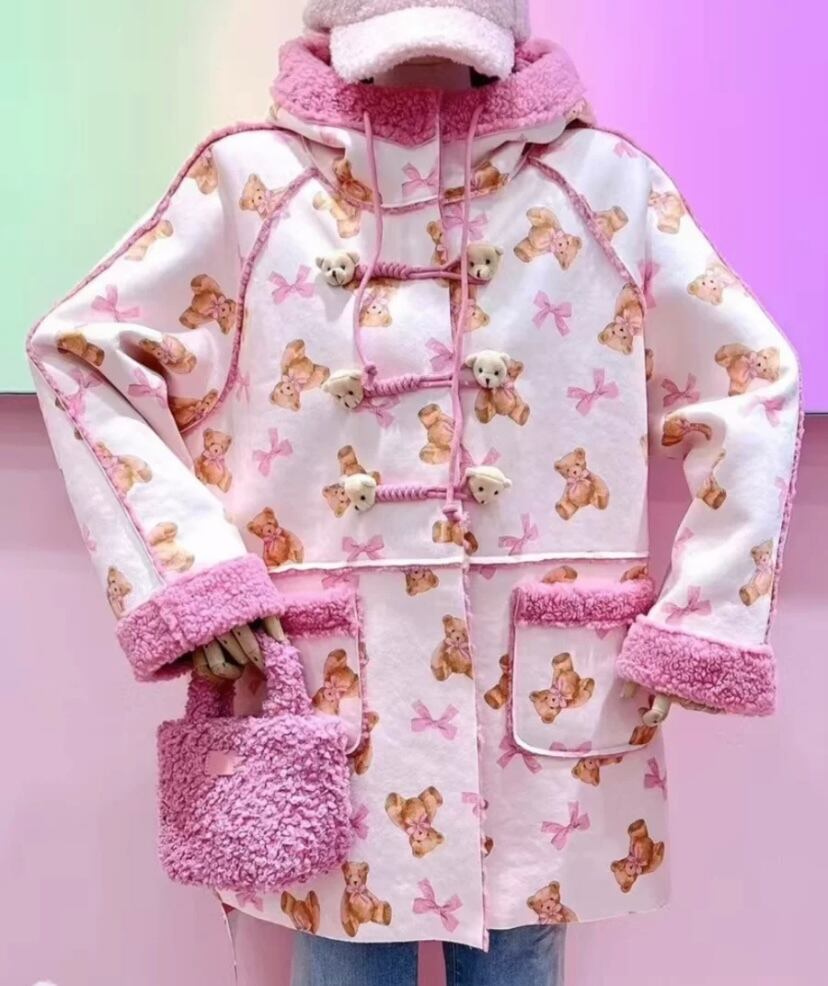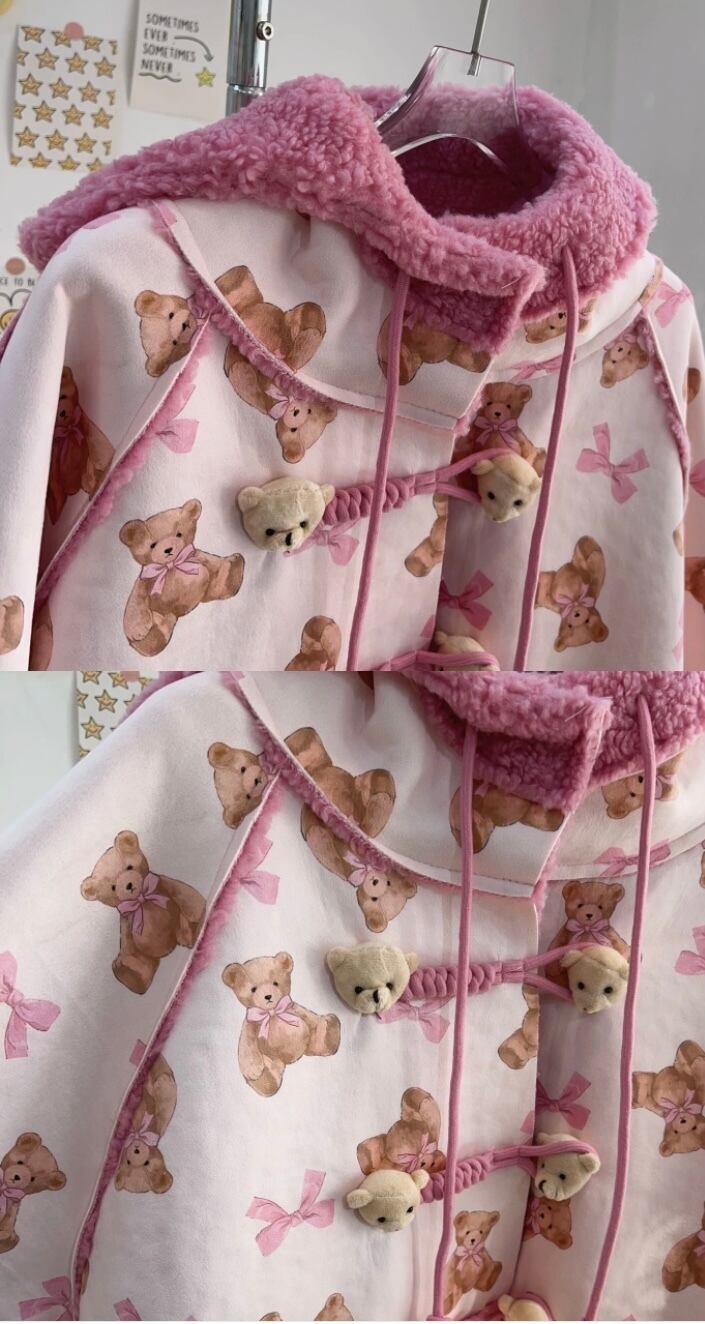 ピンク パーカー フード フリース 熊 くま ジャケット アウター 原宿 ピンク 可愛い 人形 ぬいぐるみ 茶色 フード付き ポケット カーディガン アウター ジャケット
