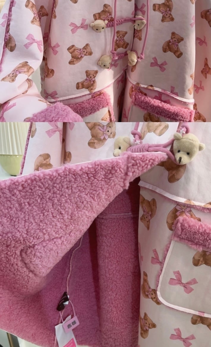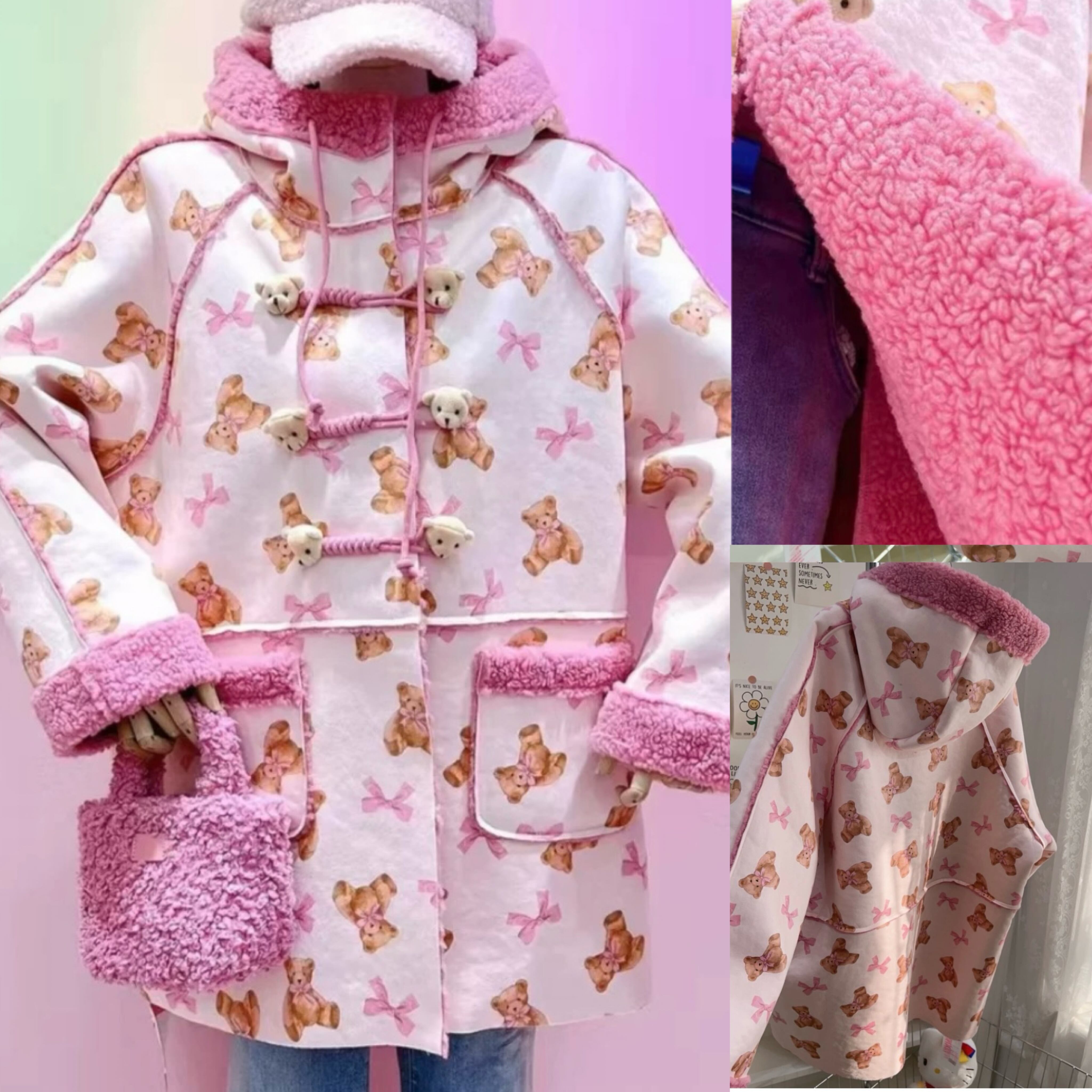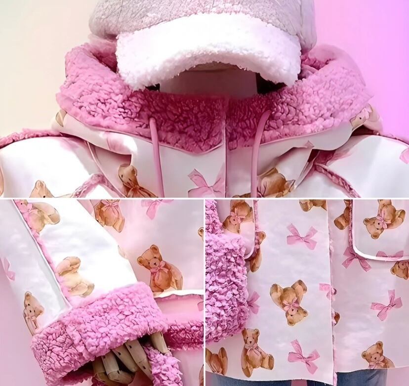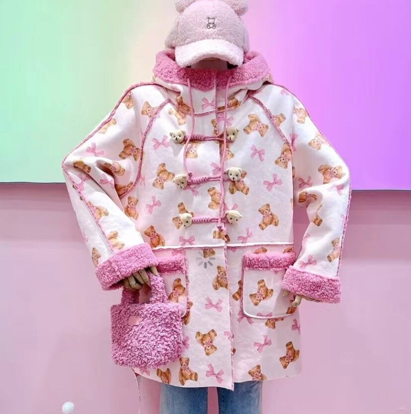 ピンク パーカー フード フリース 熊 くま ジャケット アウター 原宿 ピンク 可愛い 人形 ぬいぐるみ 茶色 フード付き ポケット カーディガン アウター ジャケット