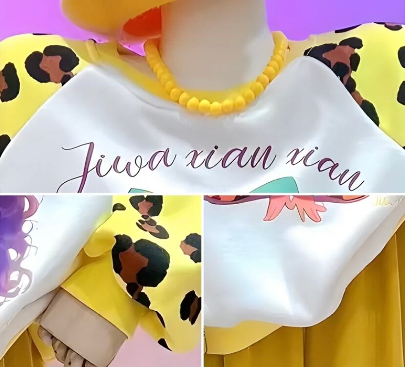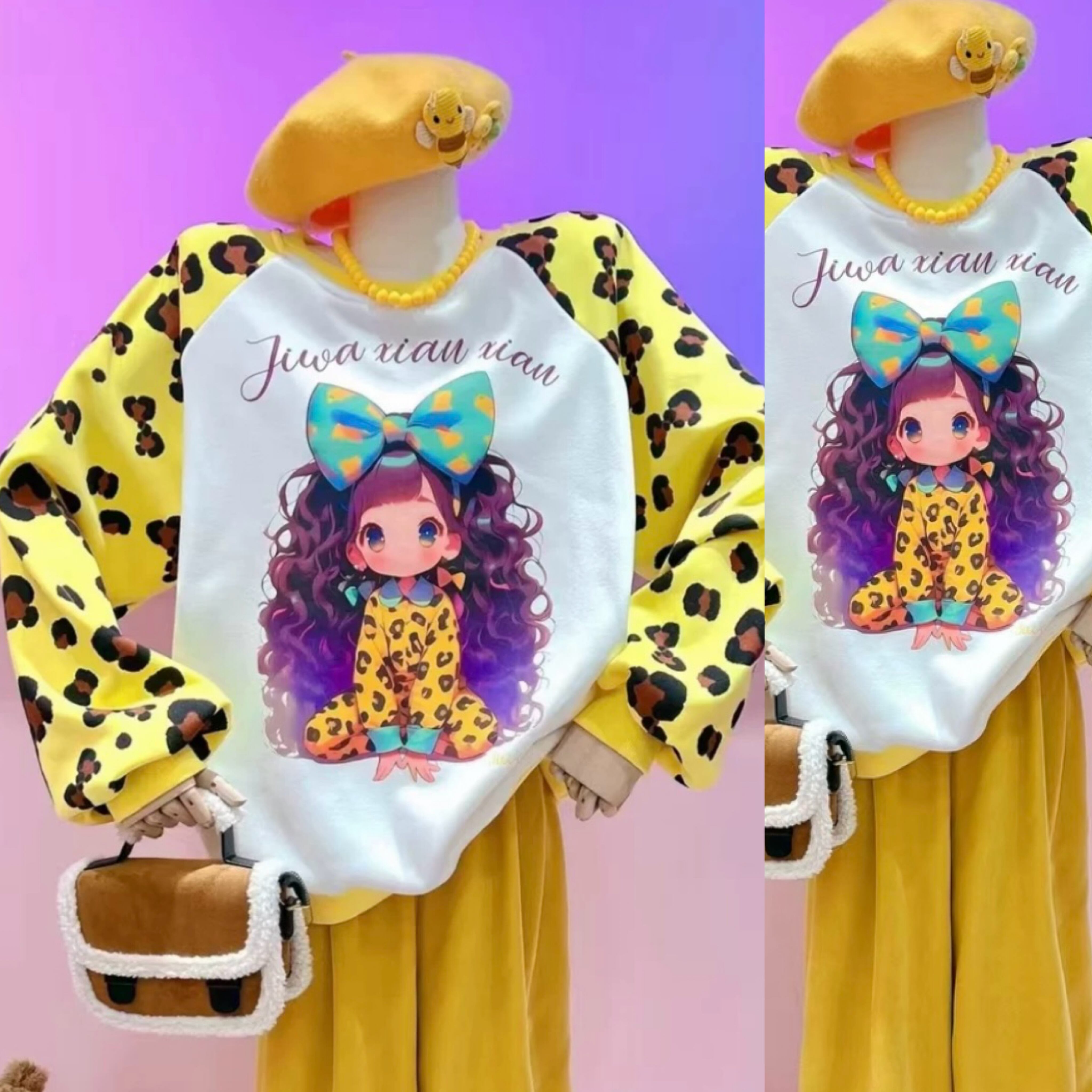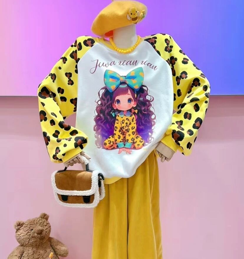 黄色 レオパード 豹柄 可愛い ガーリー リボン 人形 Tシャツ カジュアル ブラウス ストリートリー 原宿 派手