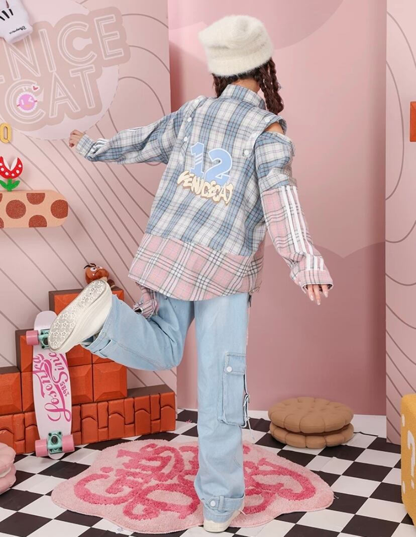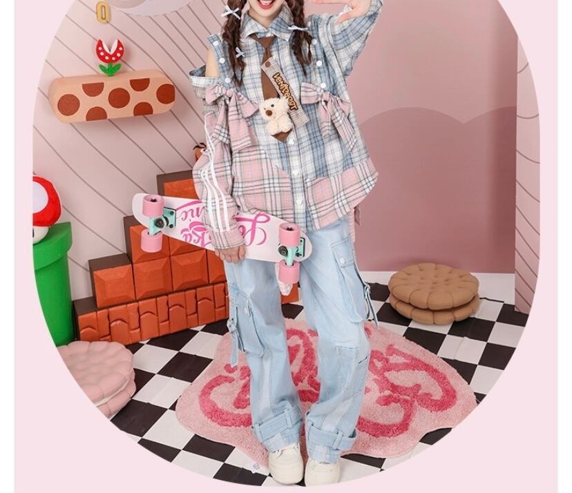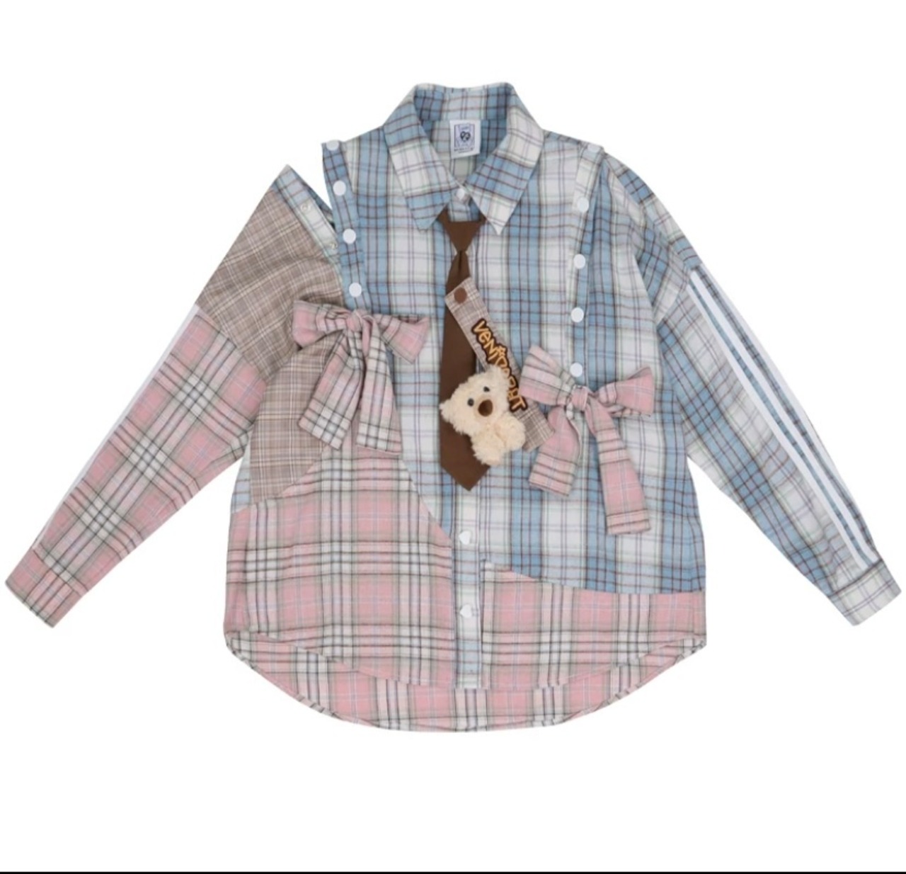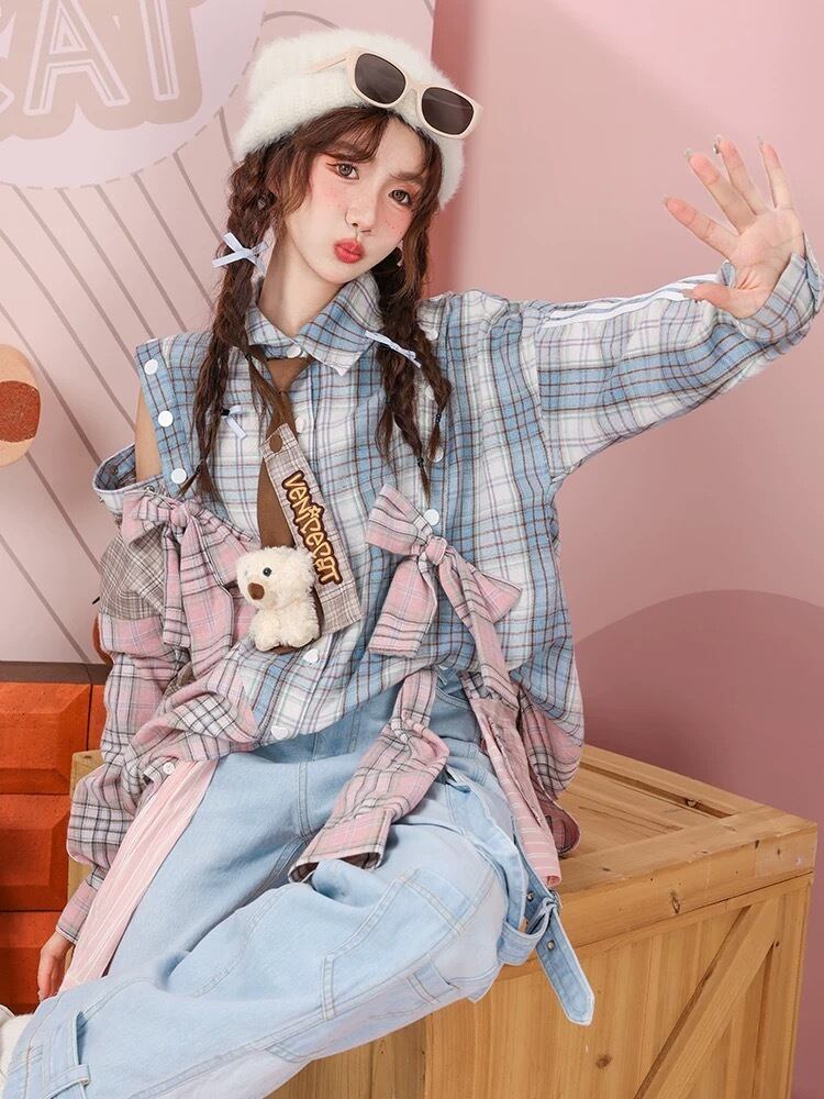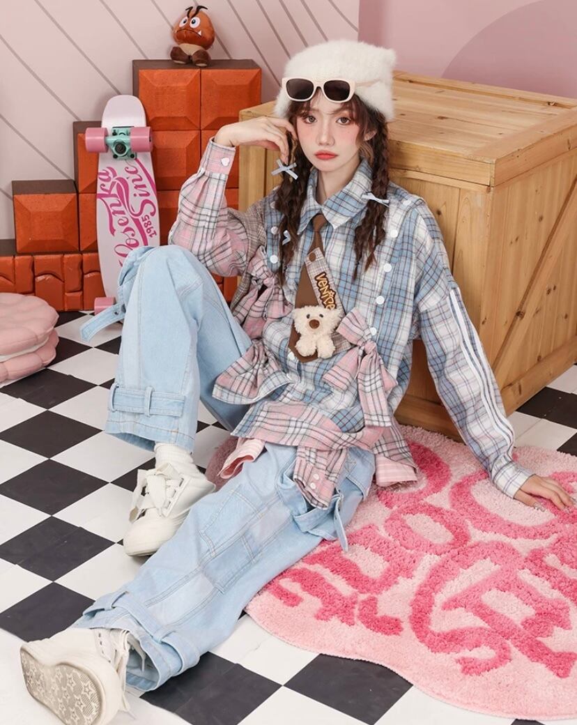 水色 ピンク チェック リボン シャツ アウター トップス ネルシャツ オフィシャルダ 熊 ガーリー かわいい 原宿