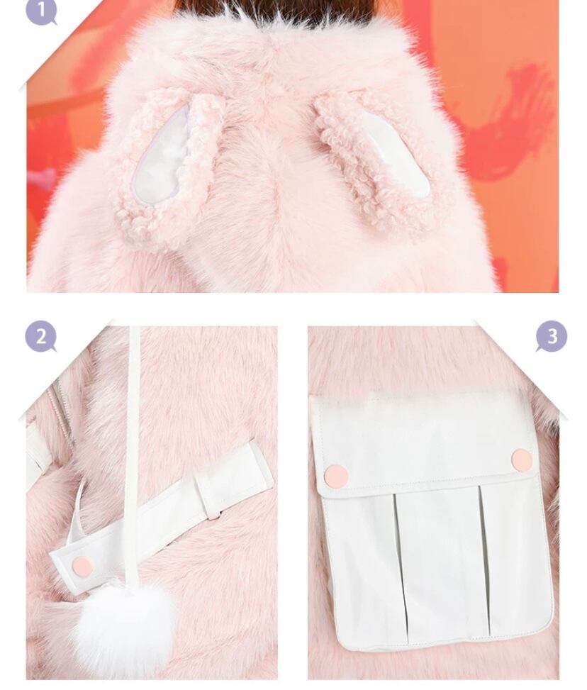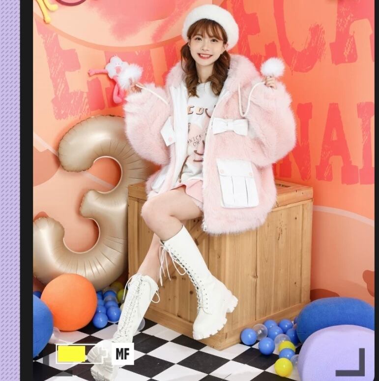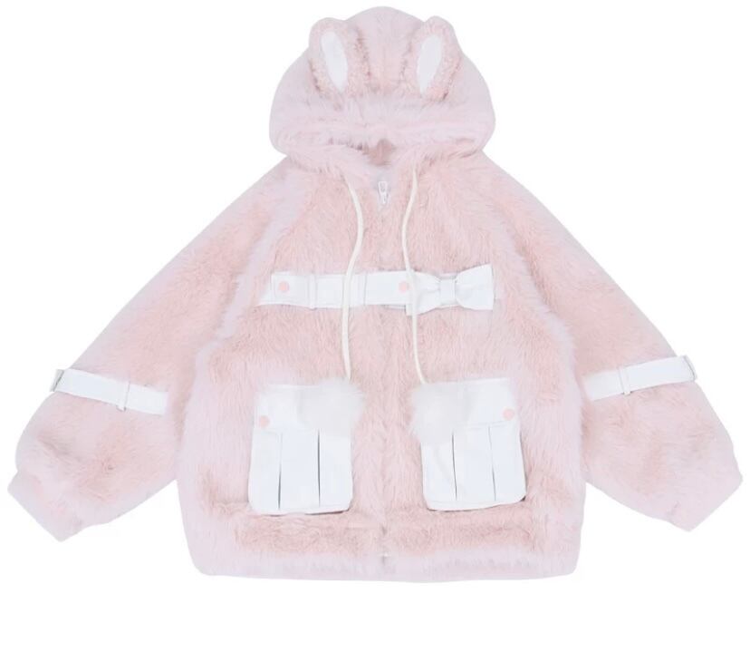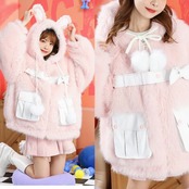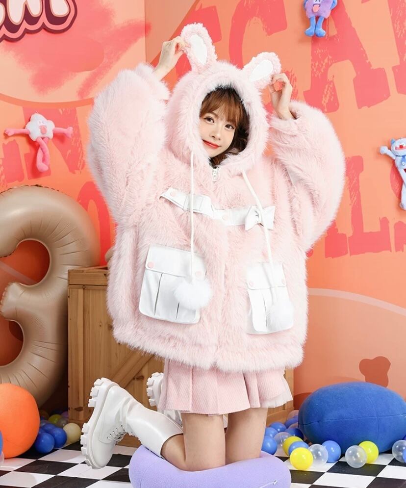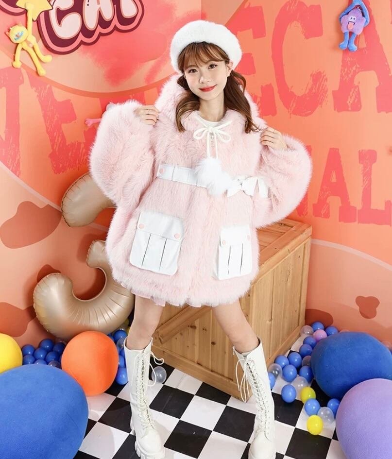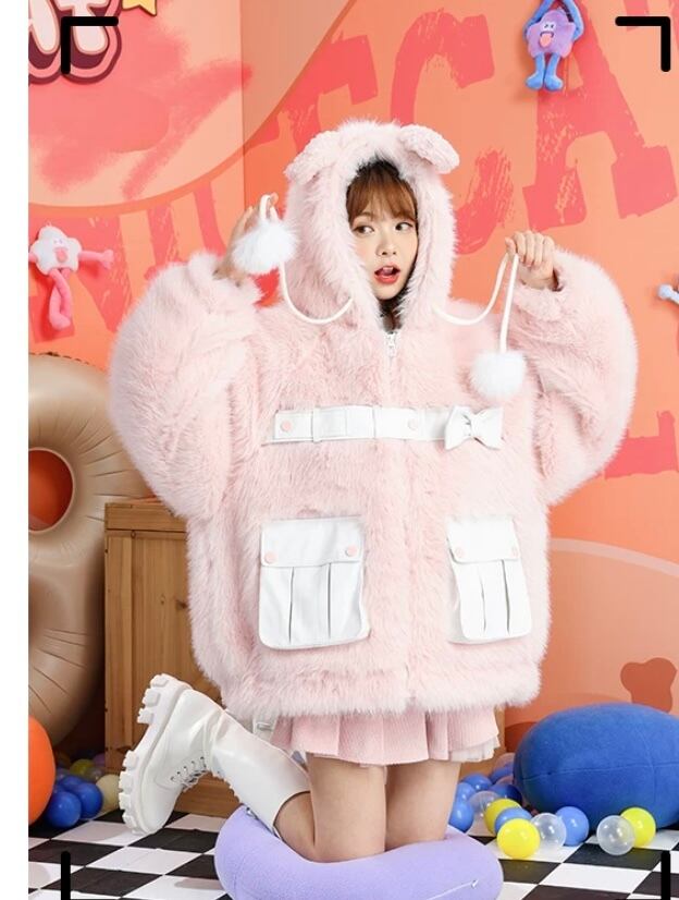 ファーコート ピンク ポンポン アウター ジャケッ うさぎ ジャケット ピンク 白 ポケット ガーリー フード パーカー カーディガン 可愛い 姫 原宿 アニメ 秋葉原 ダウンコート