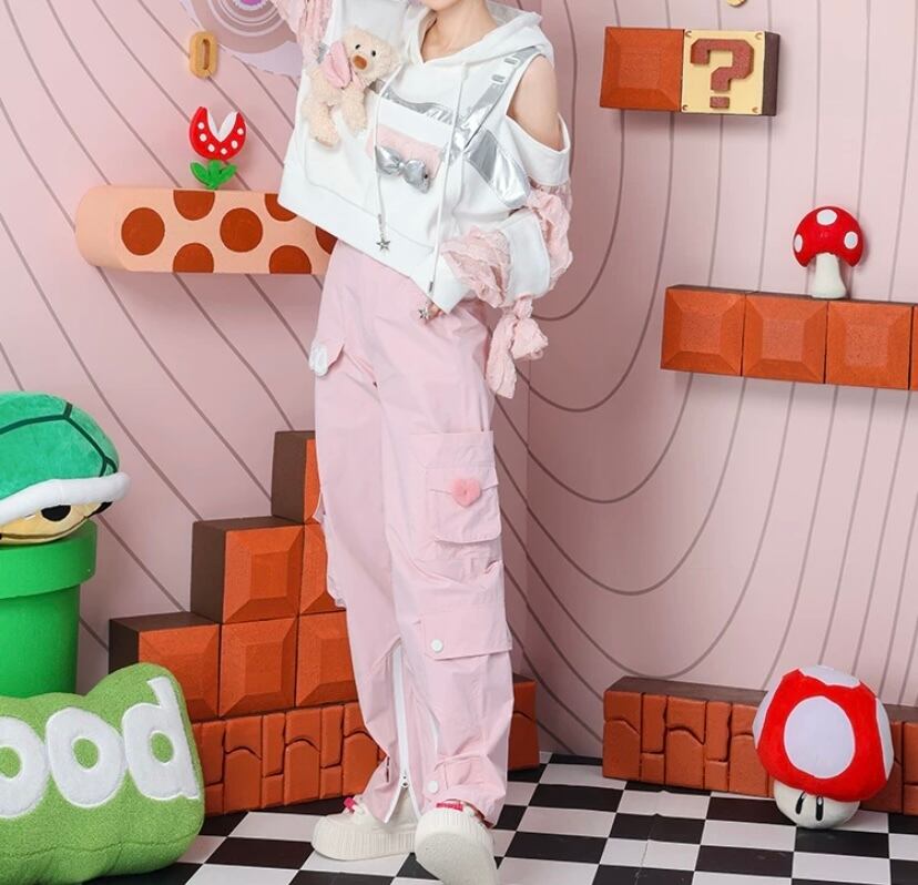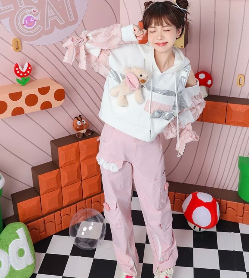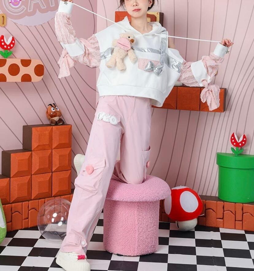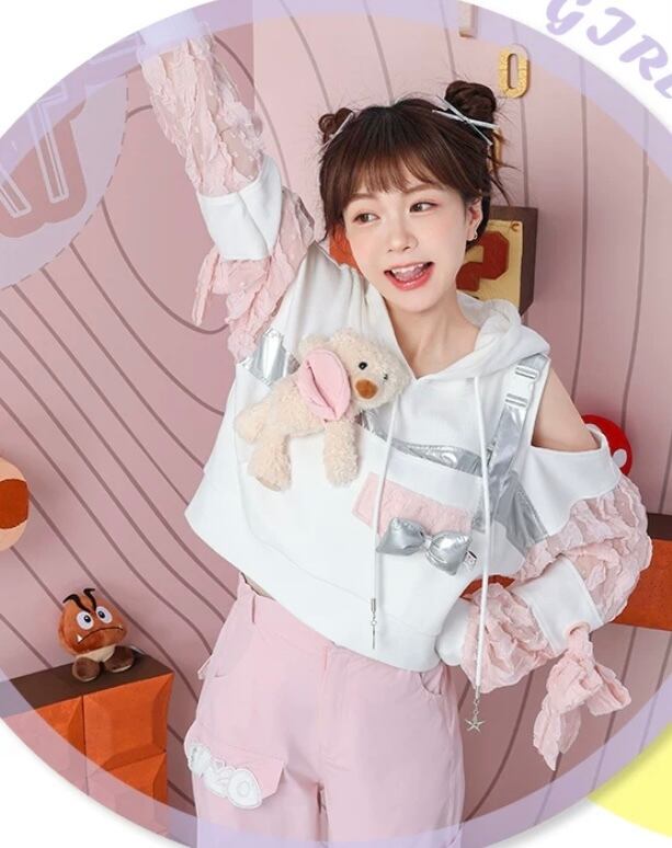 パーカー 白 スウェット ピンク シルバー オフショルダー フード スウェット カジュアル ガーリー 原宿 白 ピンク くまさん トップス