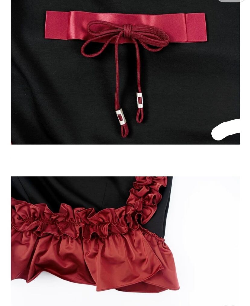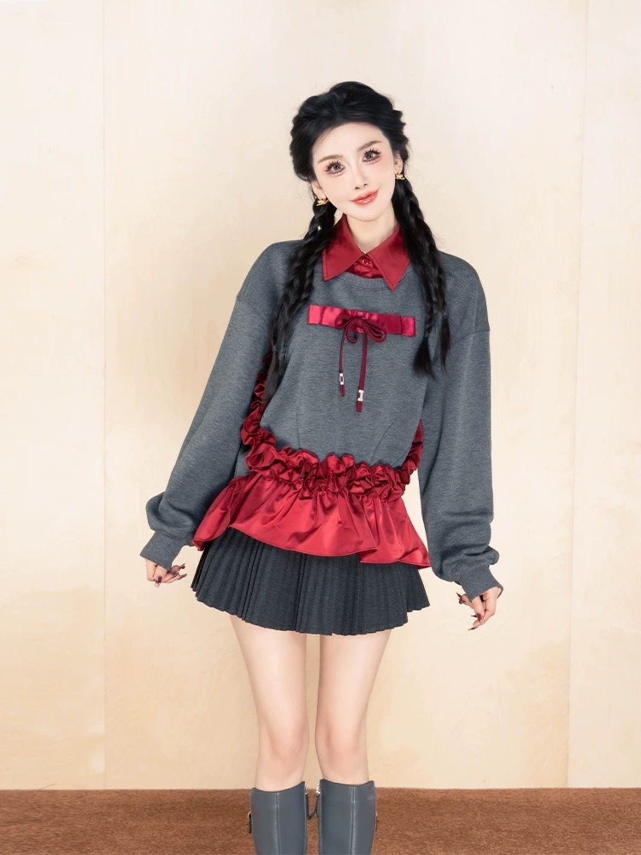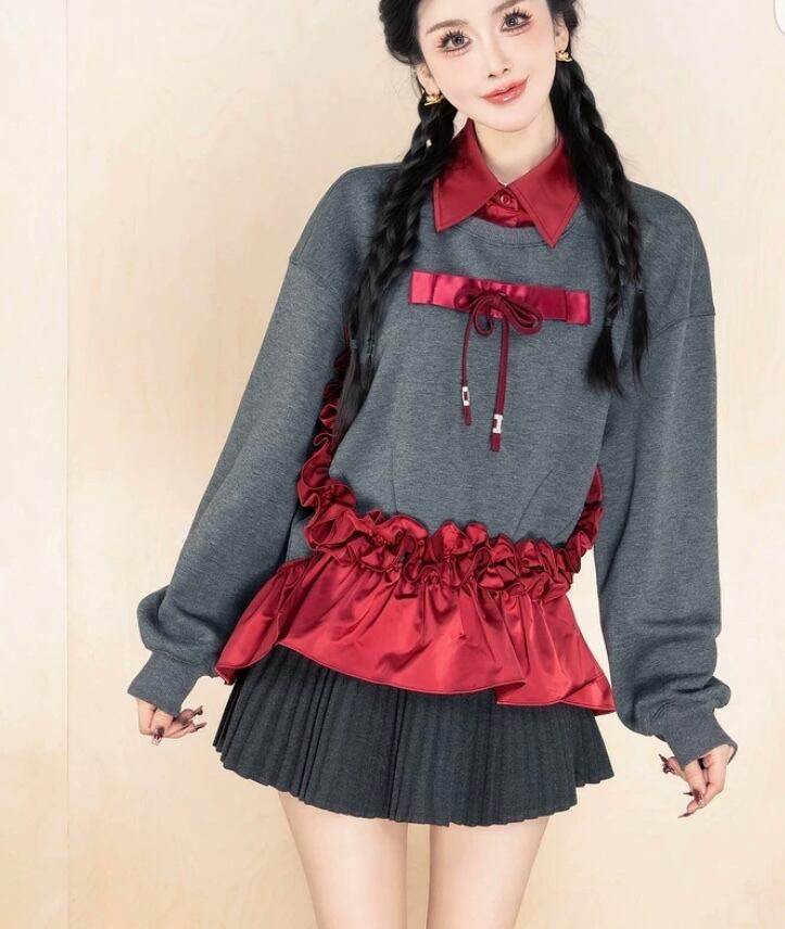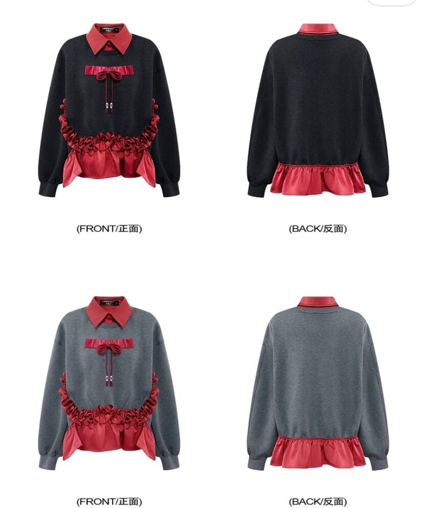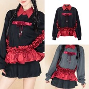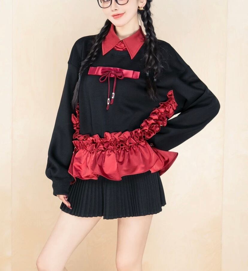 黒 グレー 赤 スウェット トレーナー えり ブラウス フリル チャイナ 中華風 黒 赤 リボン トップ ブラウス パーカー トレーナー 原宿 渋谷 カジュアル