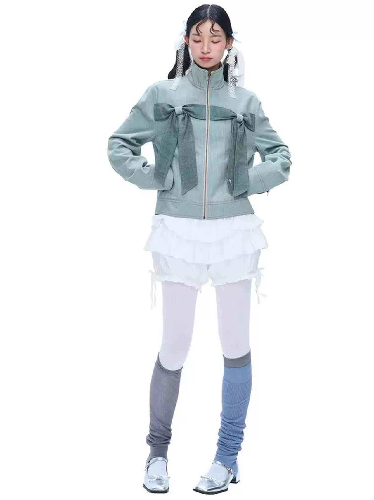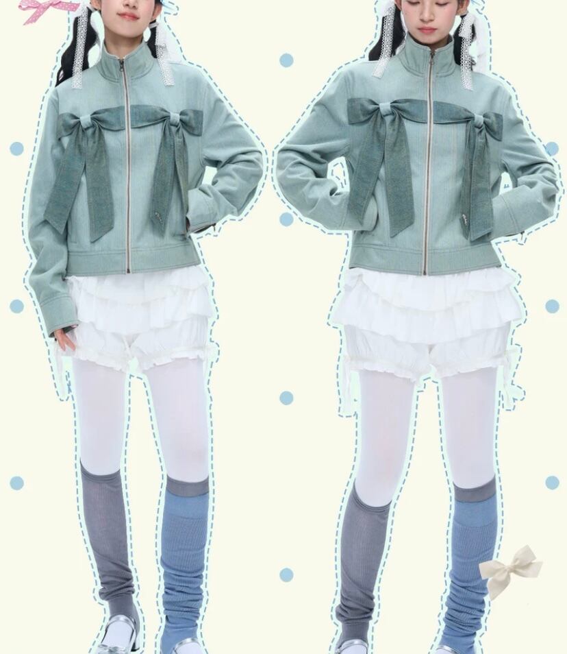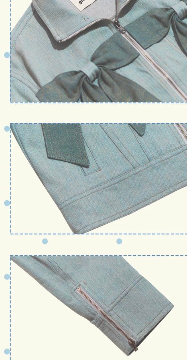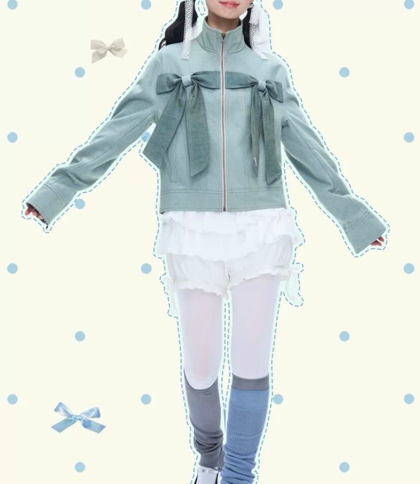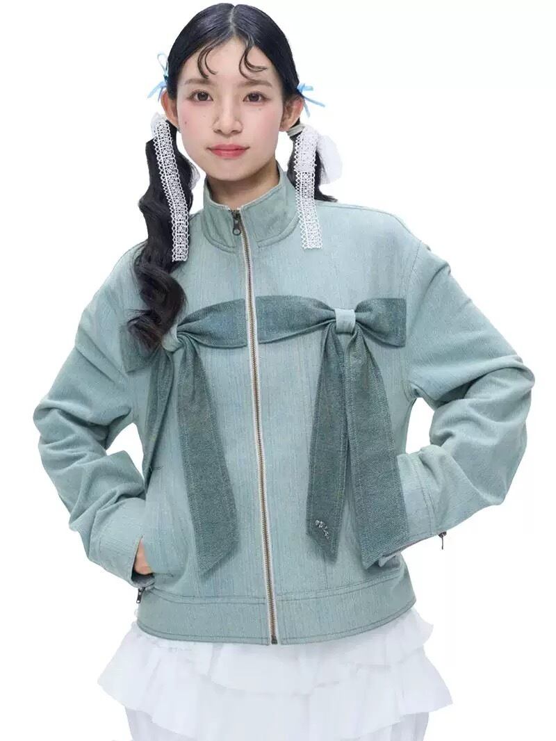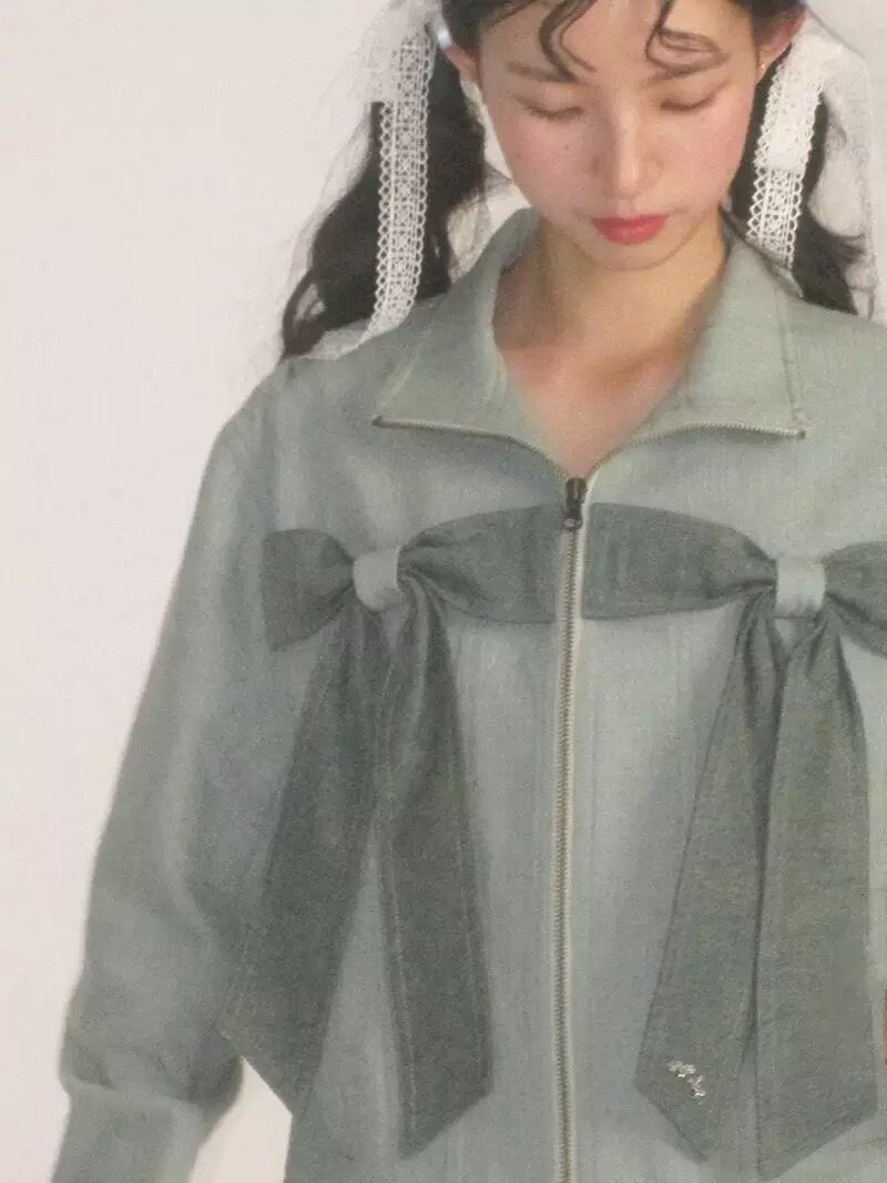 緑 水色 リボン ジャケット コート アウター グリーン デニム カーディガン トップス ガーリー スタジャン ジャン バイク 原宿