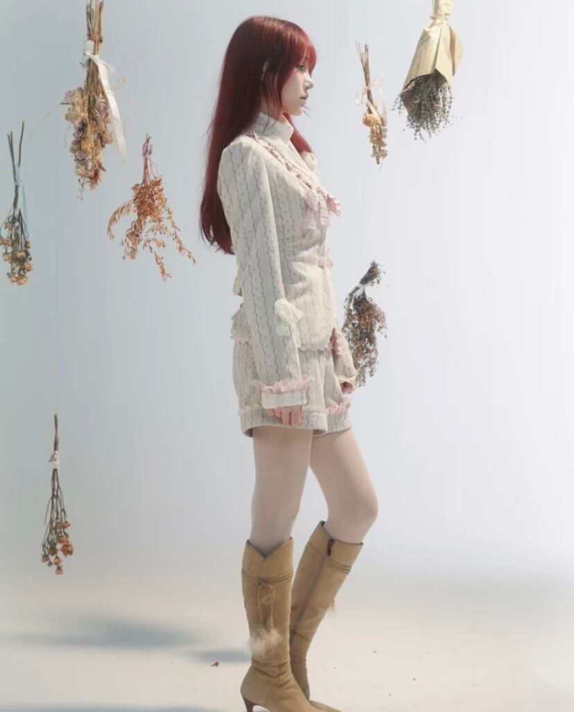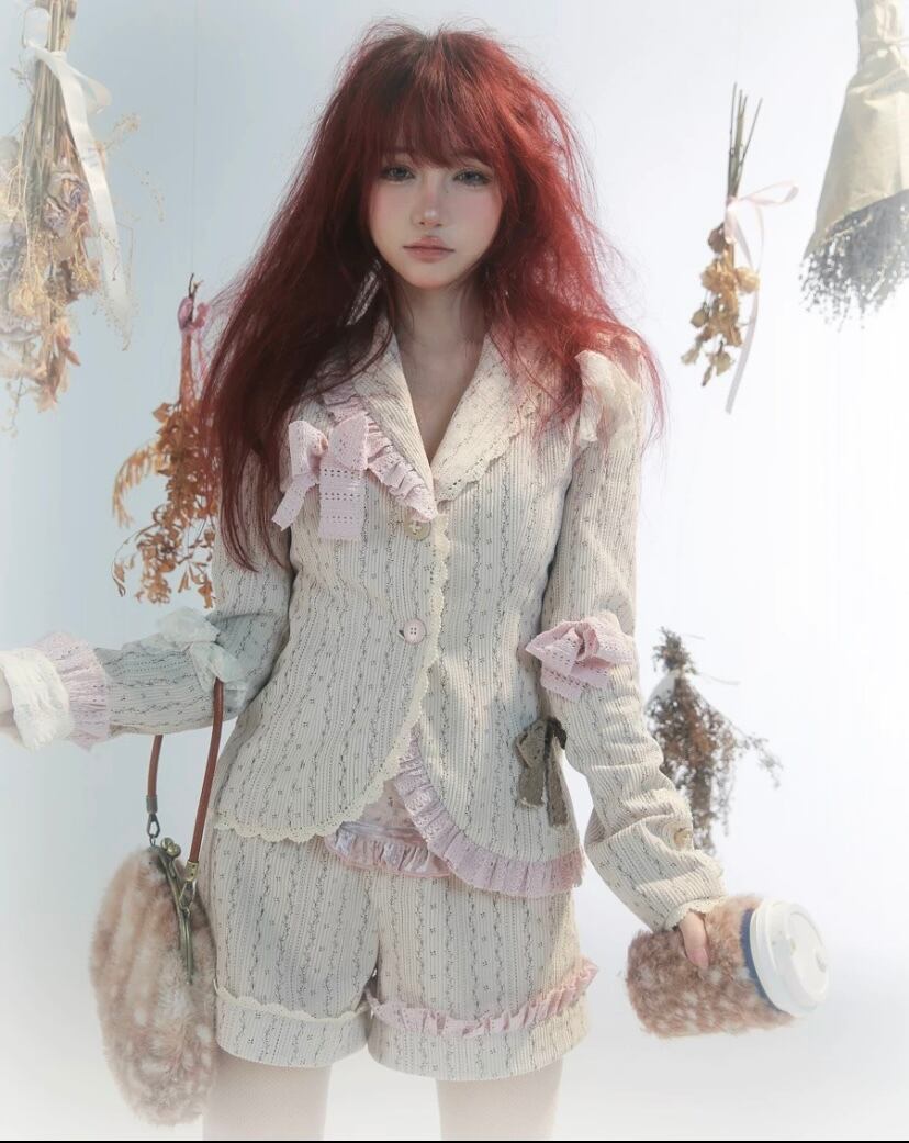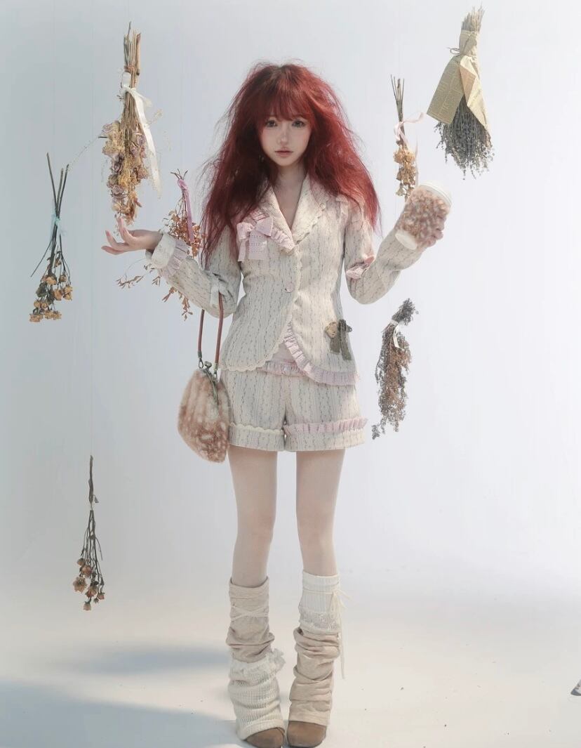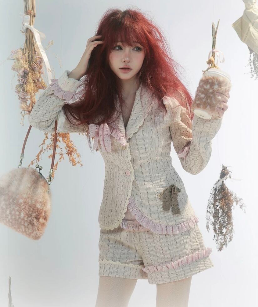 【セットアップ】ベージュ ジャケット ショートパンツ ホットパンツ リボン ニット ガーリー スーツ メッシュ フリル カーディガン 原宿 姫 ミニスカート ジャケット