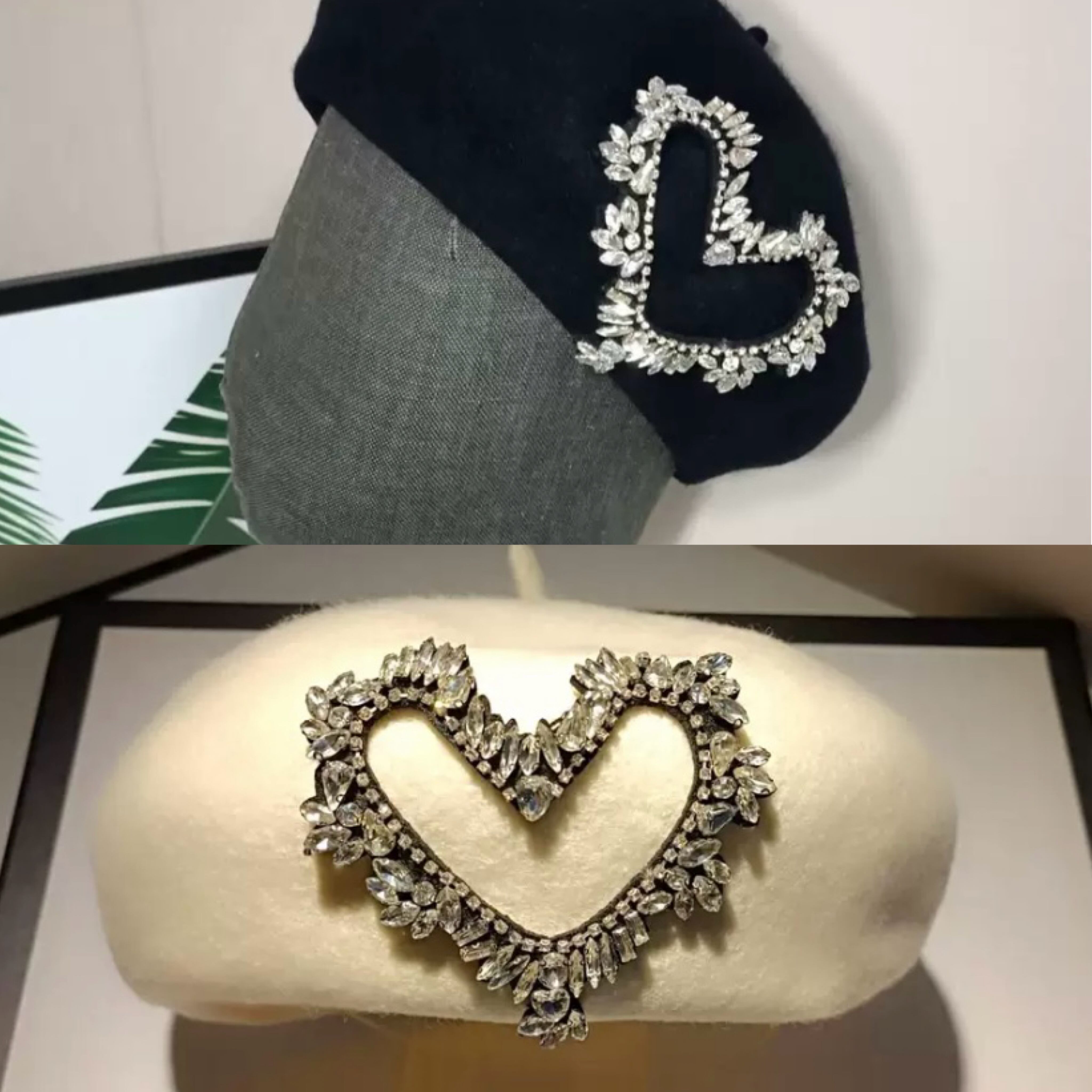 黒 白 ラインストーン キラキラ ハート ベレー帽、帽子、アクセサリー、お嬢様、原宿、渋谷