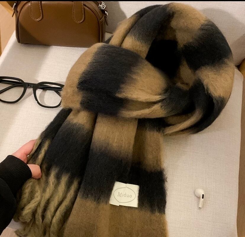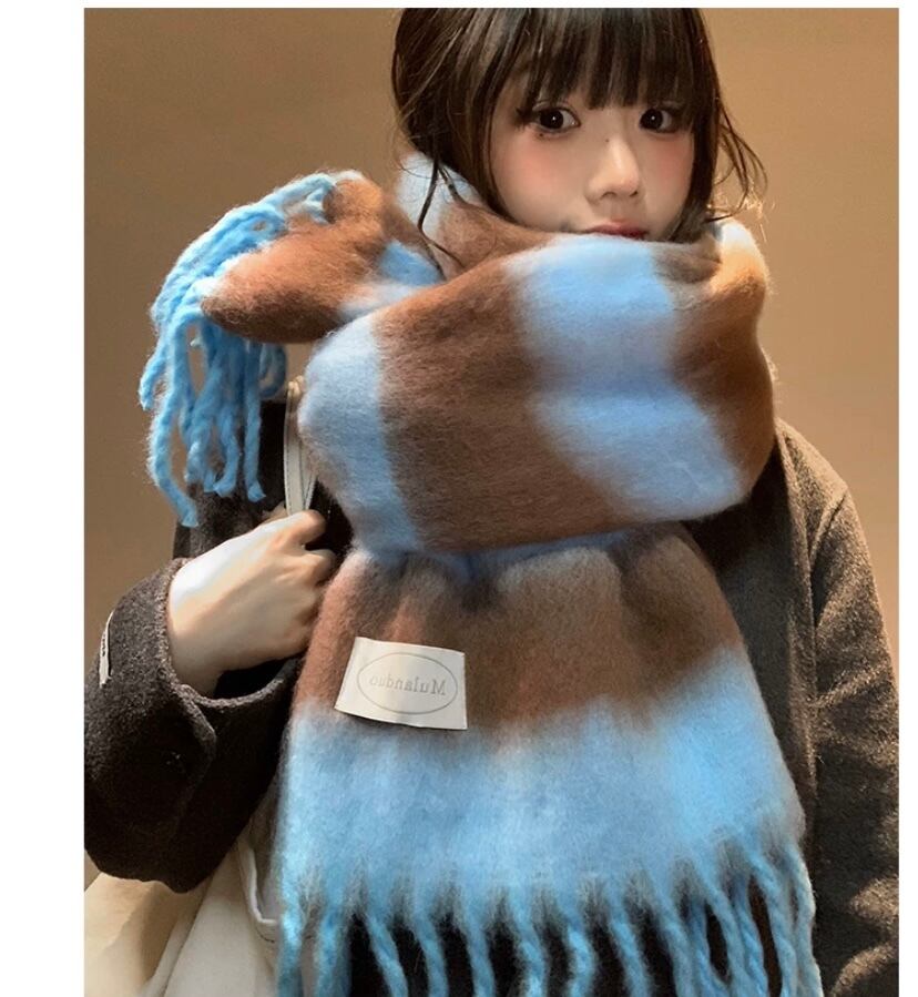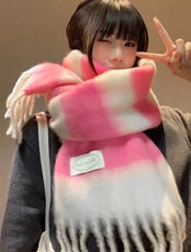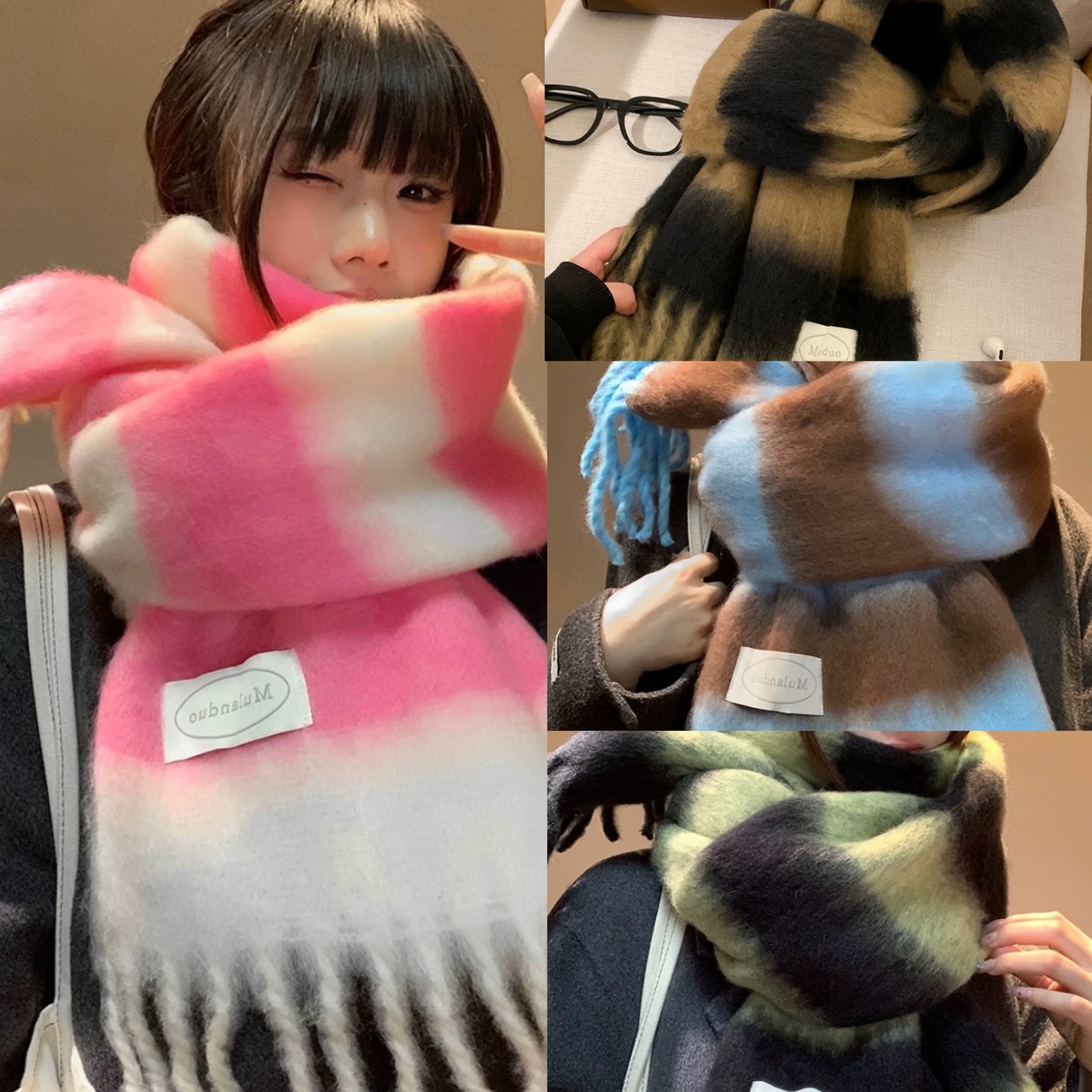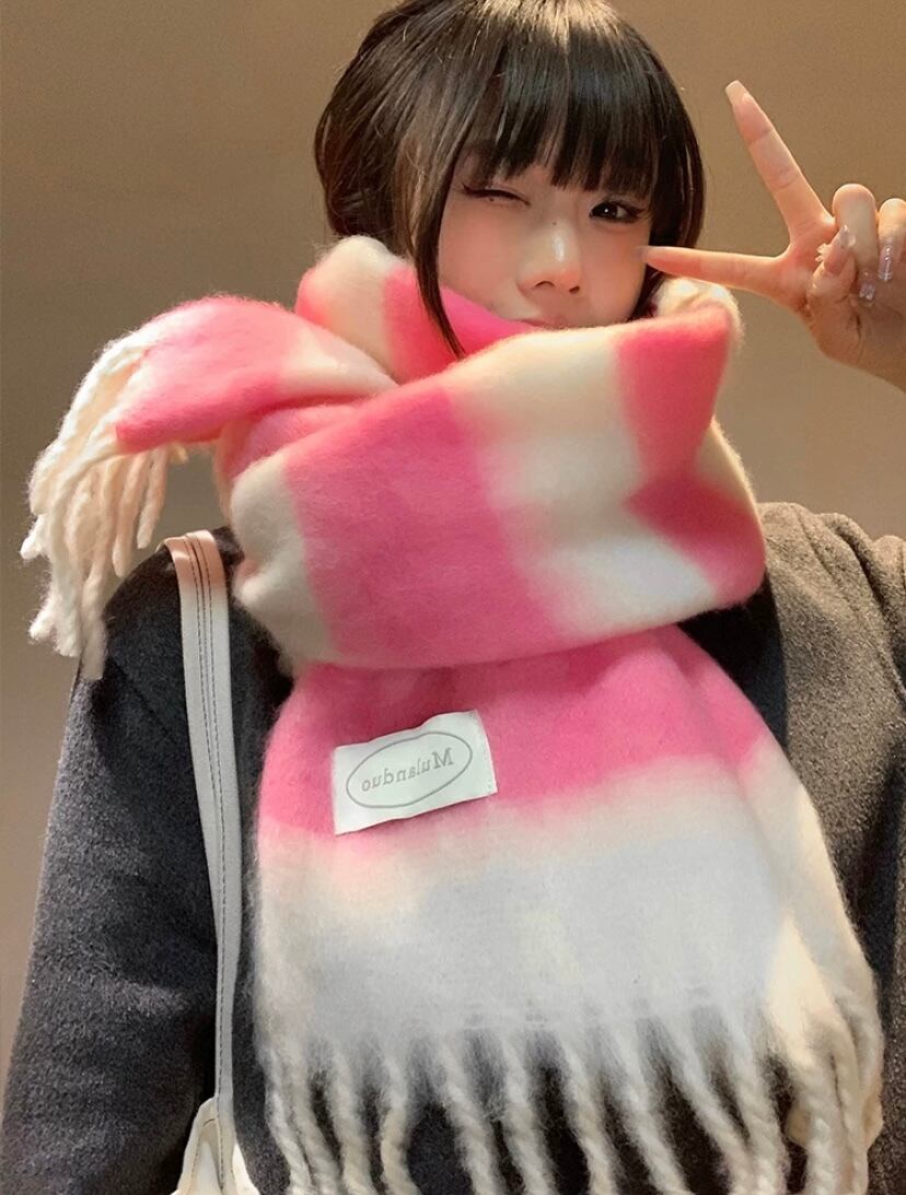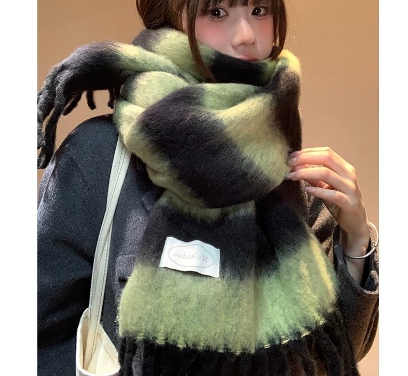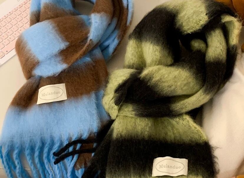 ピンク、水色、緑、茶色、黒 ボーダーチェック、マフラー、ロングショール、原宿 アクセサリー、カジュアル