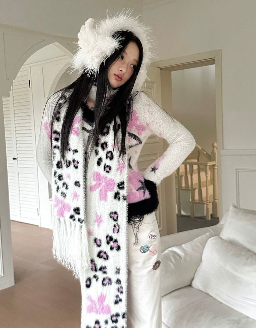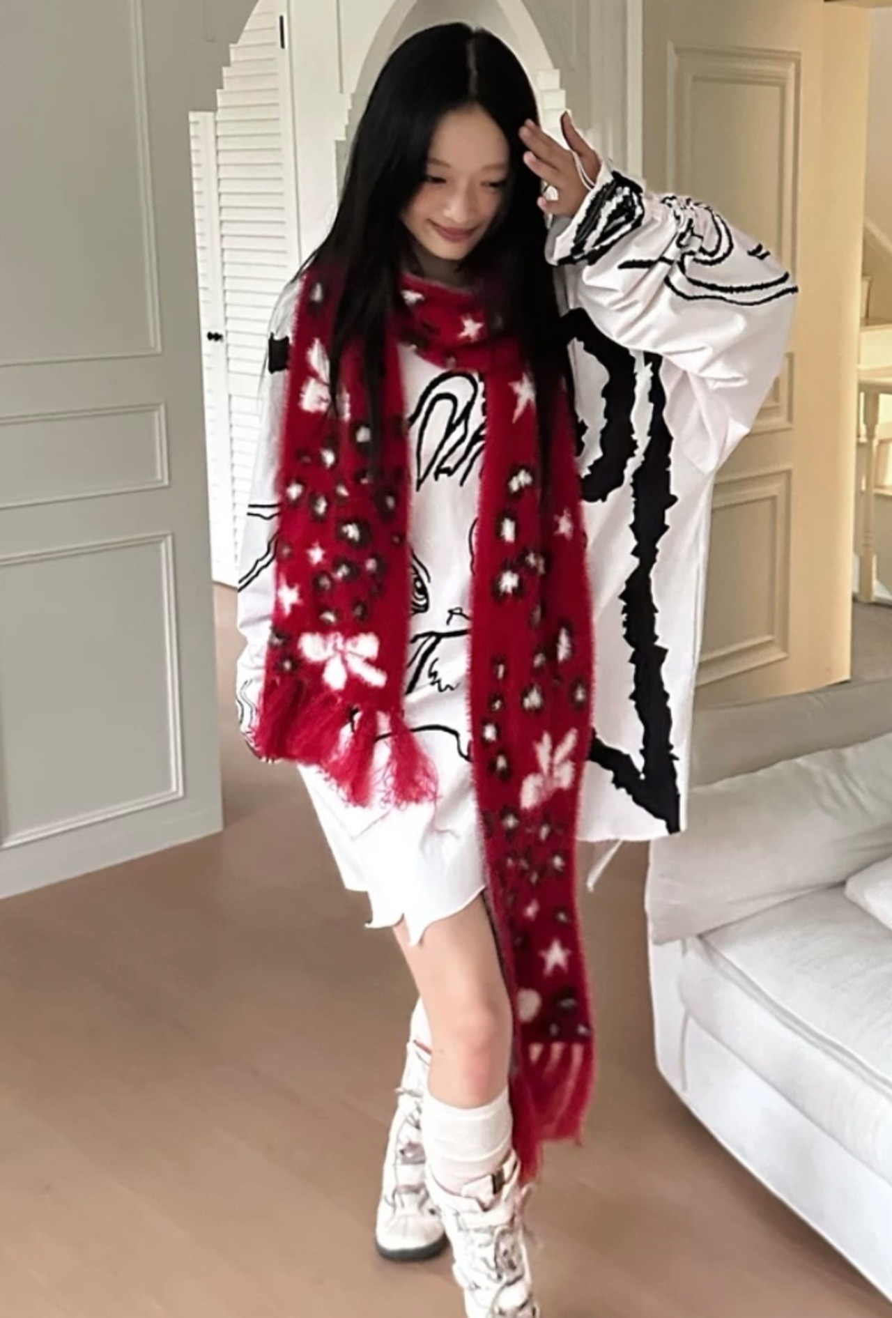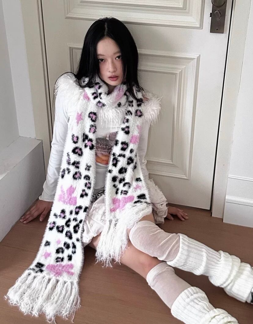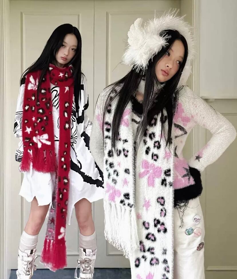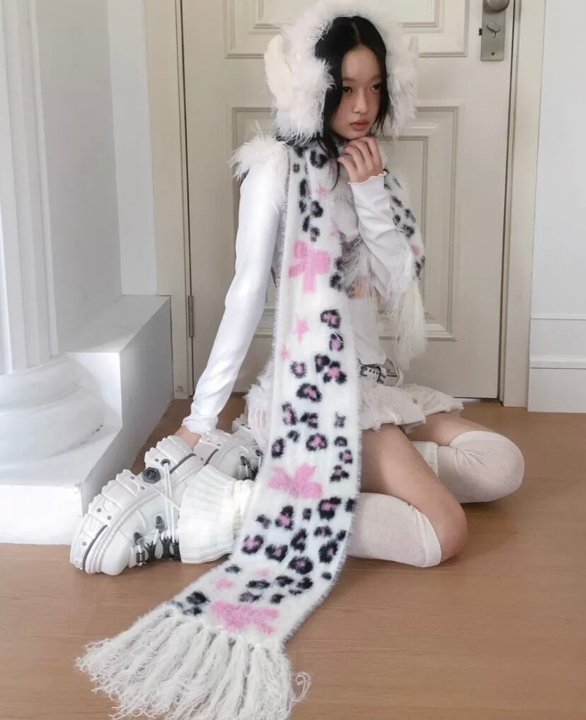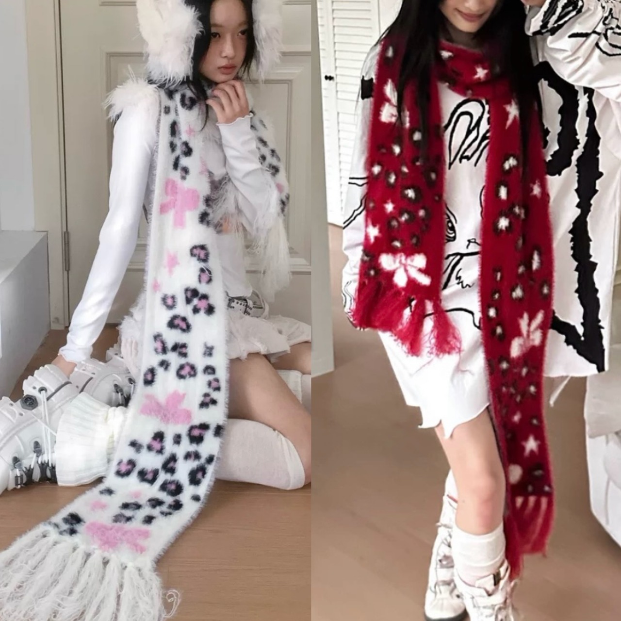 赤 白 ピンク レオパード 豹柄 マフラー ロング かわいい 原宿 ホワイ ガーリー