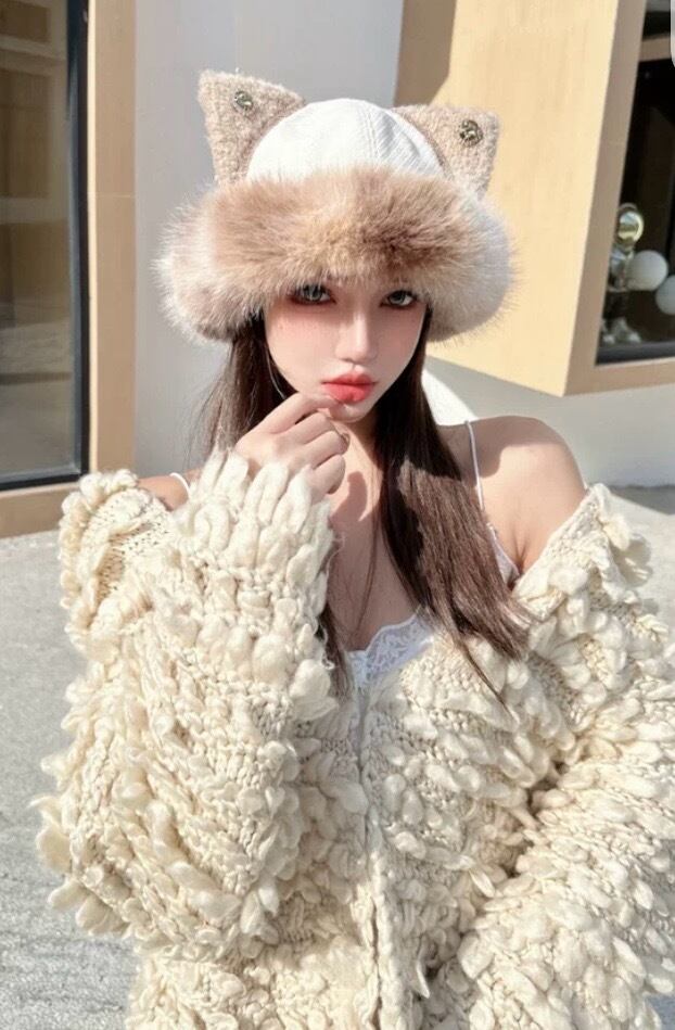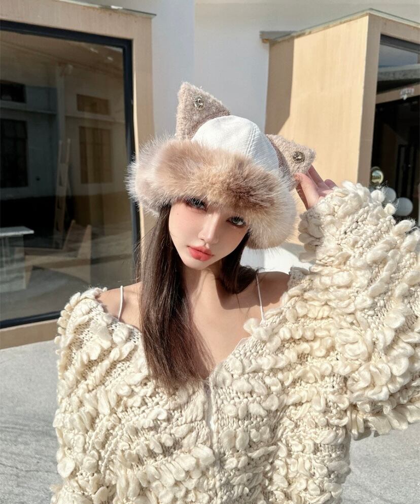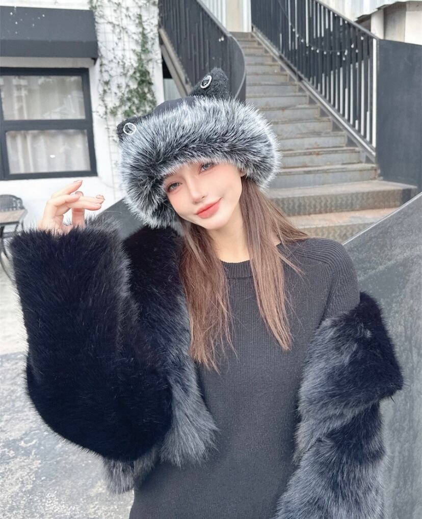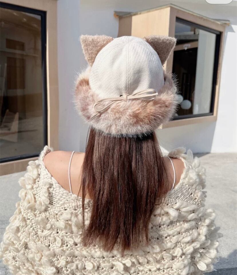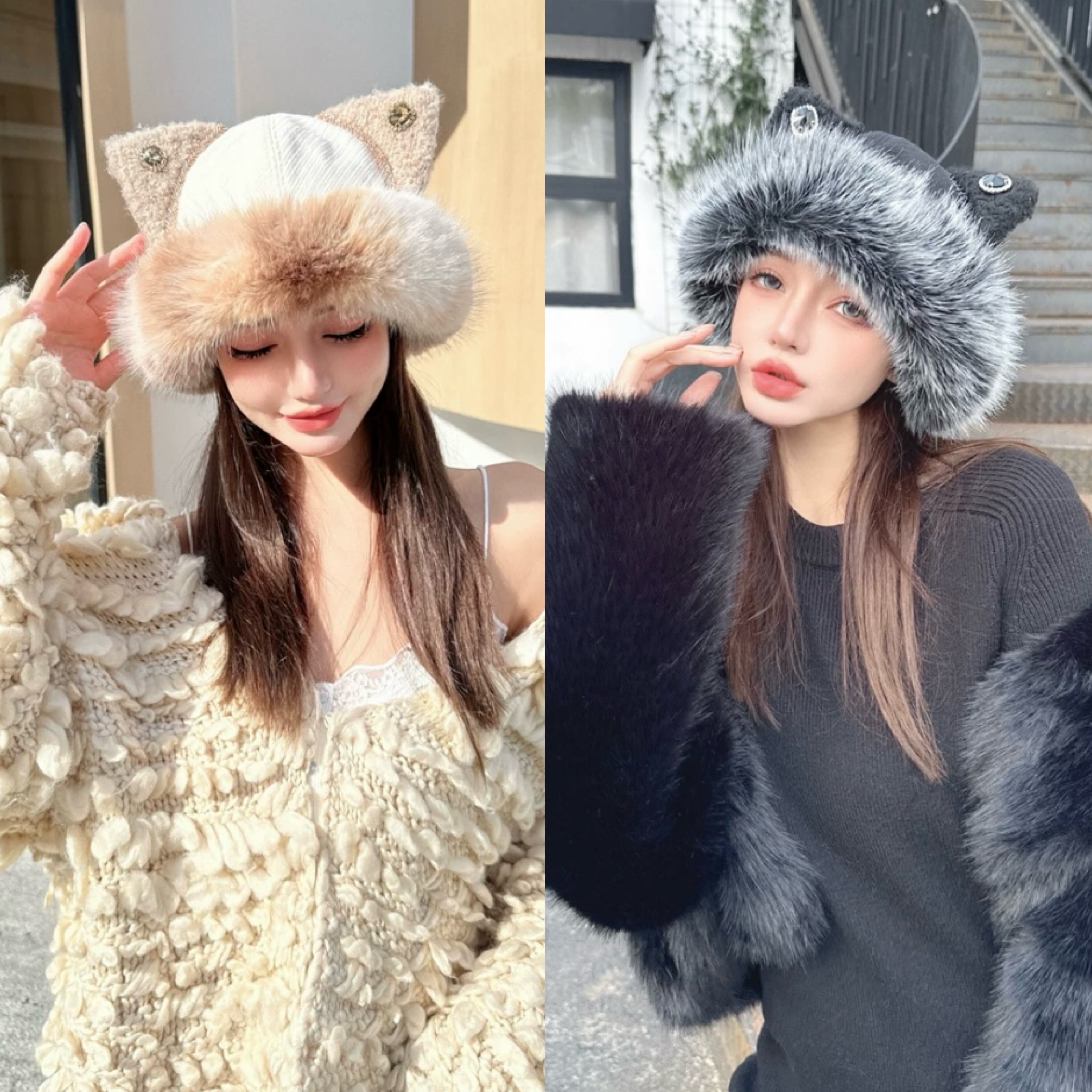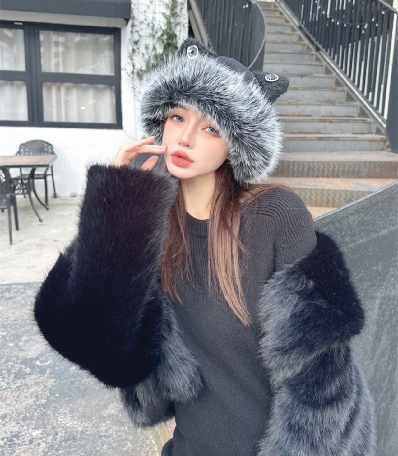 ベージュ 黒 猫耳 帽子、かわいい ファー、ファー アクセサリー、小物 原宿 アニメ