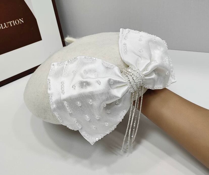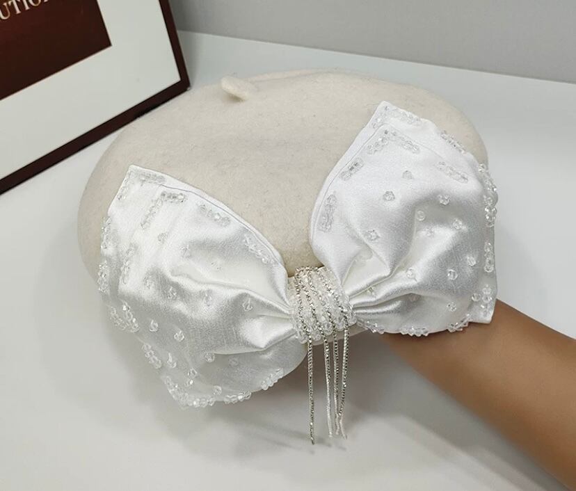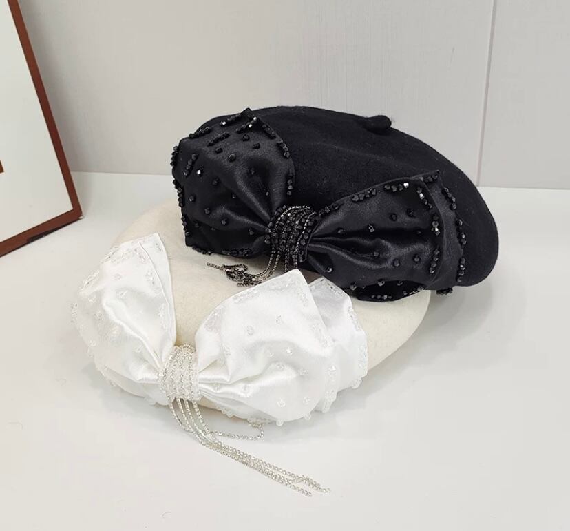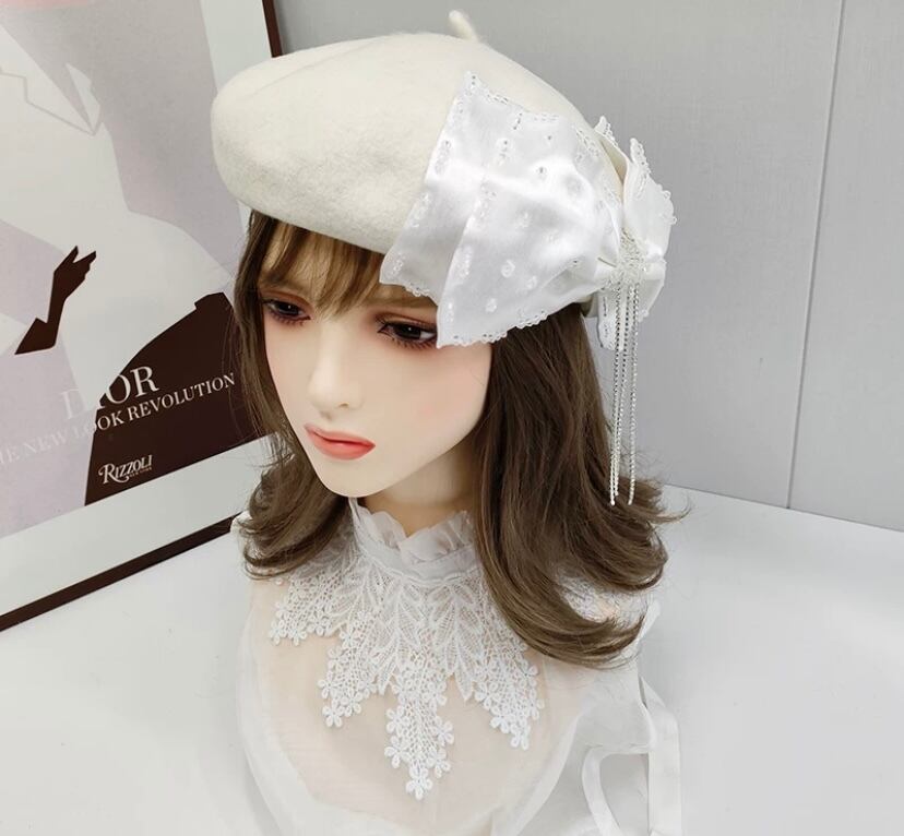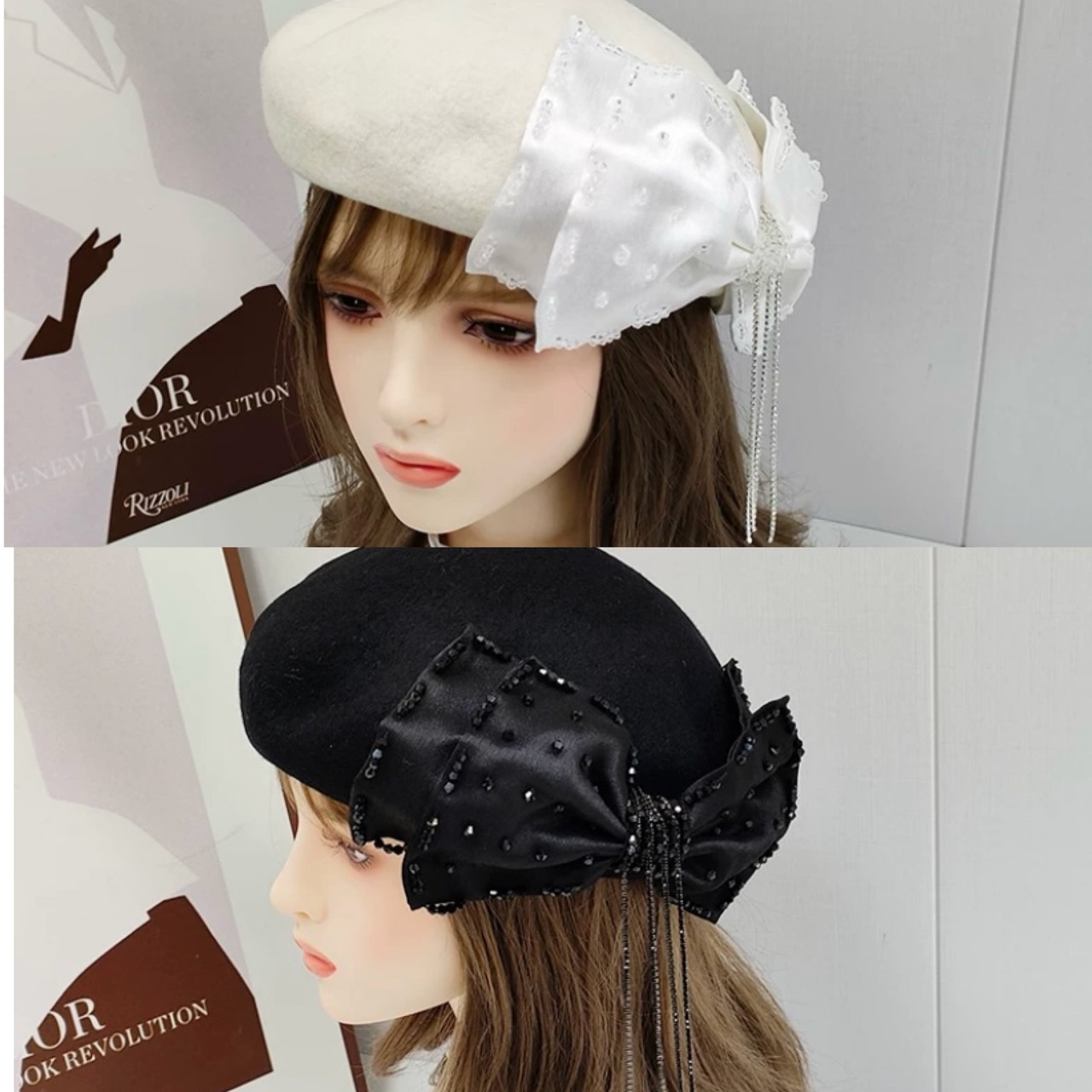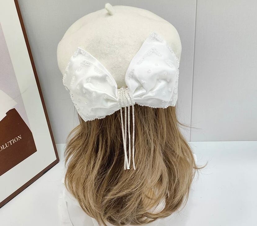 ベレー帽、リボン パール、黒 白 ガーリー、かわいいお嬢様、原宿 ホワイトにングアクセサリー、ヘアーアクセサリー