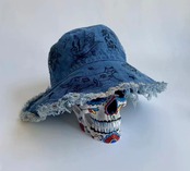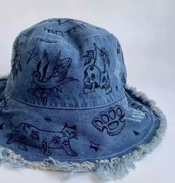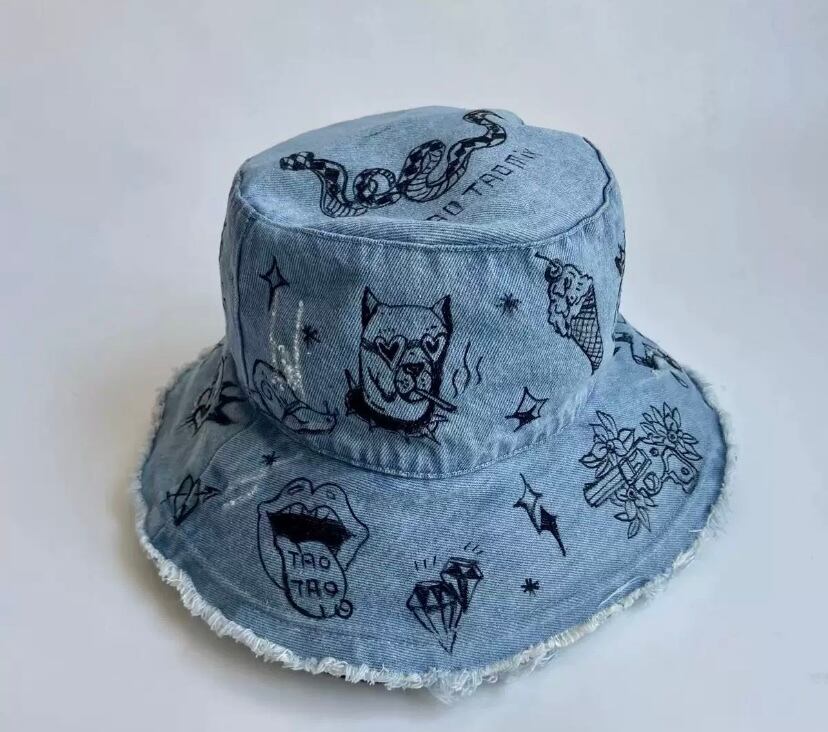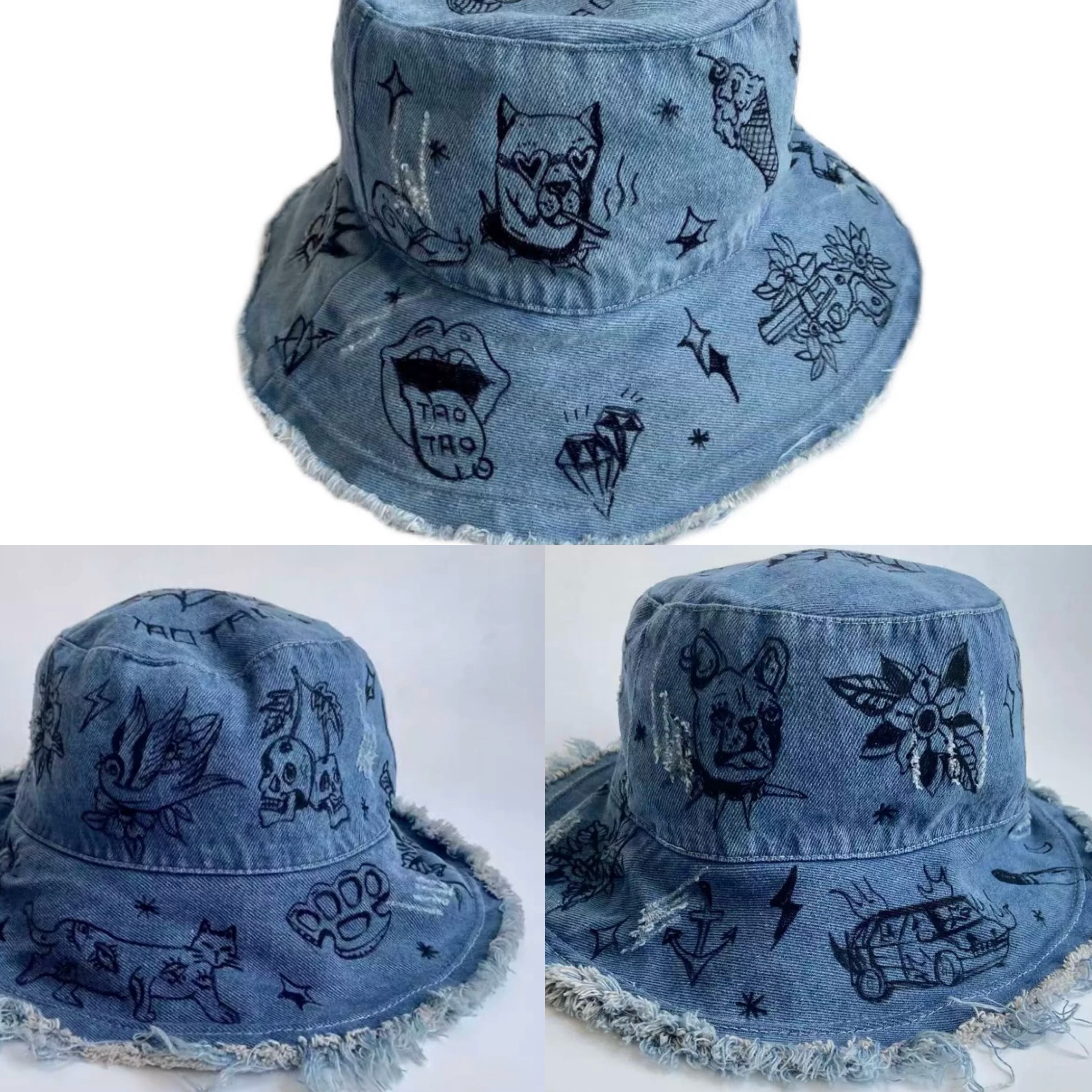 ジーンズ 水色 デニム 落書き、バケットハット 帽子、アクセサリー、ヘアアクセサリー ストリート 原宿 落書き、渋谷 ユニセックス