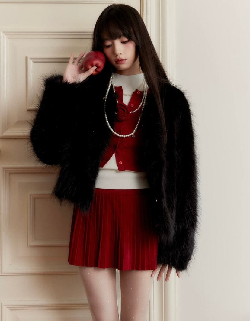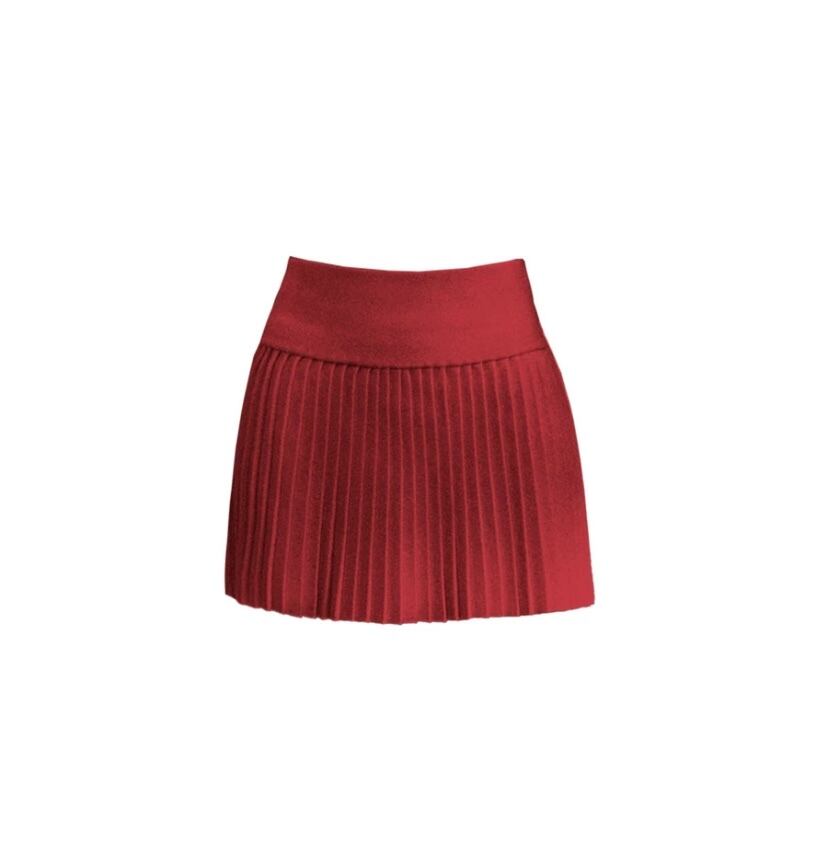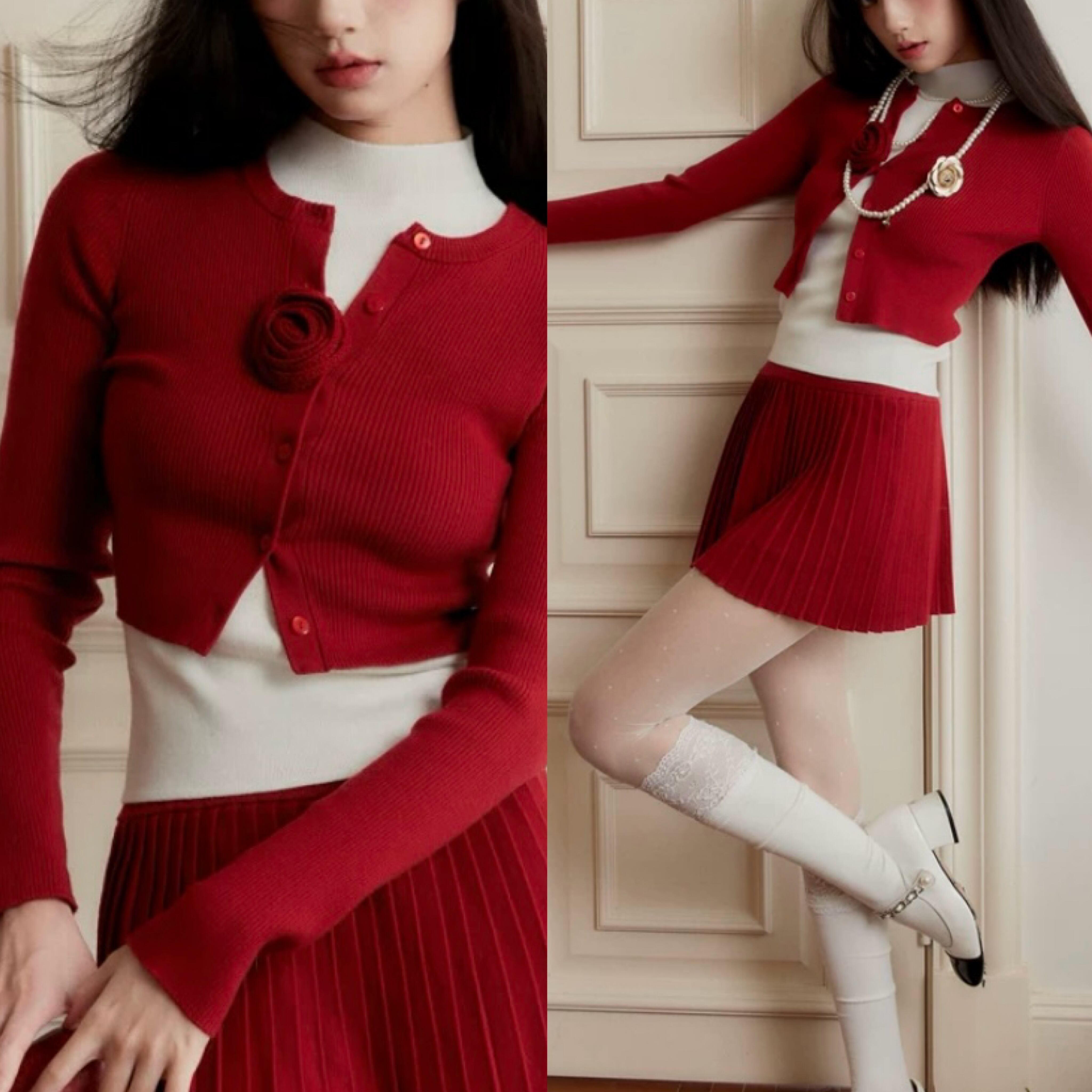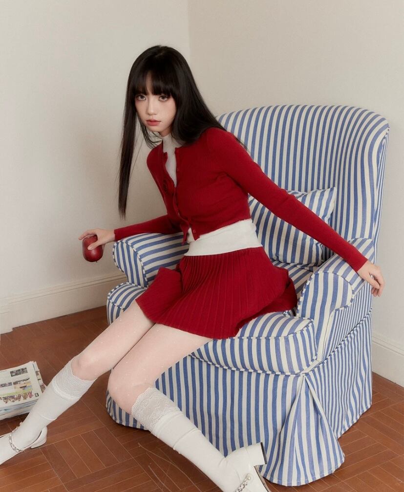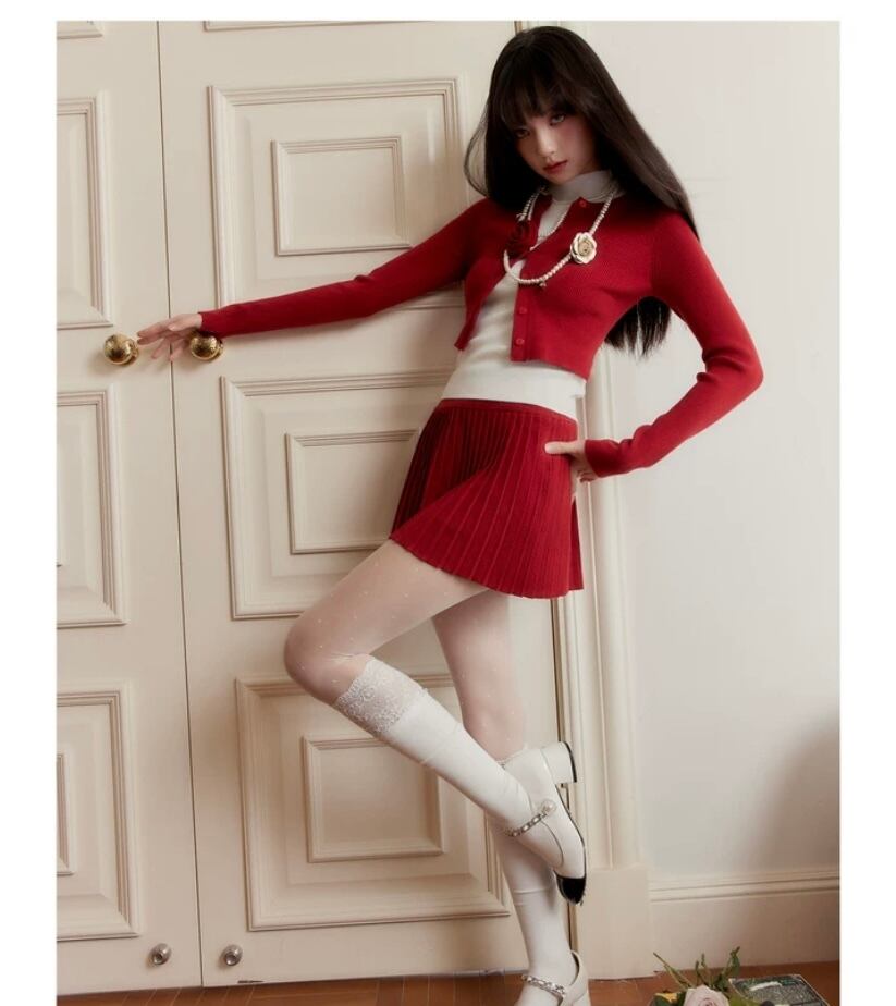 【セットアップ】赤プリーツスカート、カメリア、カーディガン、セーター、ツーピース、スーツ、プリーツスカート、お嬢様、エレガント