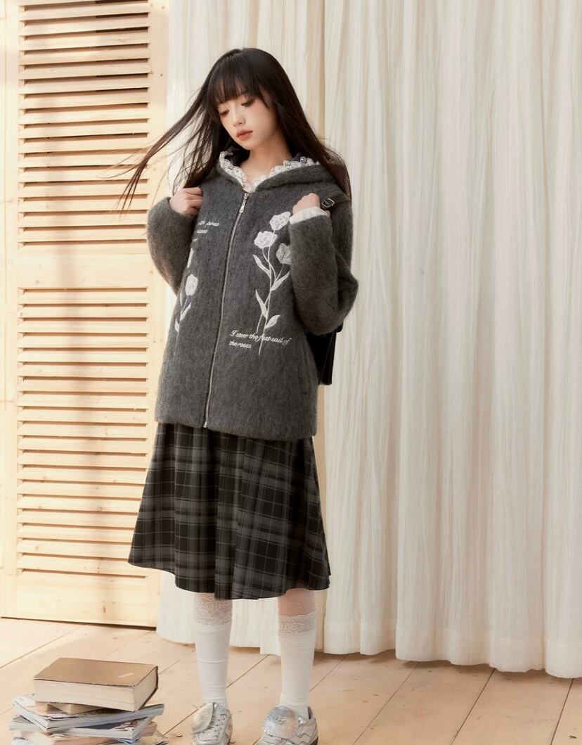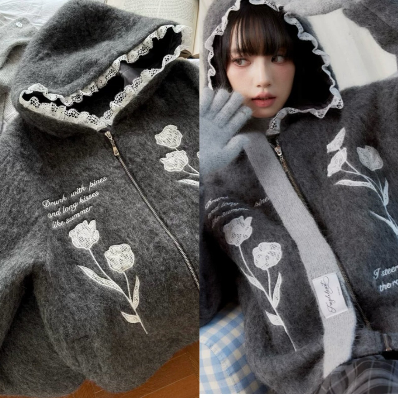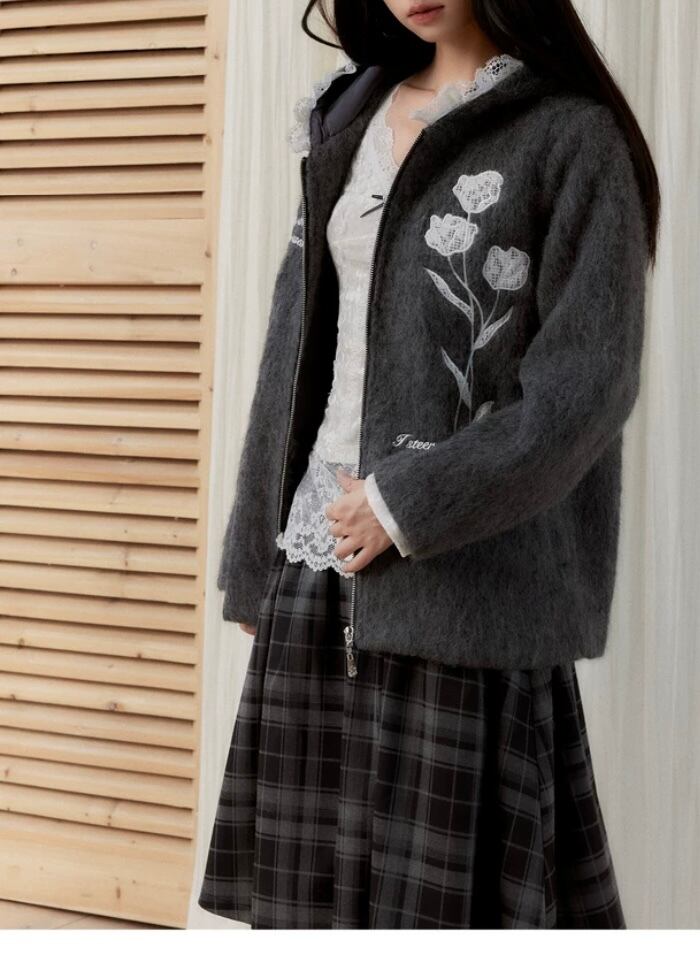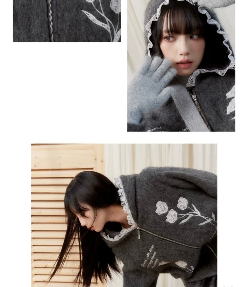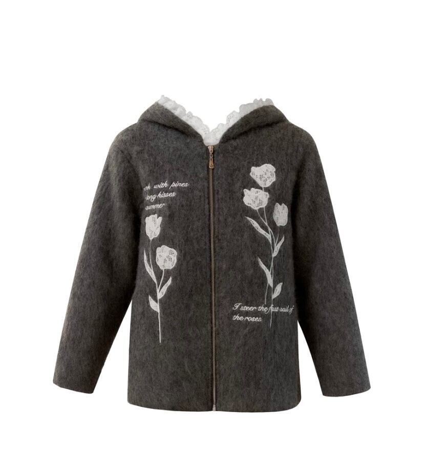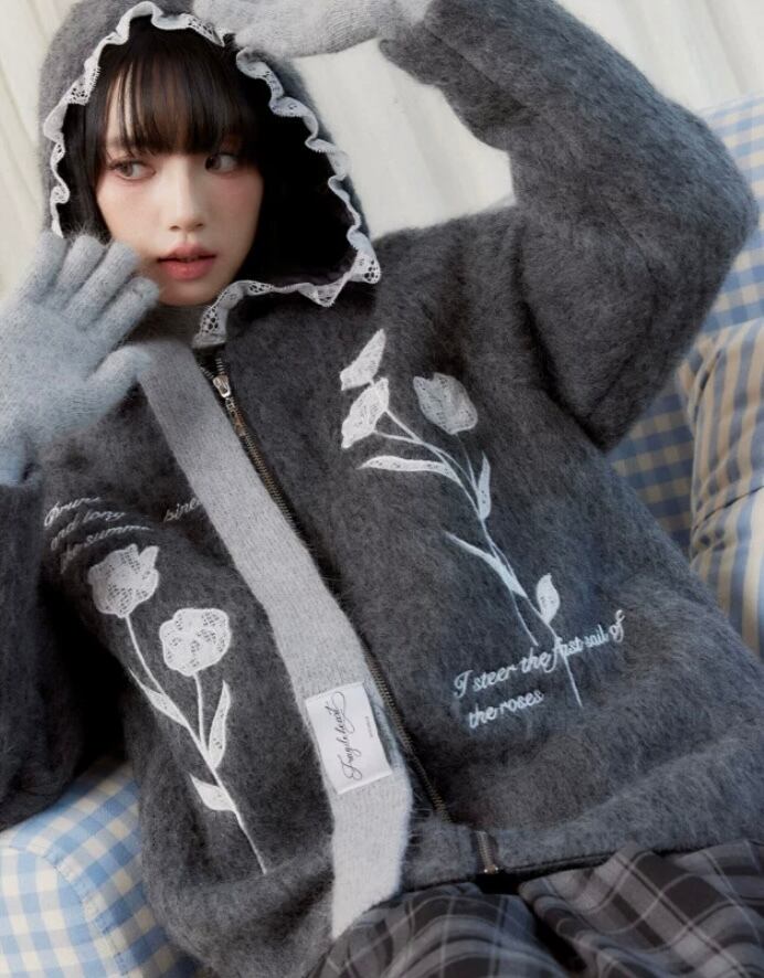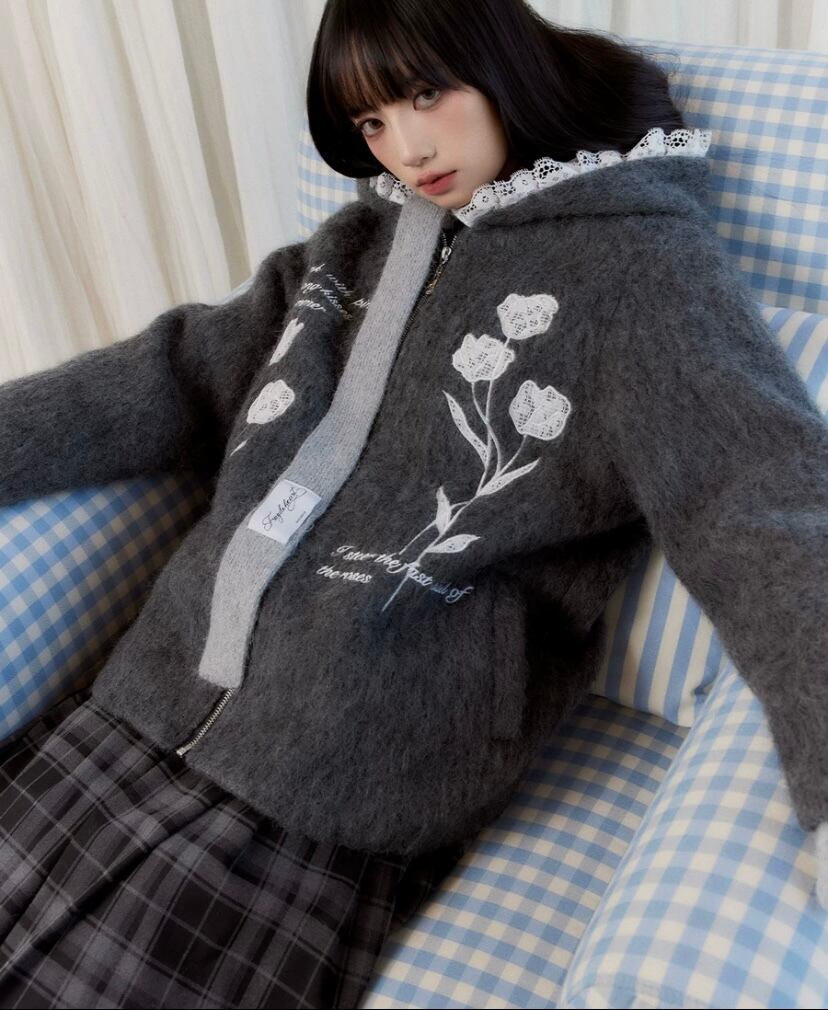 グレー 花柄、フラワー パーカー カーディガン、アウター ジャケット コート、原宿 かわいい お嬢様、チューリップ フード