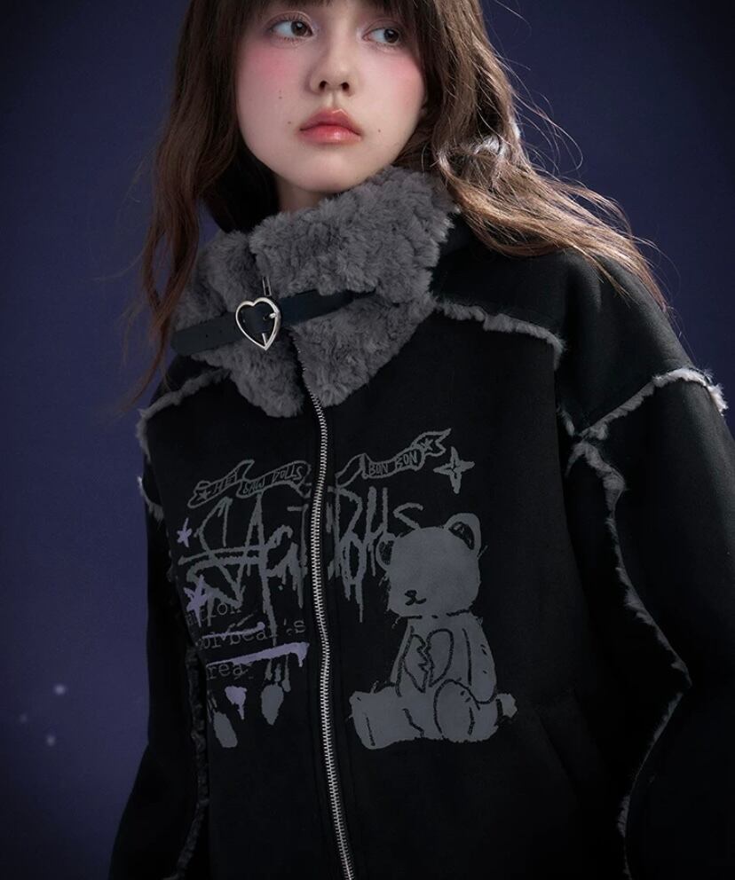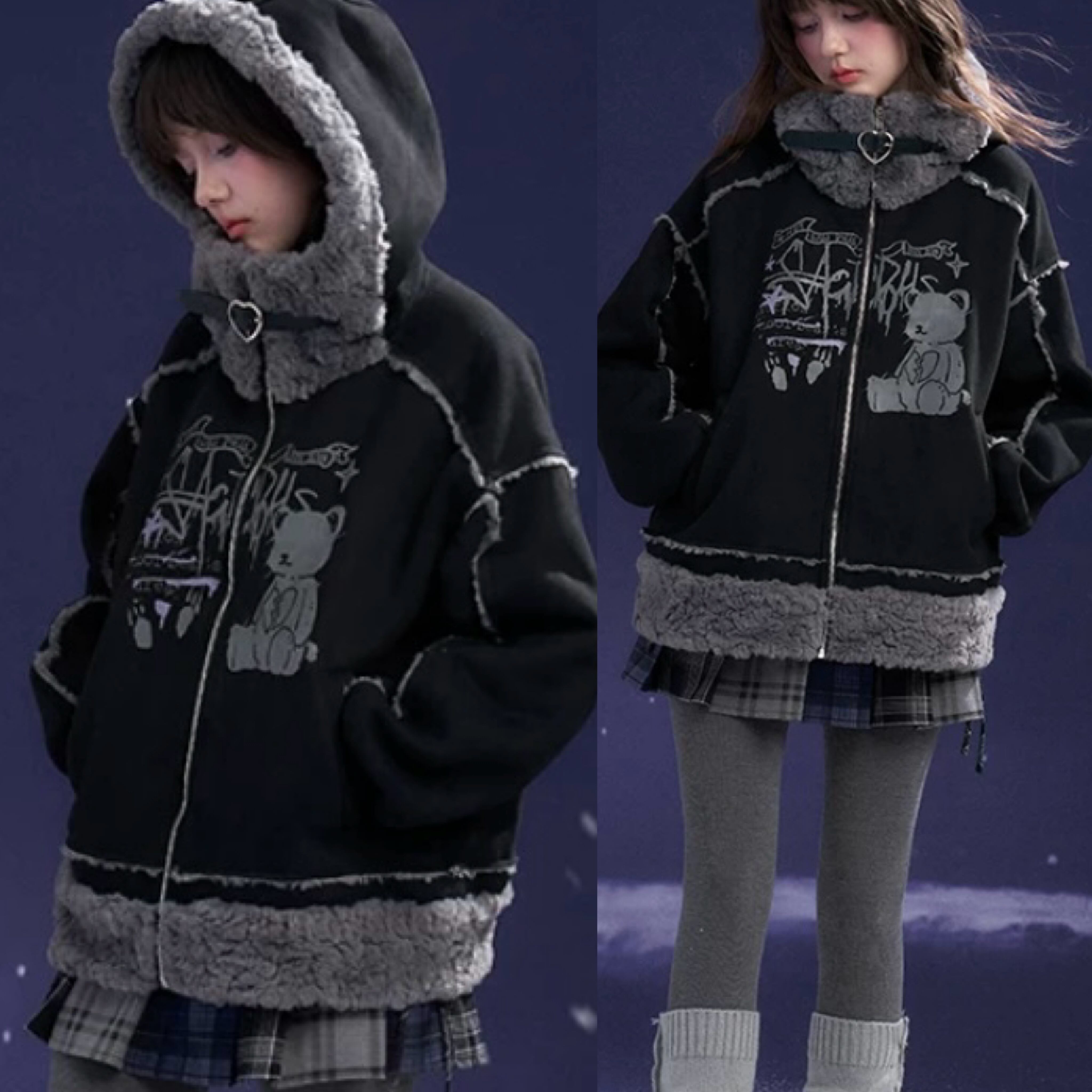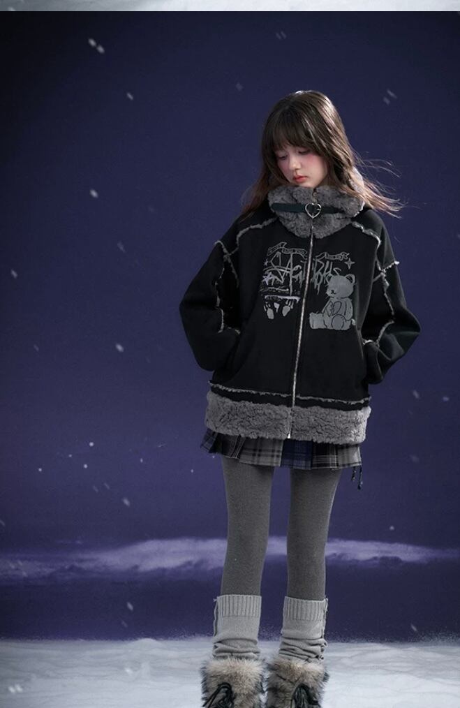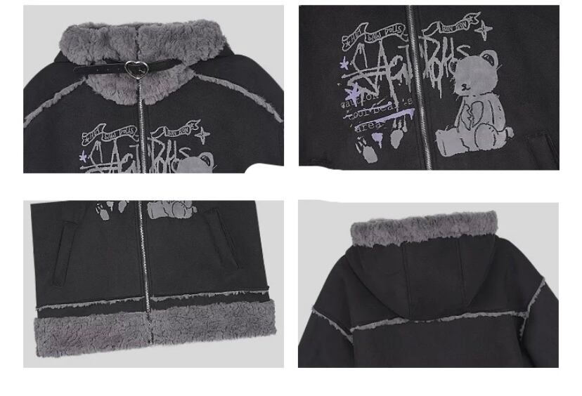 ハイネック パーカー トレーナー フード アウタージャケット ムートン グレー ハート ガーリー 原宿