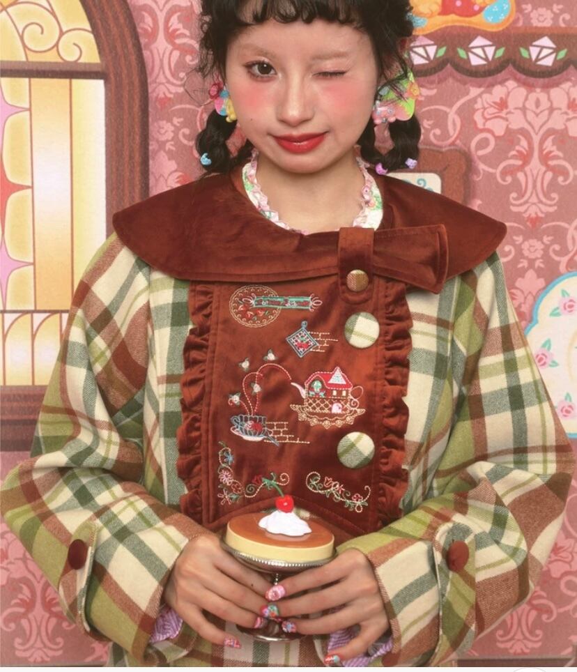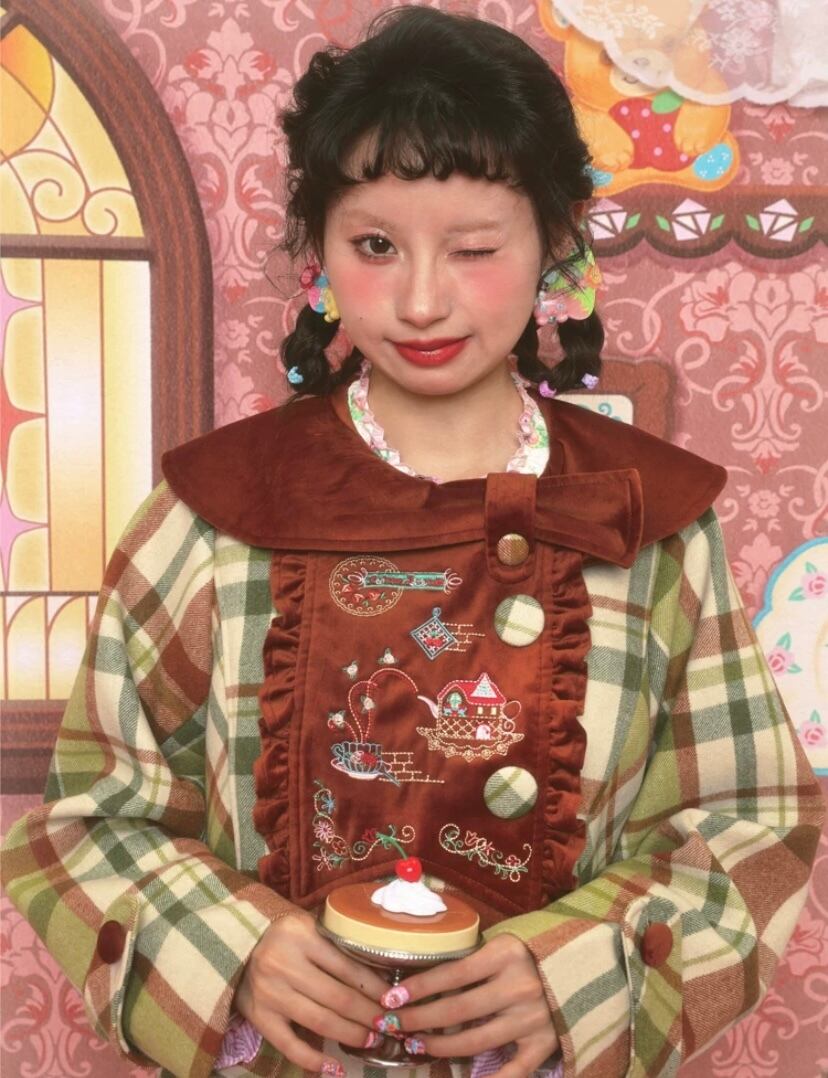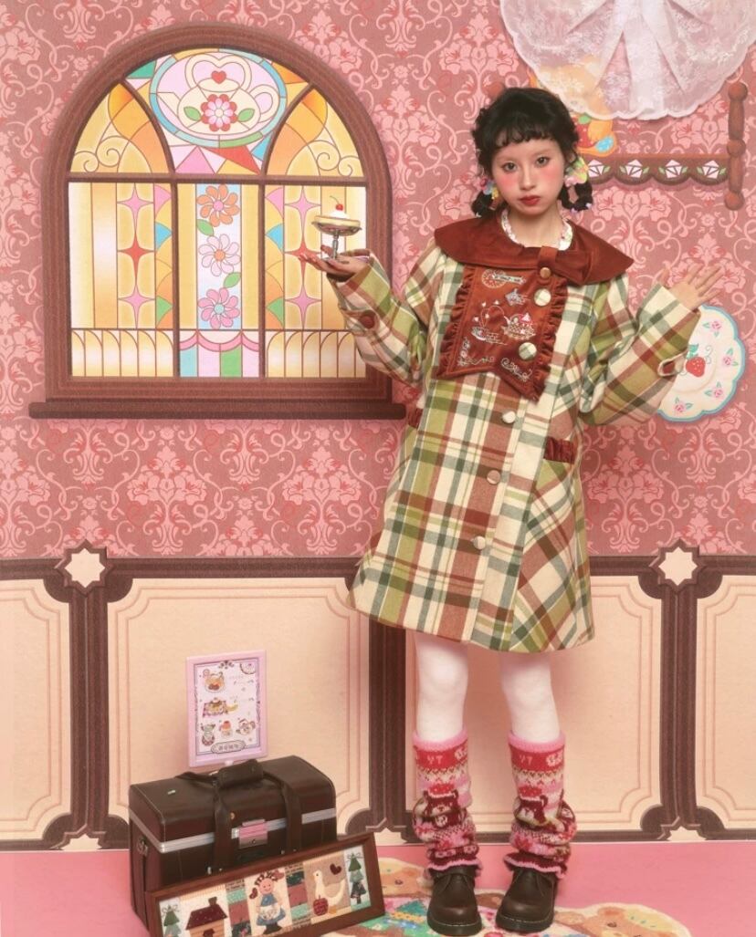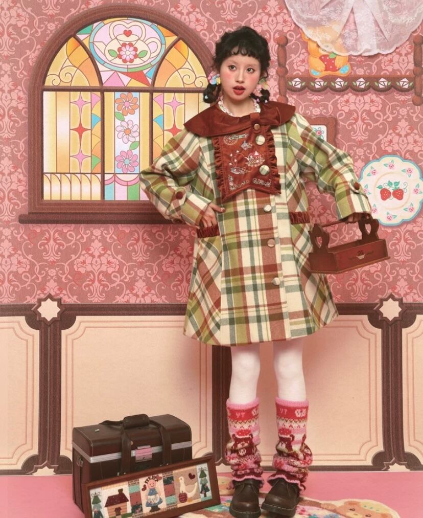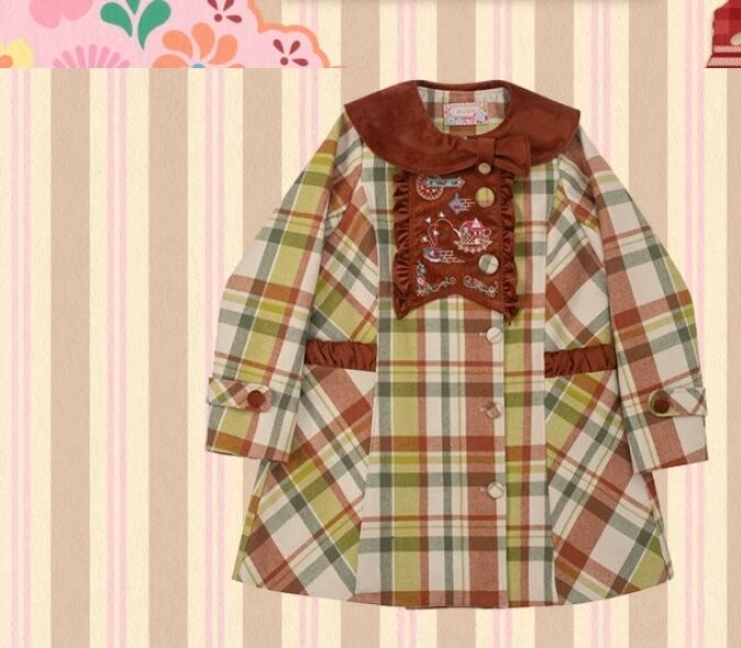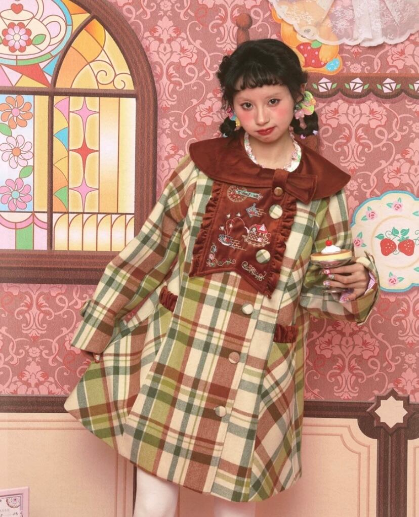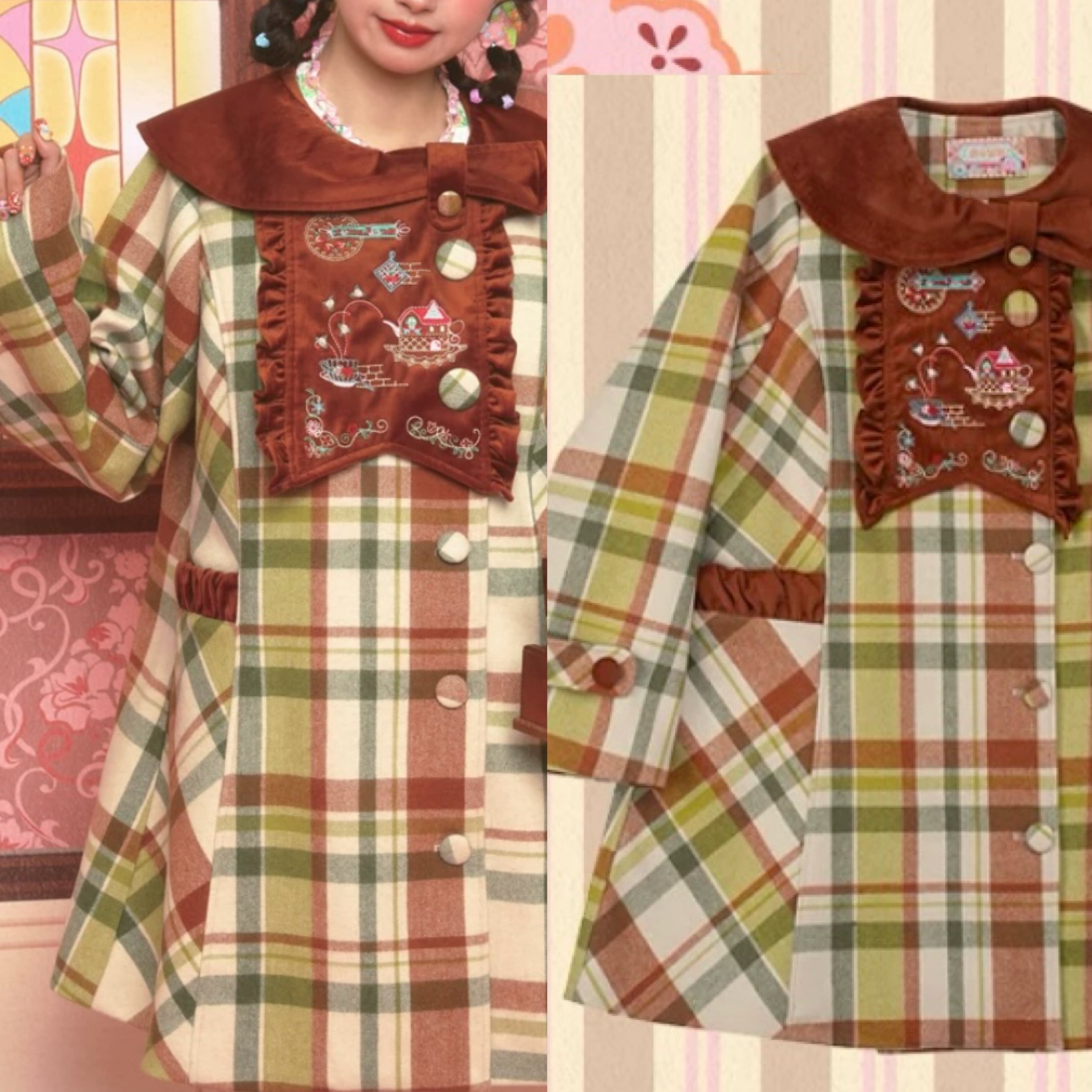 緑 チェック、丸襟 茶色 コート、アウター、ジャケット、ワンピース、カーディガン、茶色、レトロ 原宿 古着