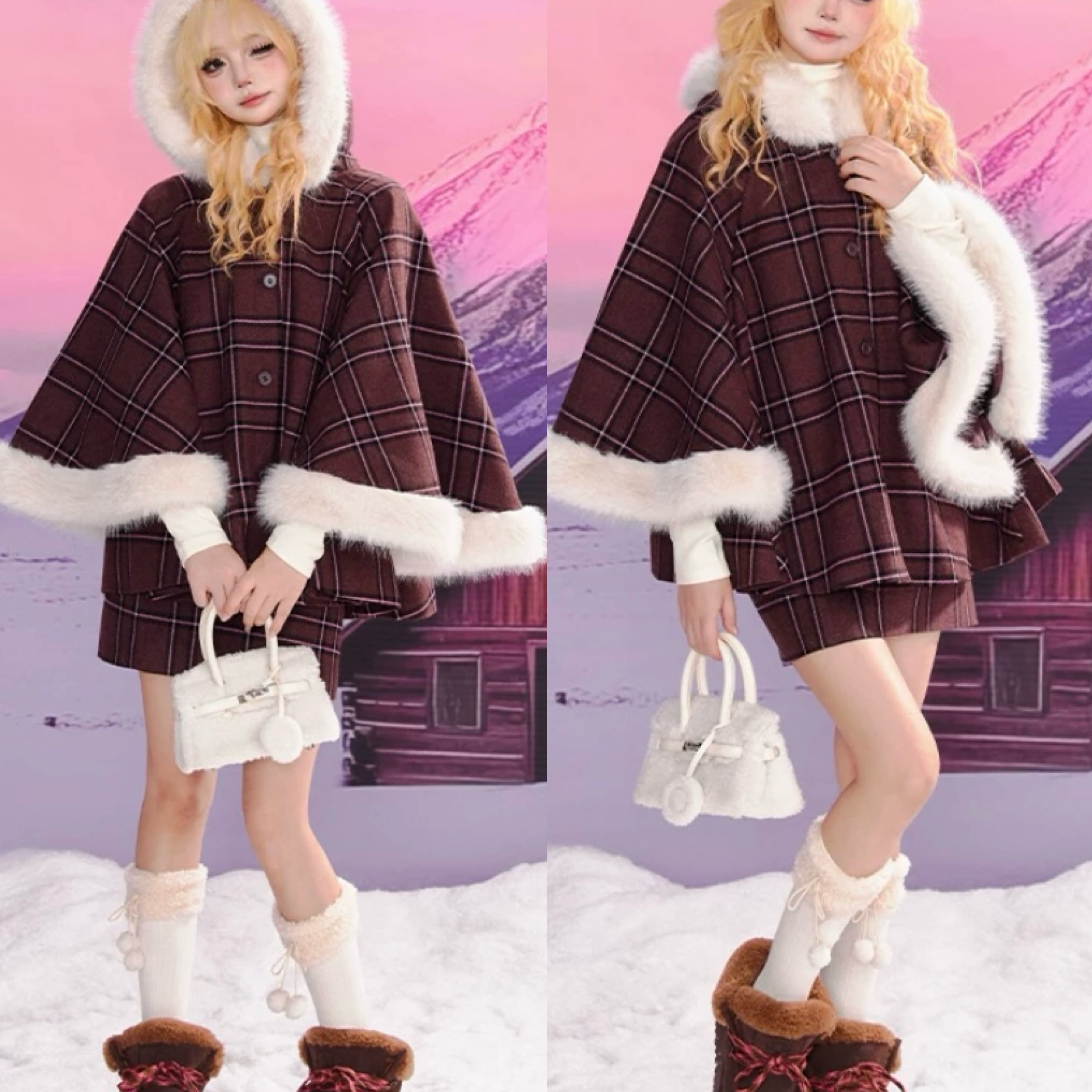 【ポンチョ】赤 チェック、ポンチョ、アウター、カーディガン、フード 原宿 チェック、ゆったり、アウター ファー