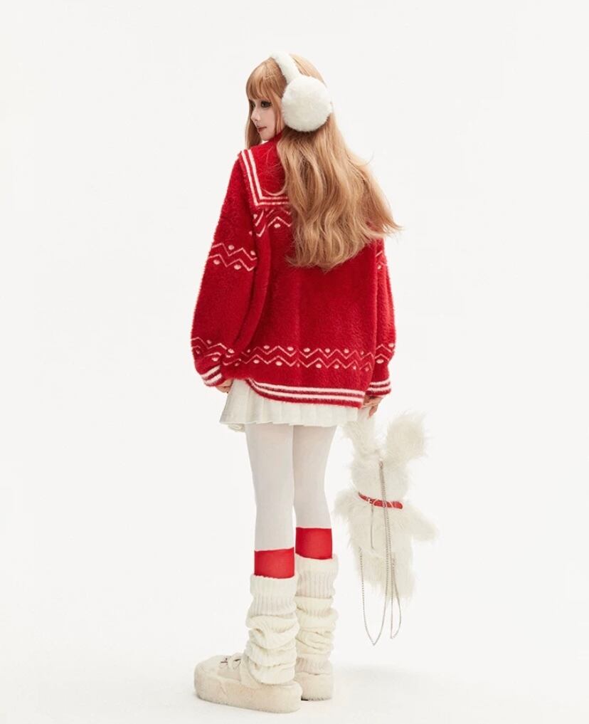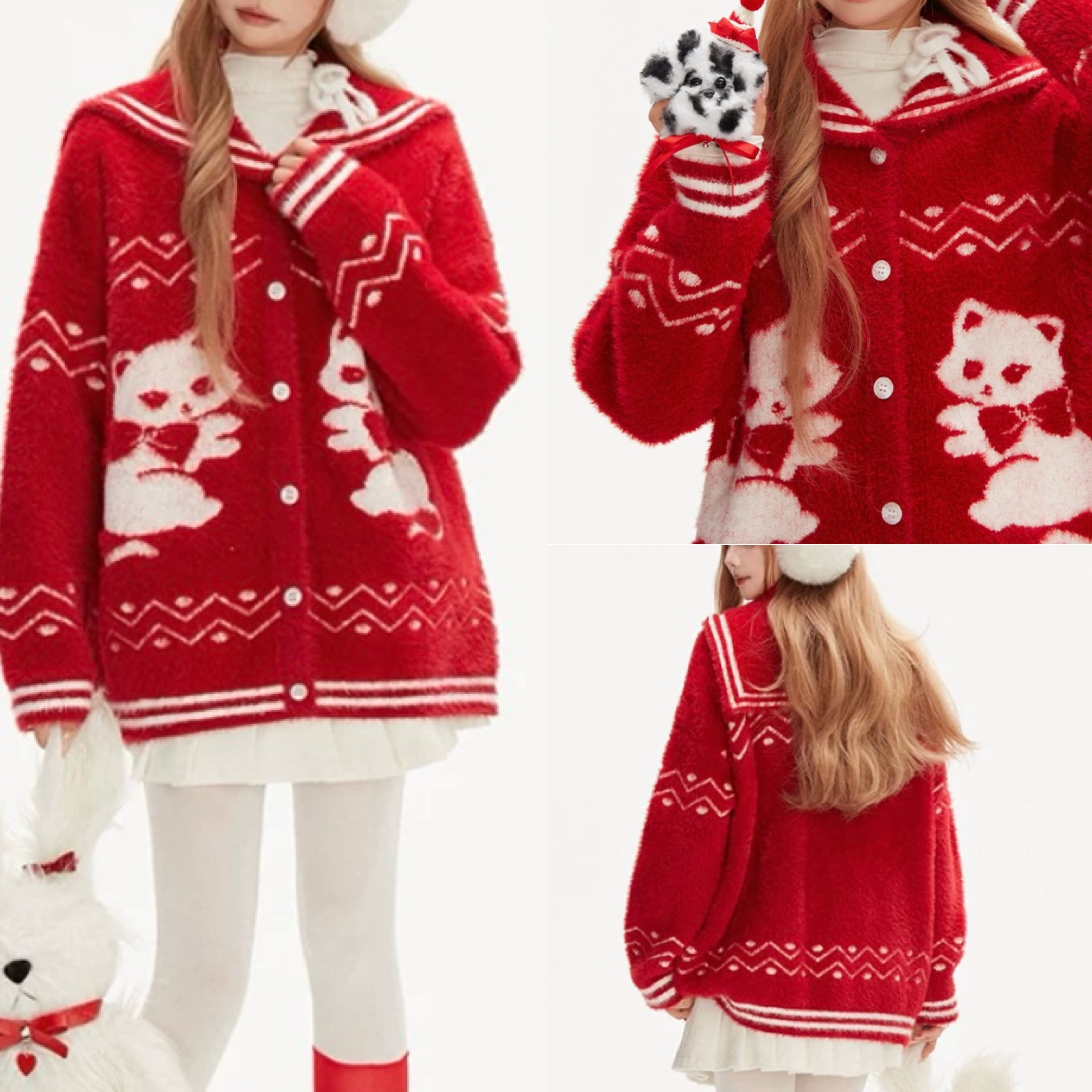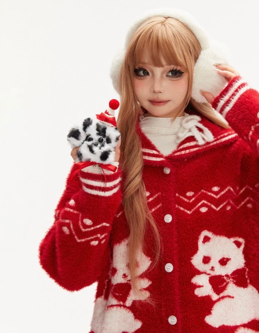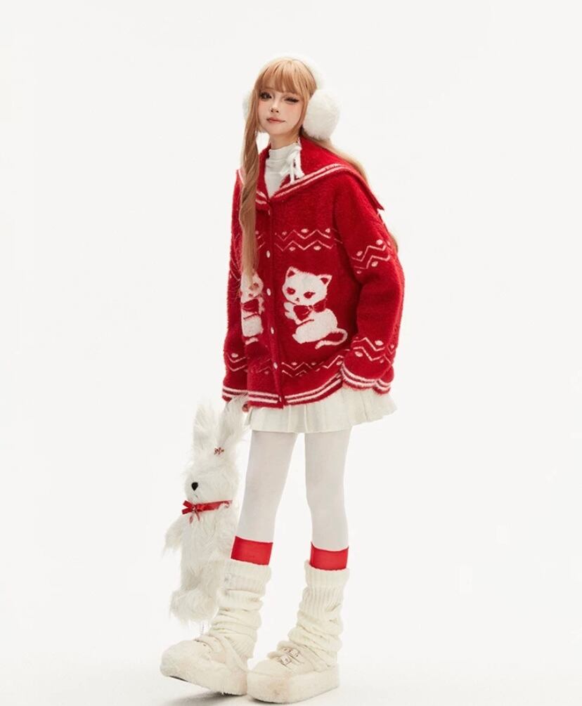 赤 猫 アニマル、リボン セーラー、カーディガン、セーター、アウター トップス かわいい 原宿 ガーリー