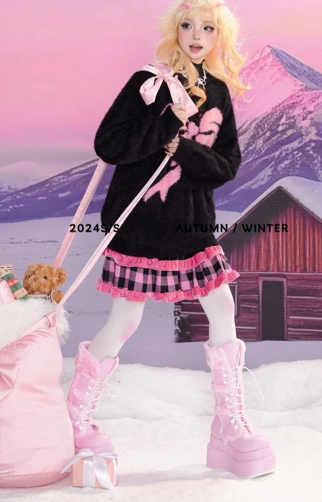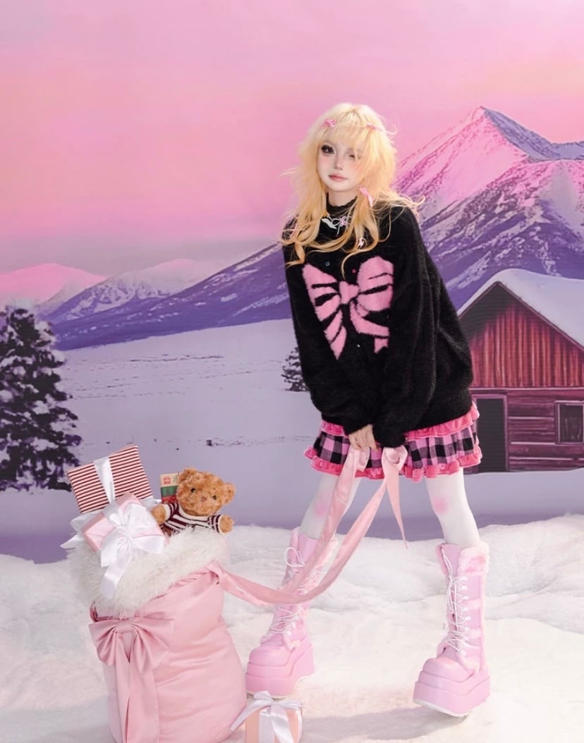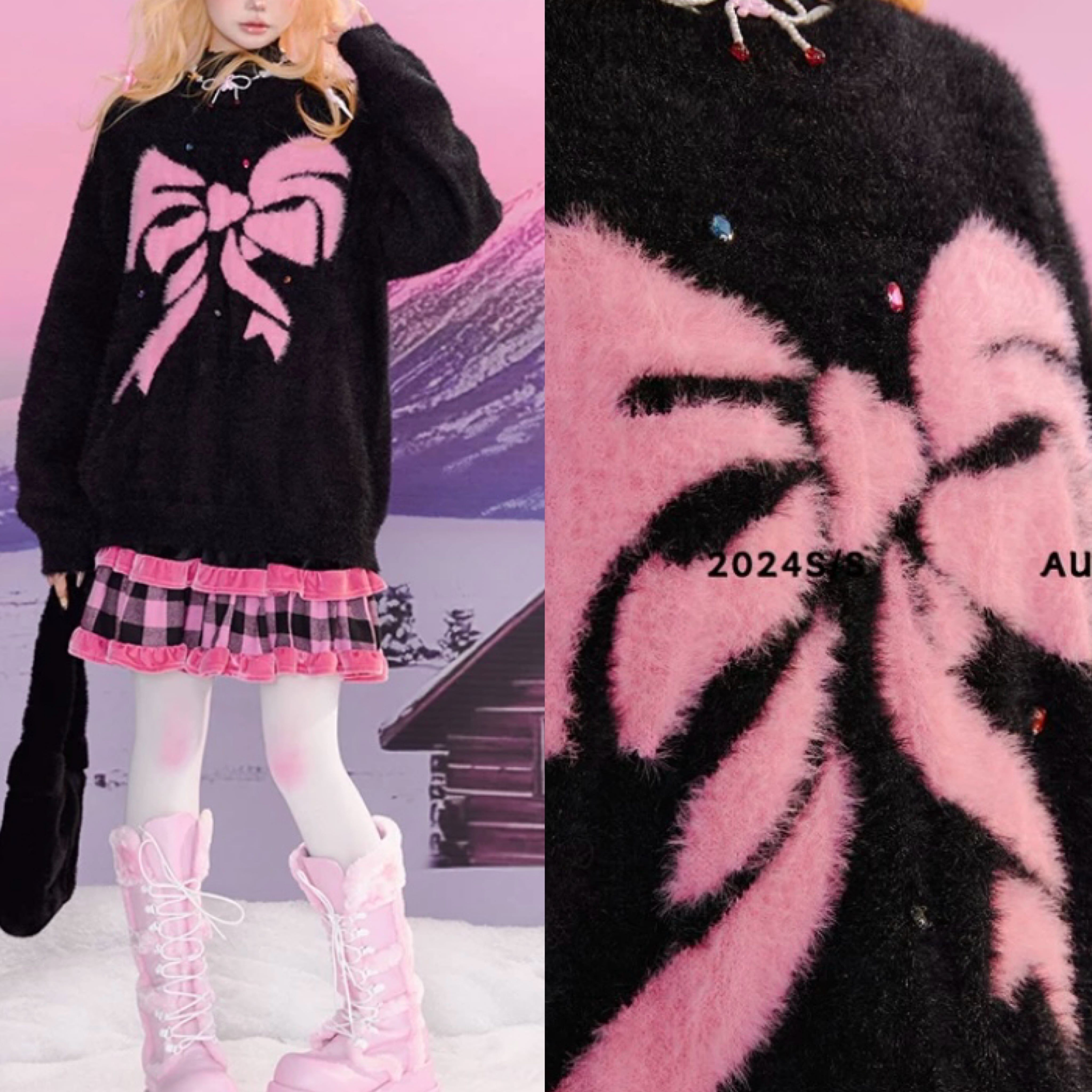 黒 ピンク、リボン、セーター、カーディガン、トップス、原宿 姫 かわいい ニット