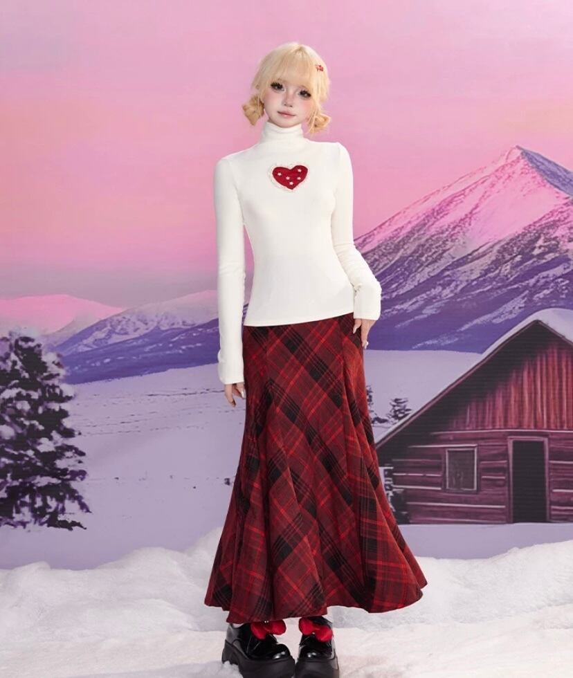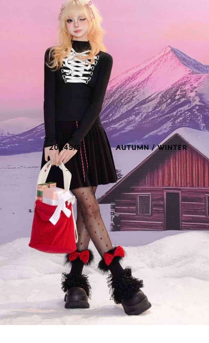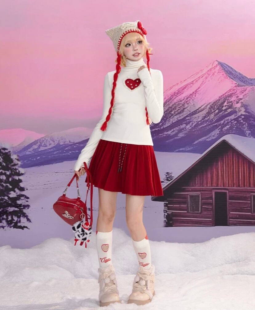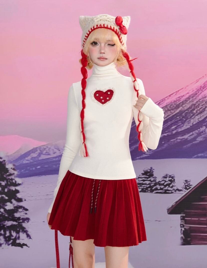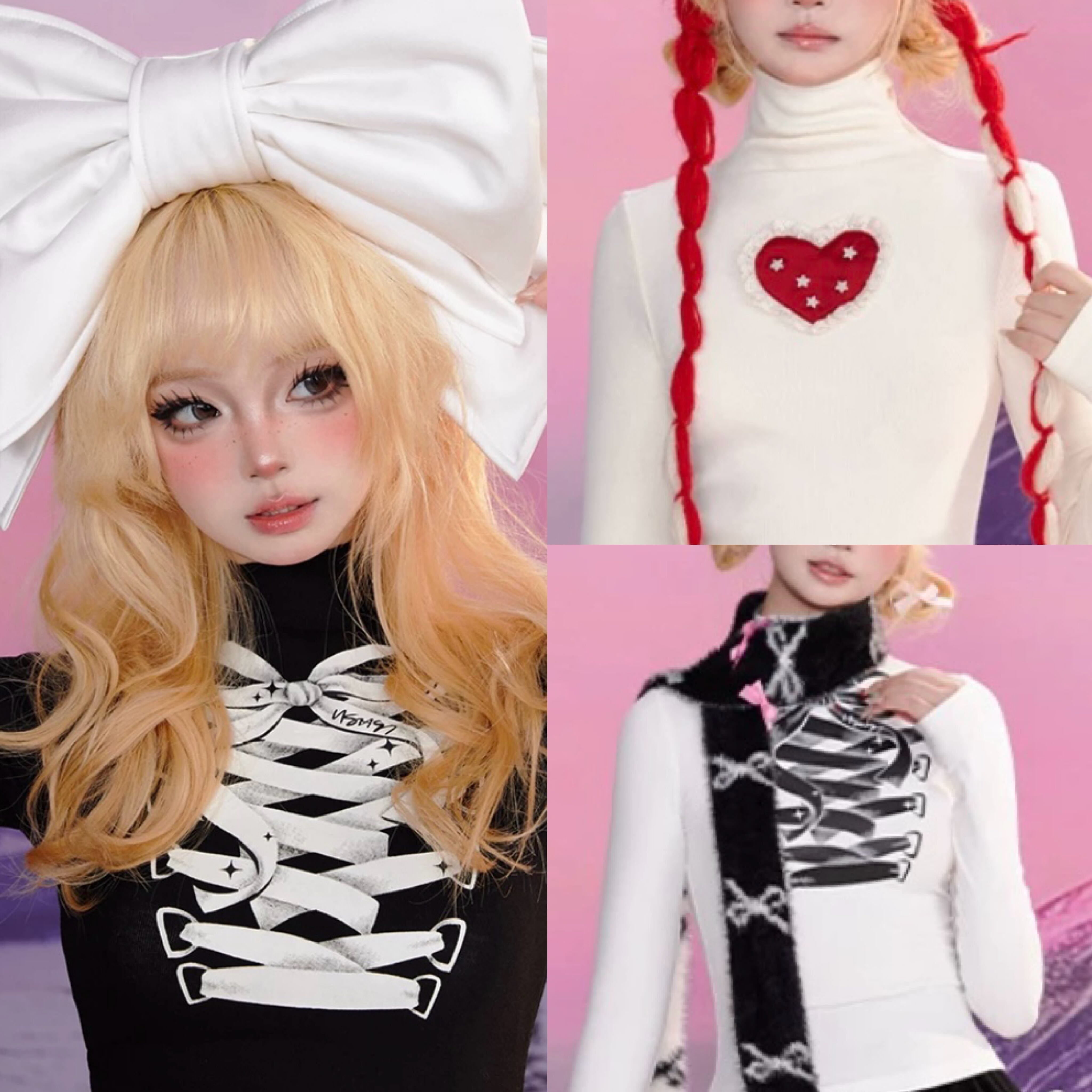 トップス、ハイネック リボン、赤 白 黒 ハート かわいい ブラウス、セーター、カーディガン 姫 原宿