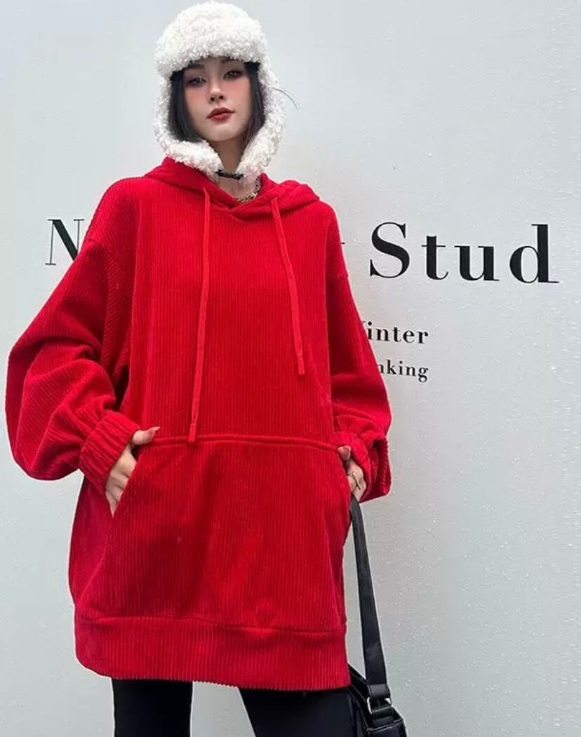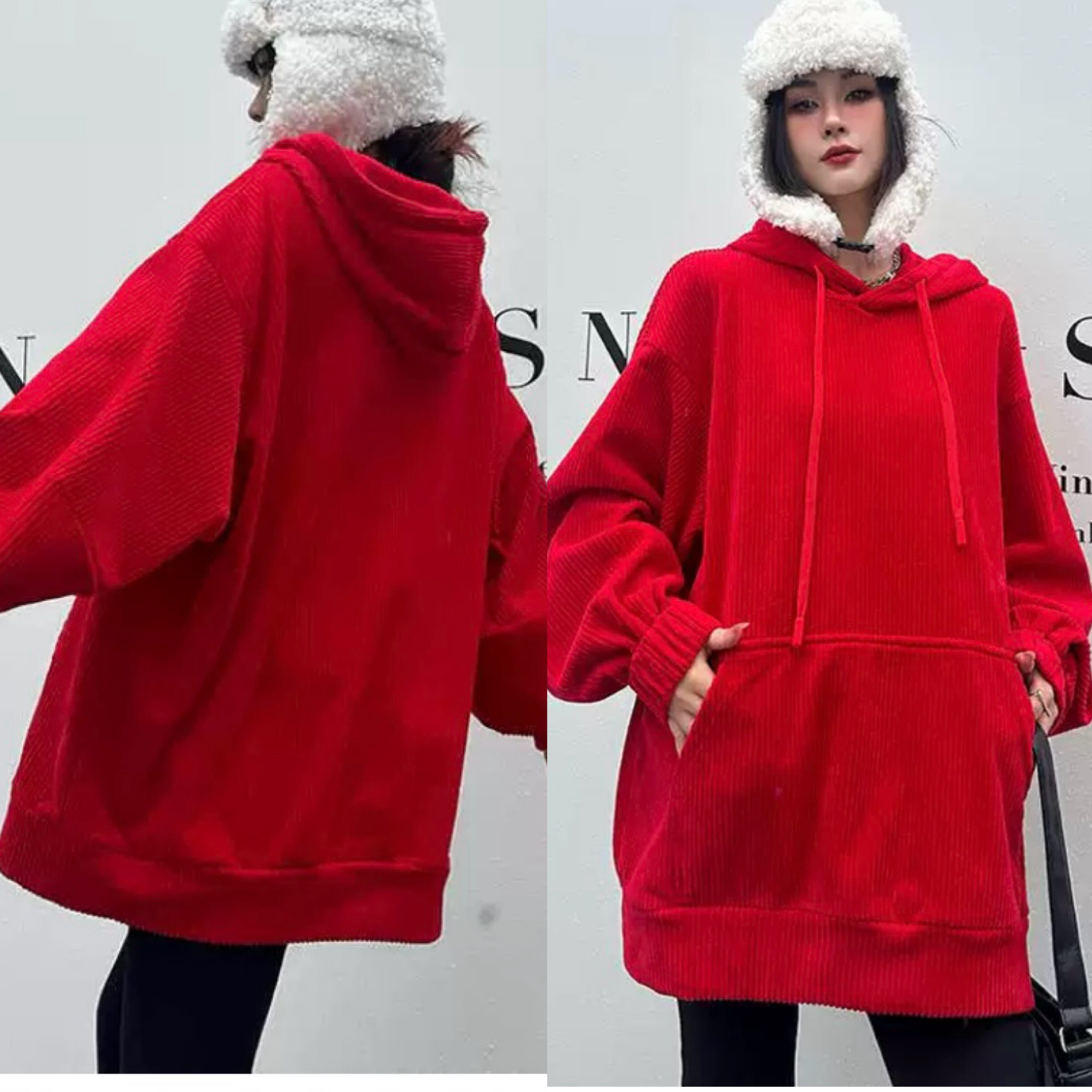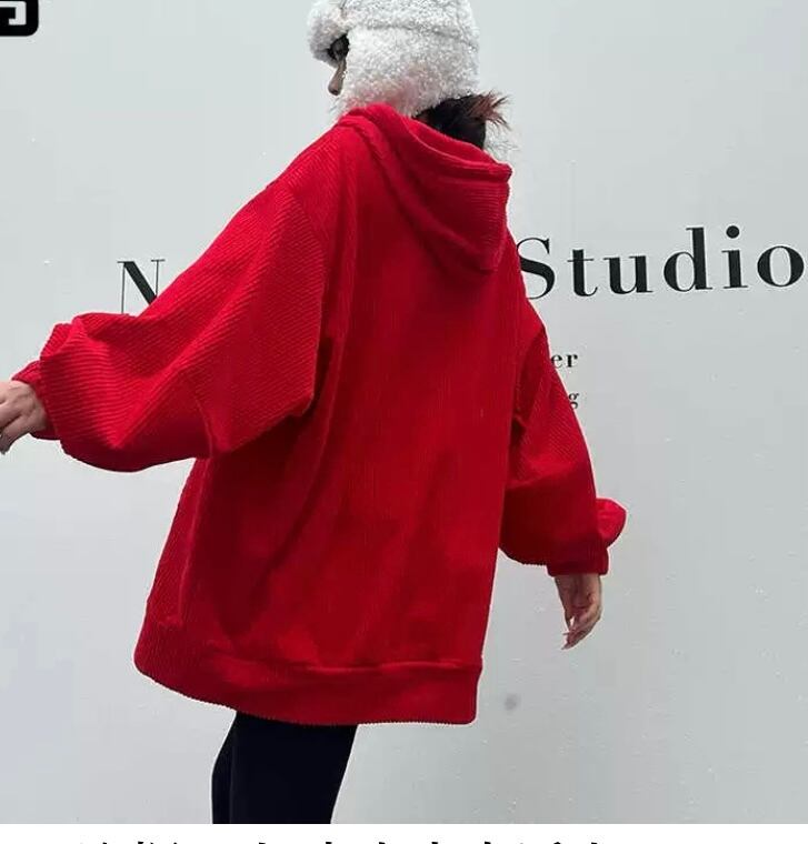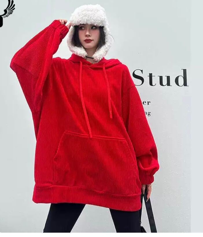赤 コーデュロイ パーカー フード 暖かい ピンク スウェット トレーナー ワンピース、ゆったり ストリート、原宿 カジュアル XL オーバーサイズ カジュアル ブラウス XL ワンピース
