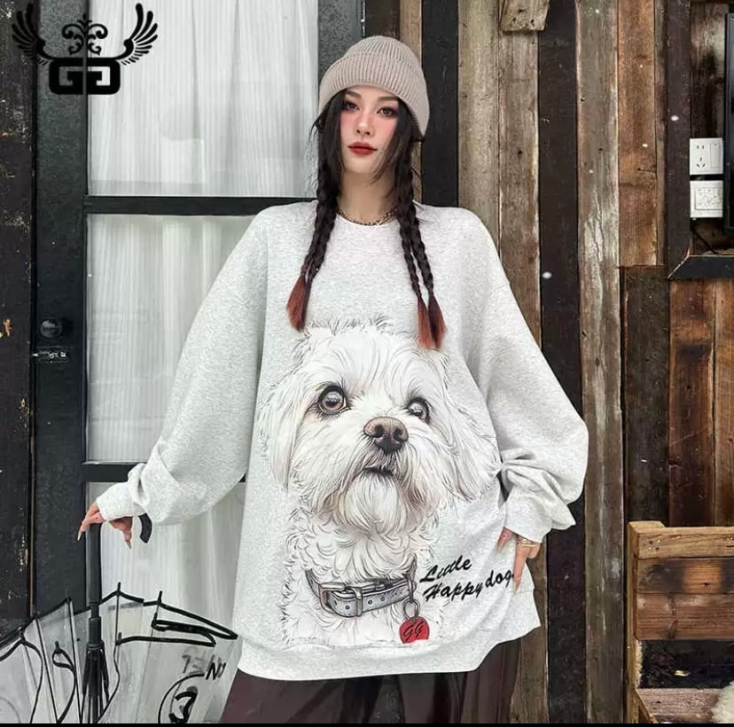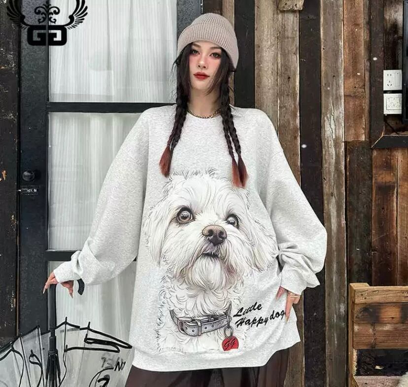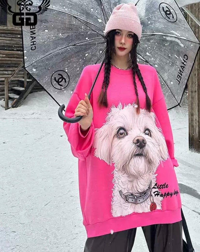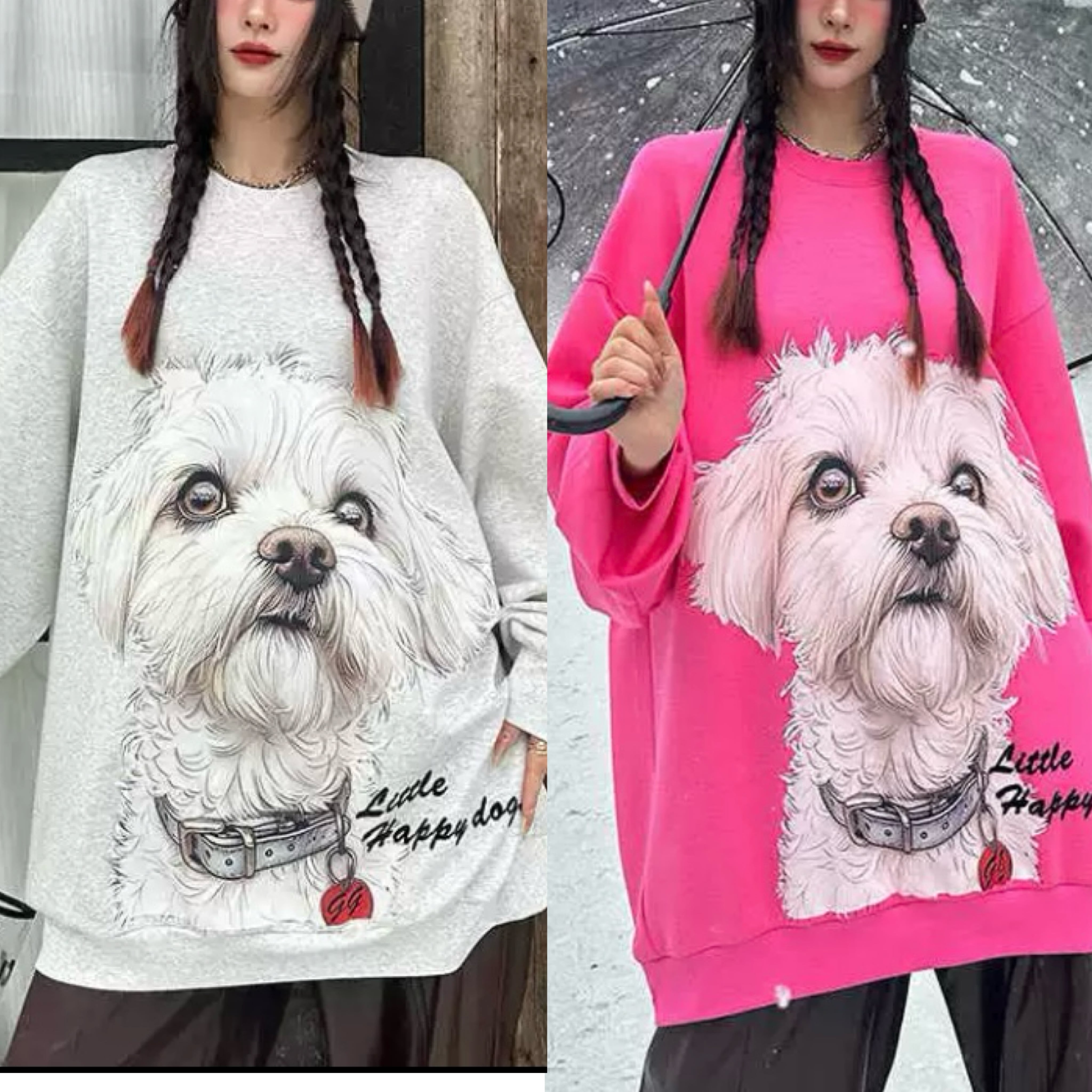 ヨークシャテリア、犬 ピンク 白 ピンク スウェット トレーナー ワンピース、ゆったり ストリート、原宿 カジュアル XL オーバーサイズ カジュアル ブラウス XL ワンピース ペット 犬