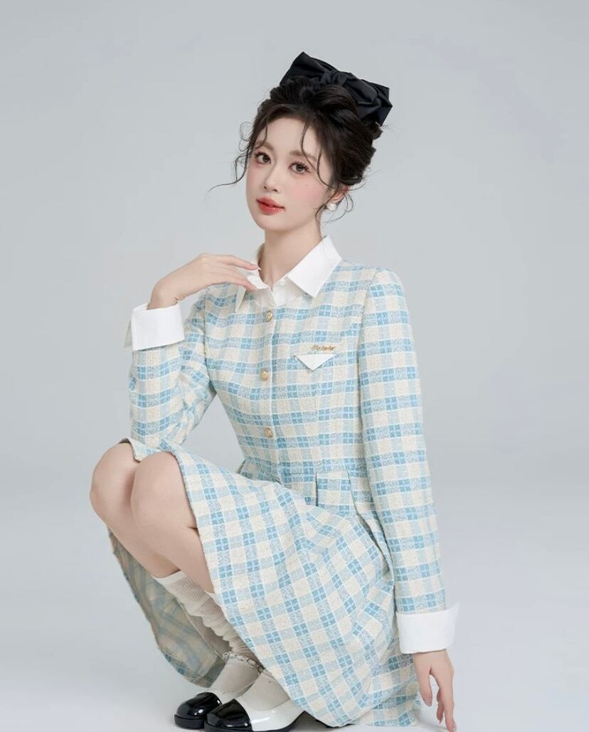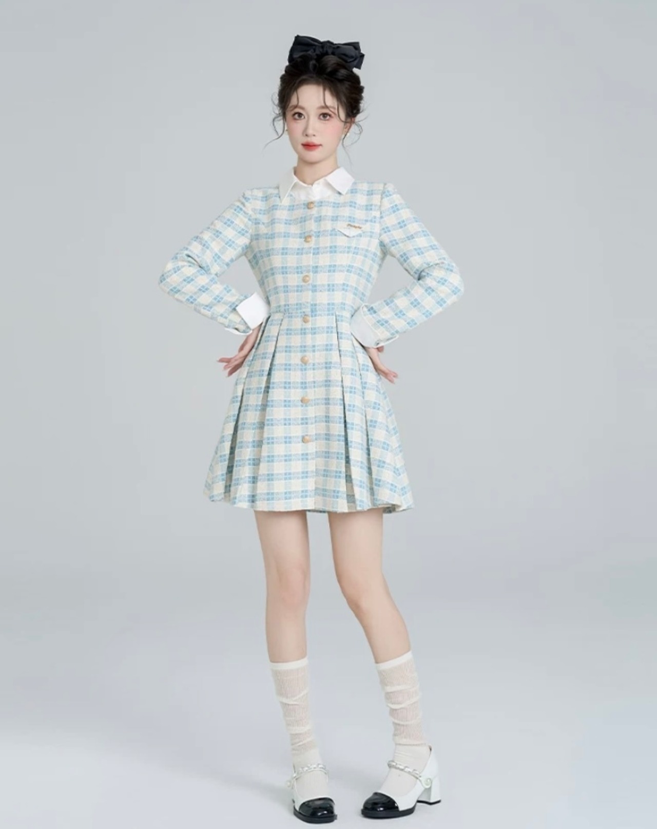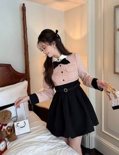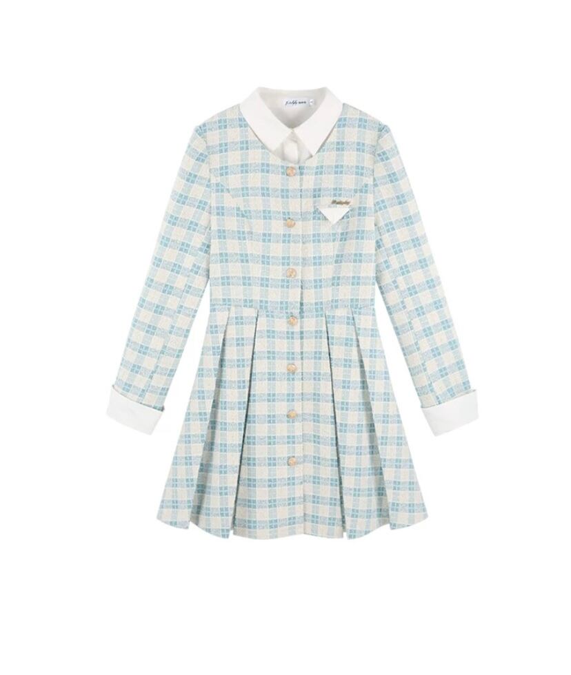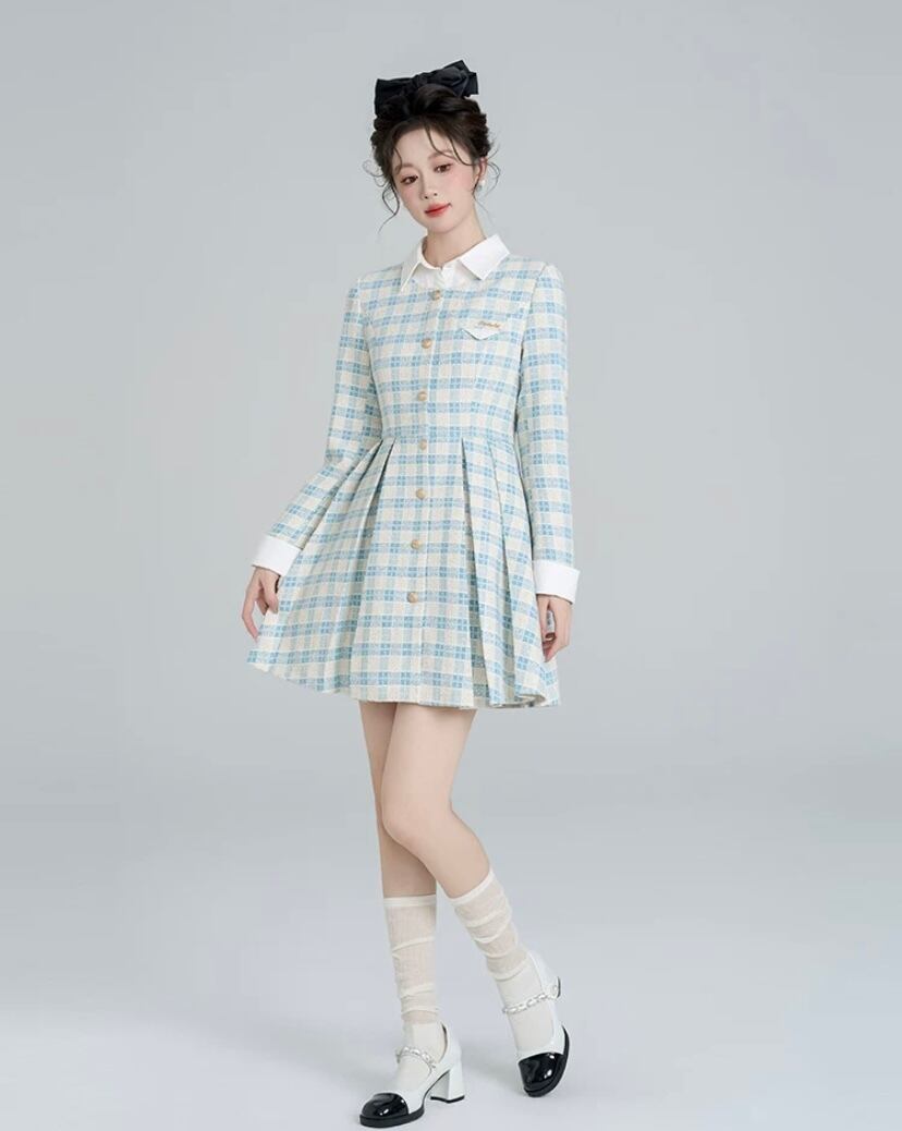水色 チェック ピンク 黒 リボン ガーリー お嬢様 ワンピース エレガント