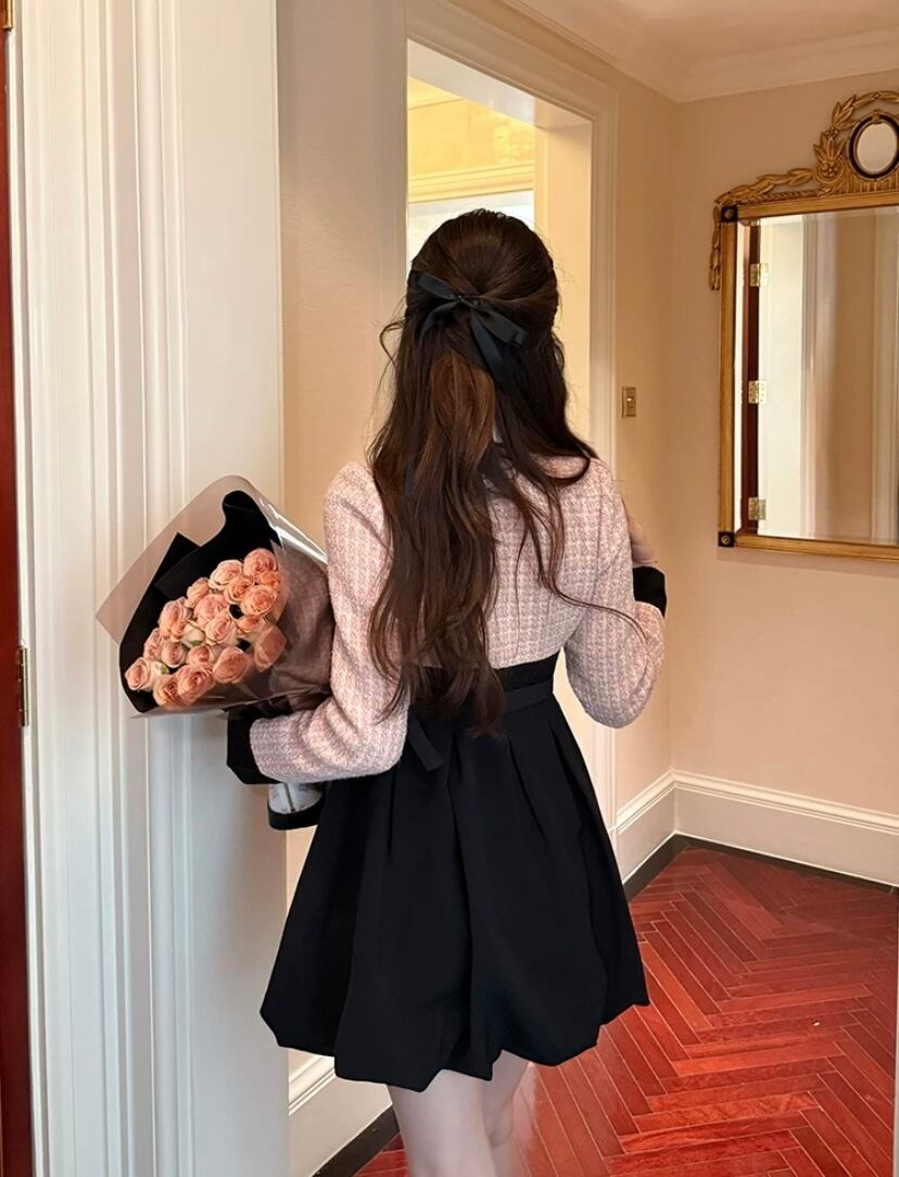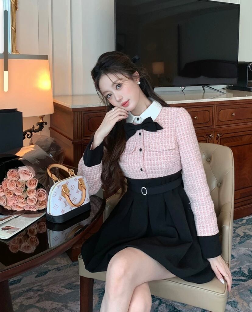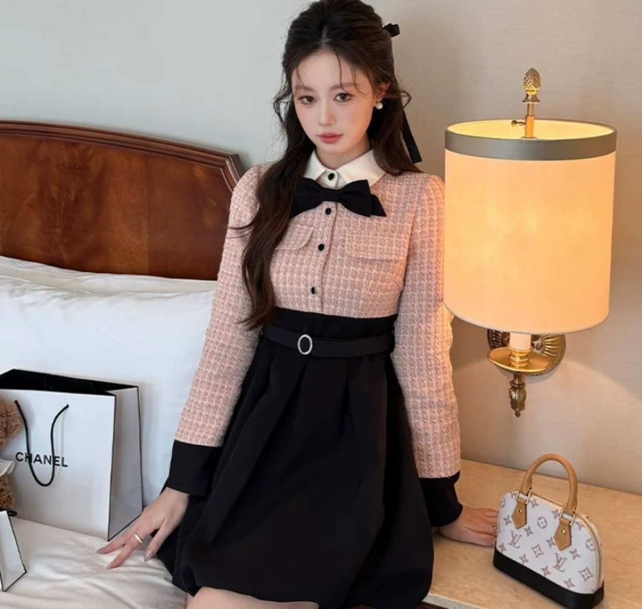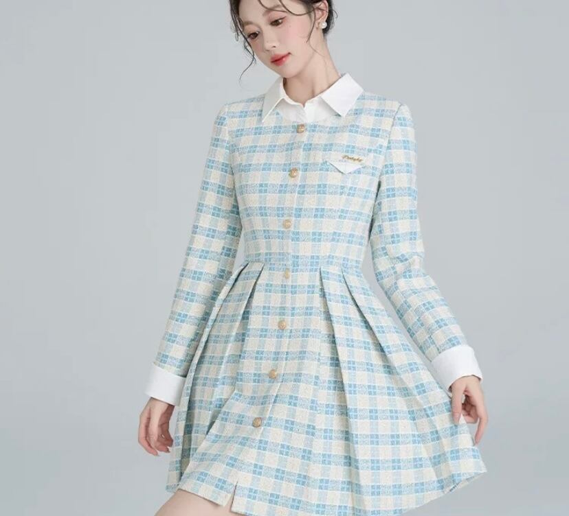 水色 チェック ピンク 黒 リボン ガーリー お嬢様 ワンピース エレガント