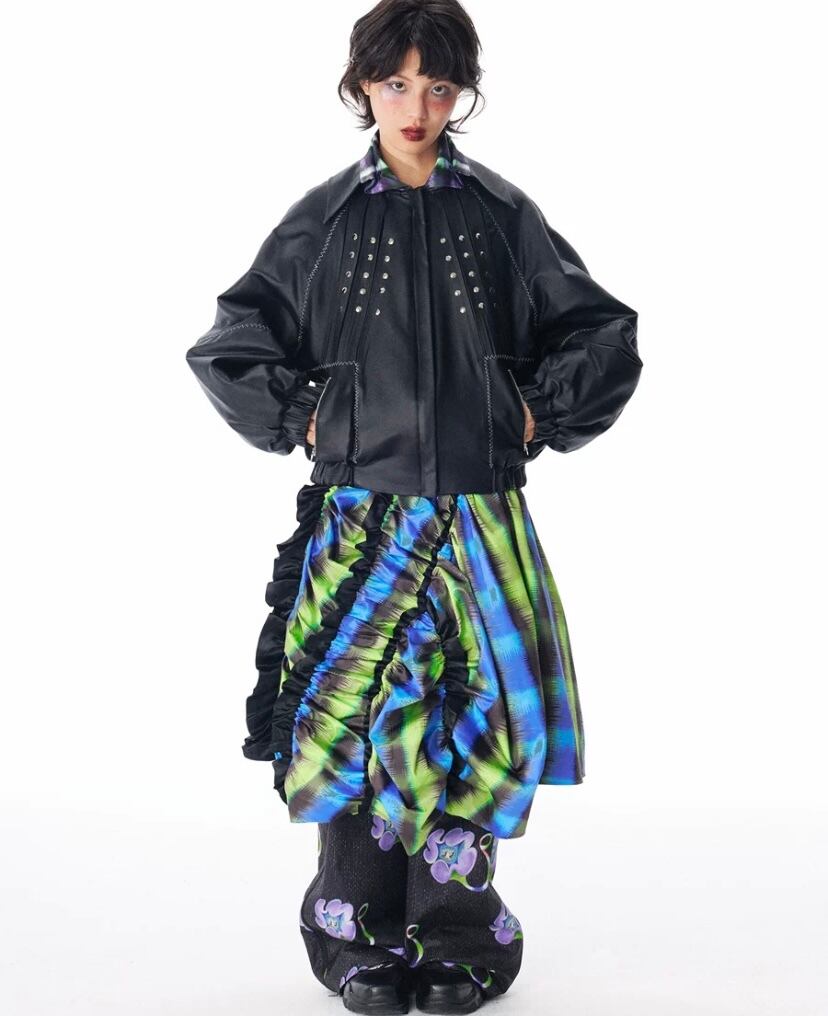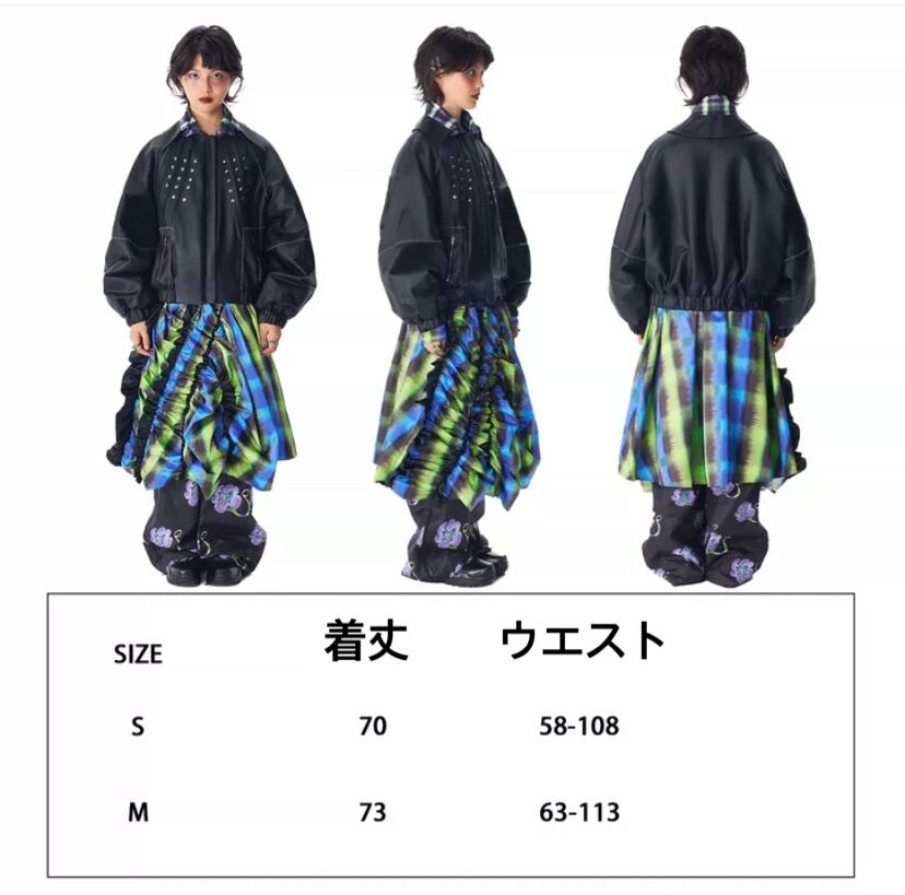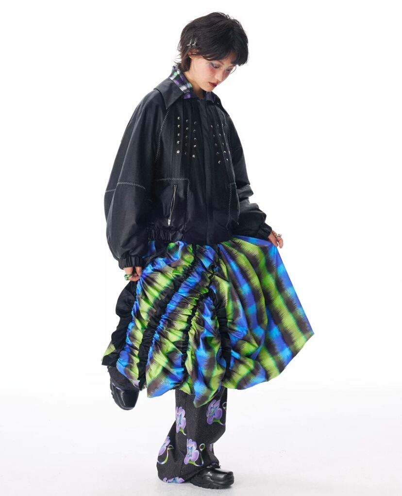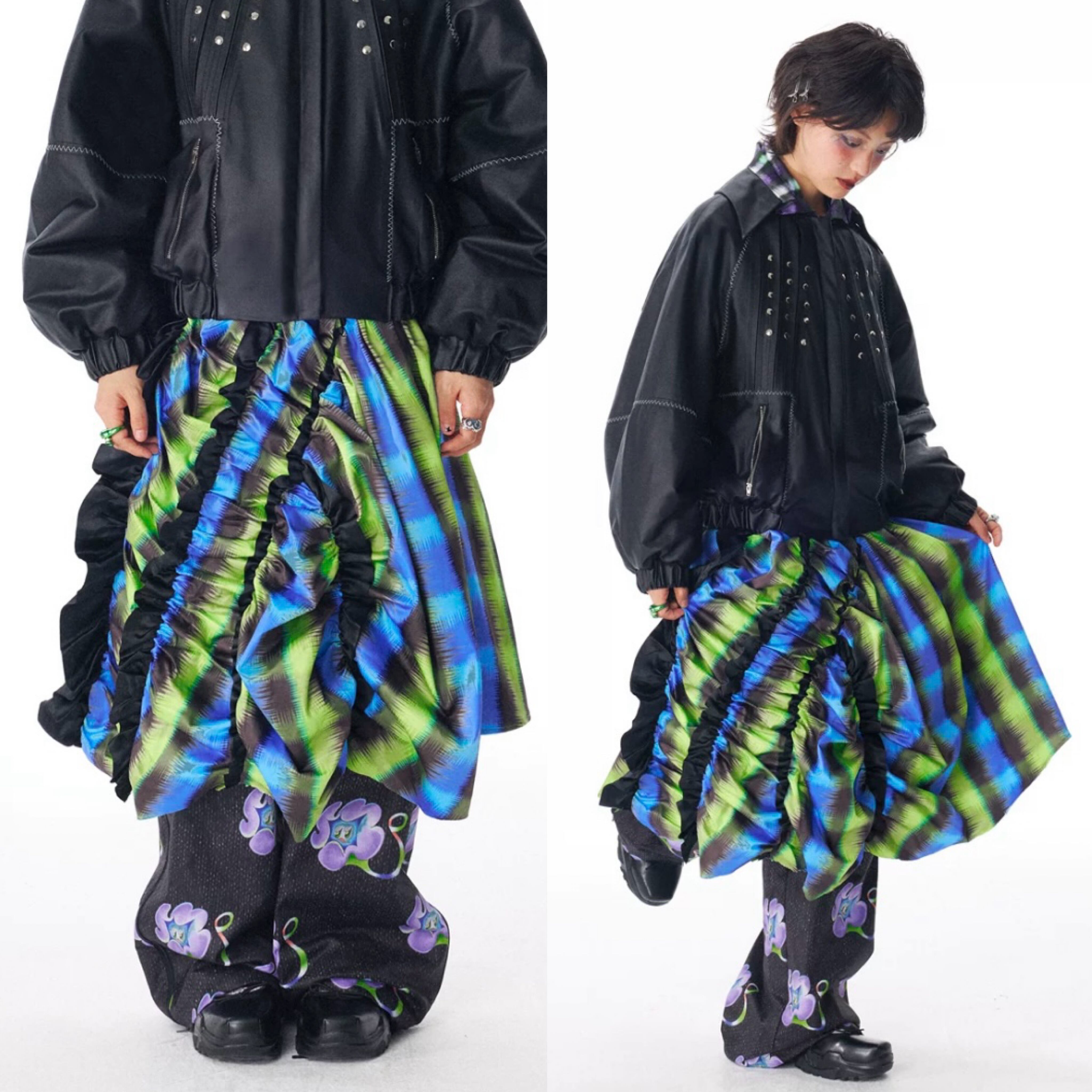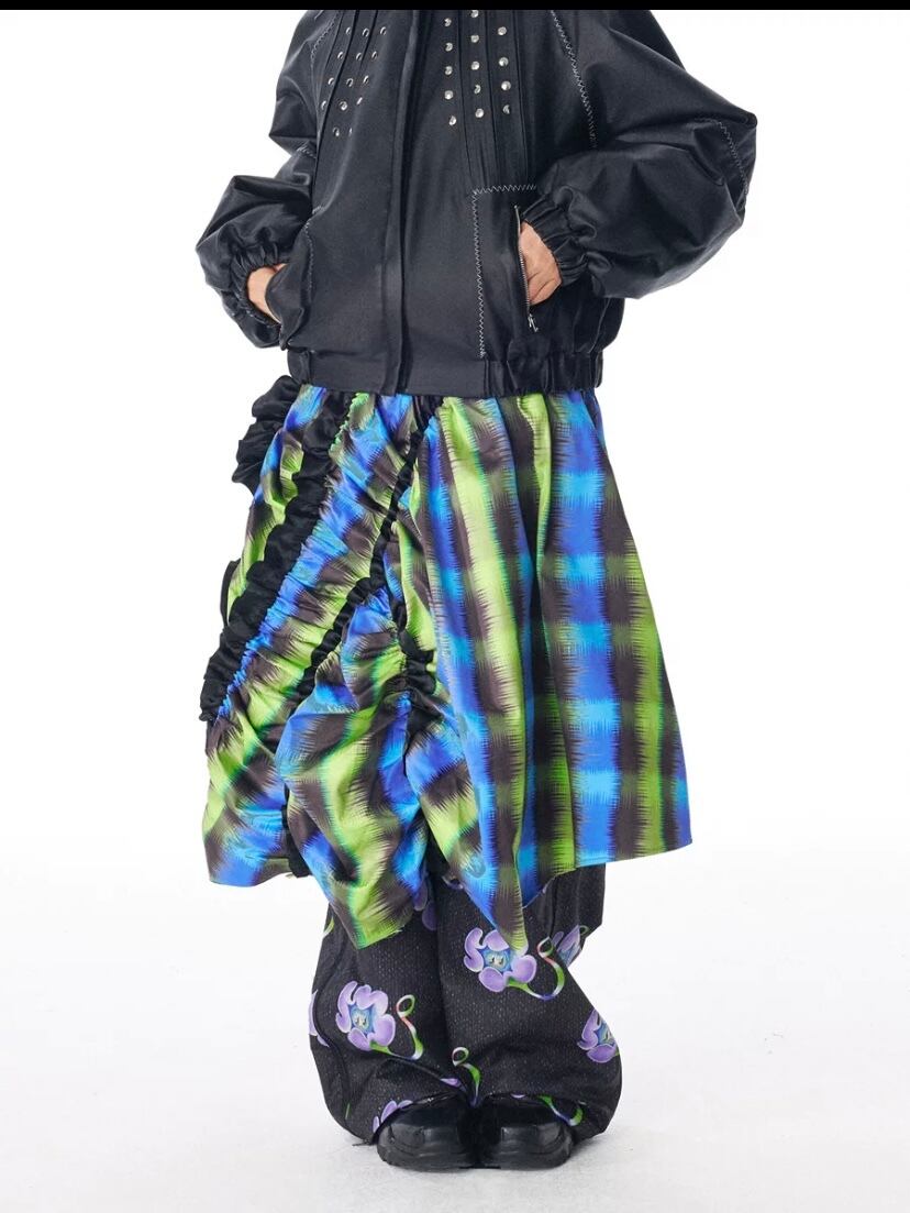 水色 緑 チェック グラデーション バルーン スカート マキシ ロング バルーン ボトムス 原宿 サイバー